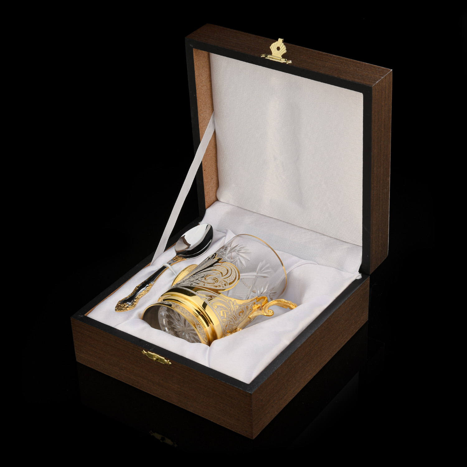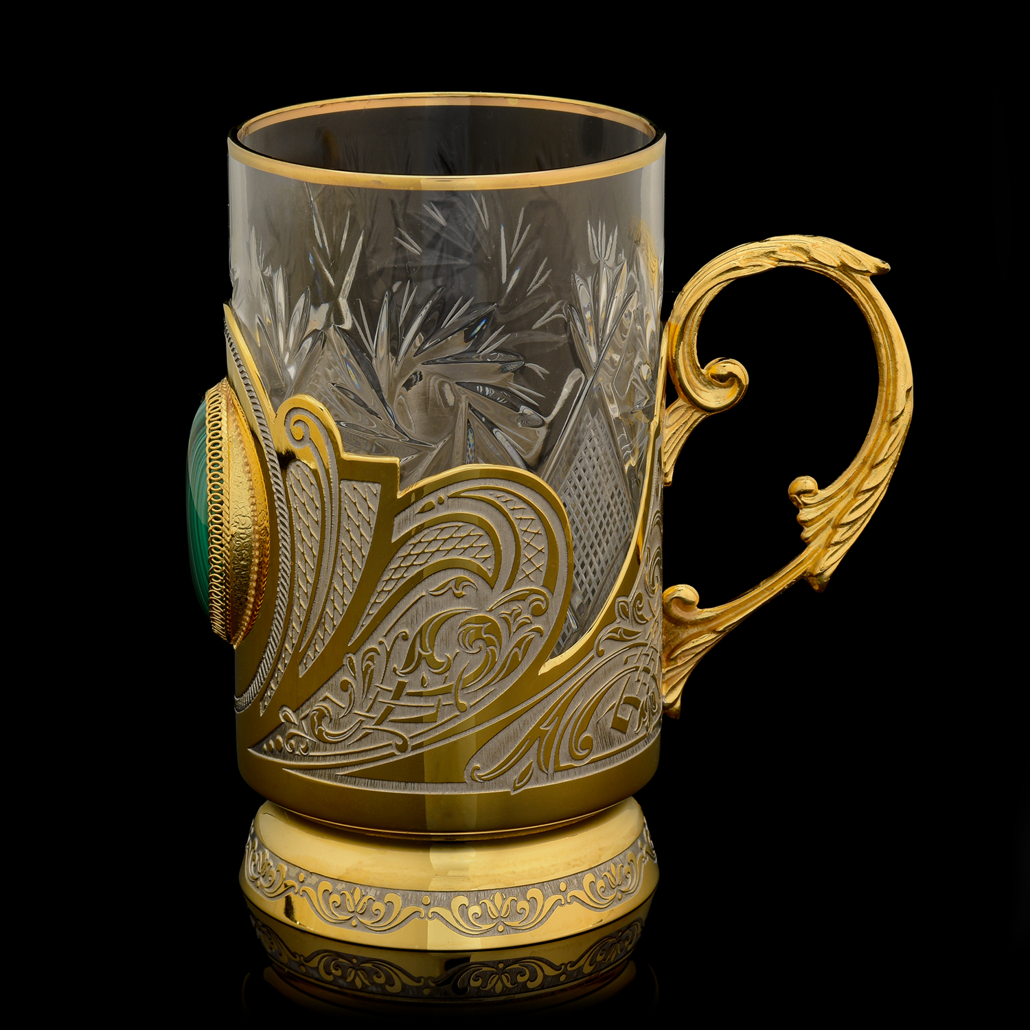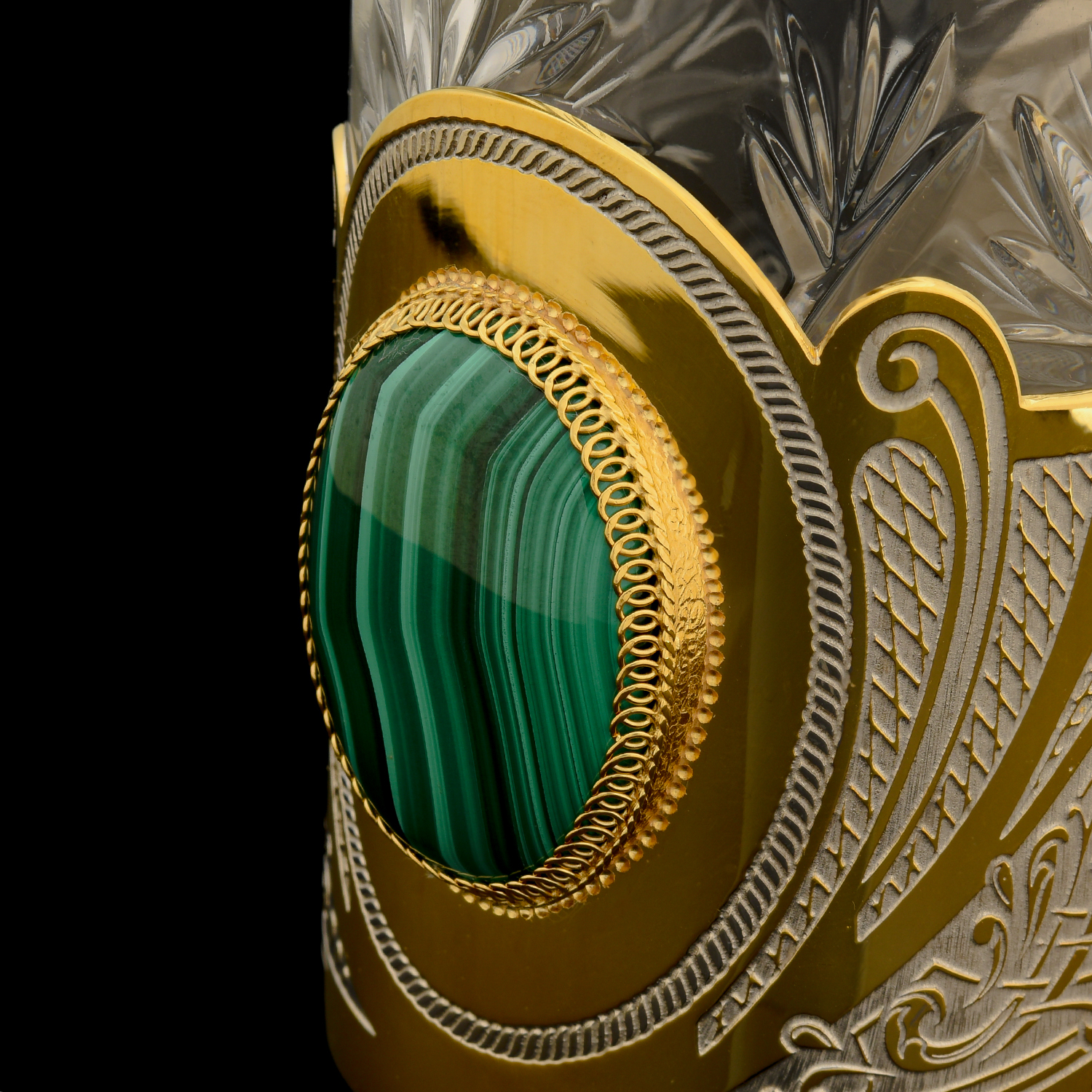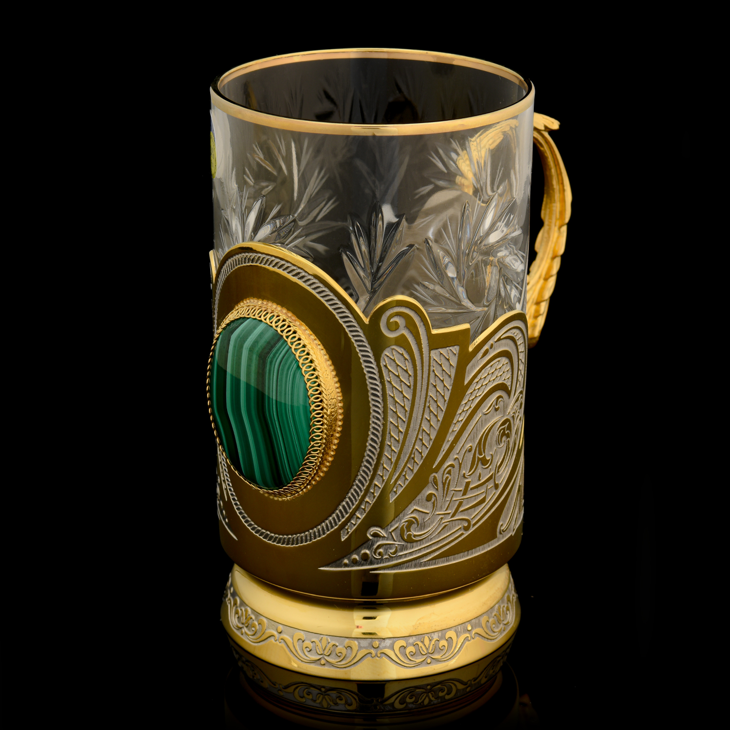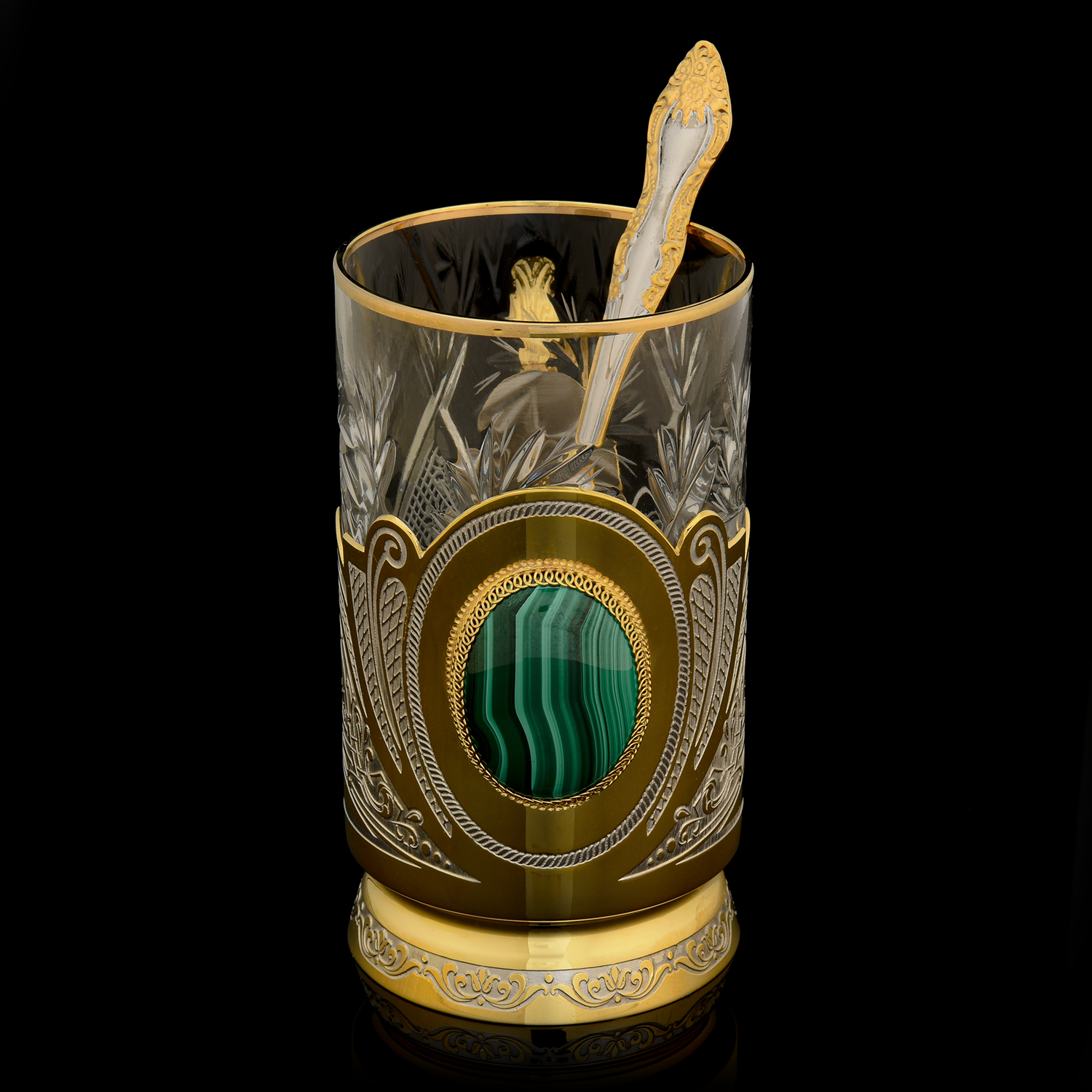 Подстаканник "Малахитовый". Златоуст.Материалы: латунь, никель, золото 999,9*, стекло, малахит.