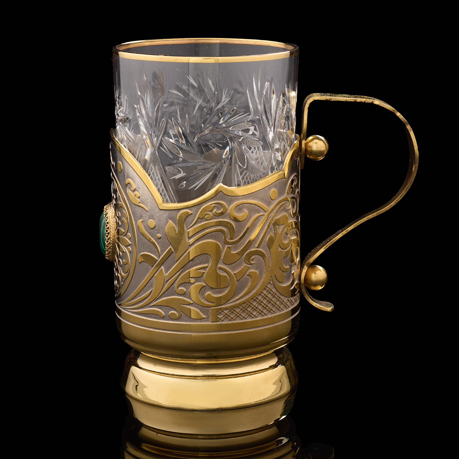 Подстаканник с позолотой и малахитом. Златоуст.Материалы: латунь, никель, золото 999,9*, малахит, хрусталь.