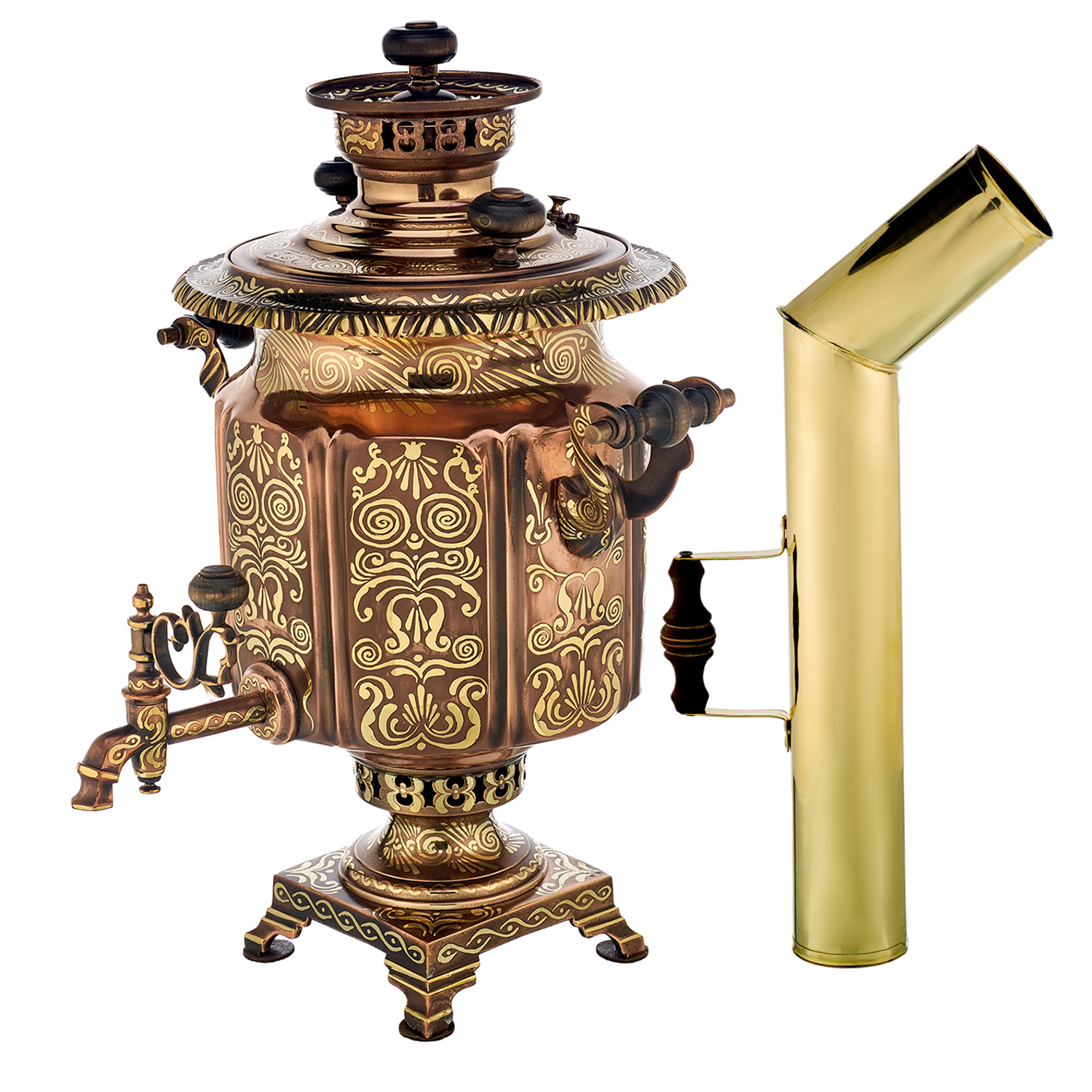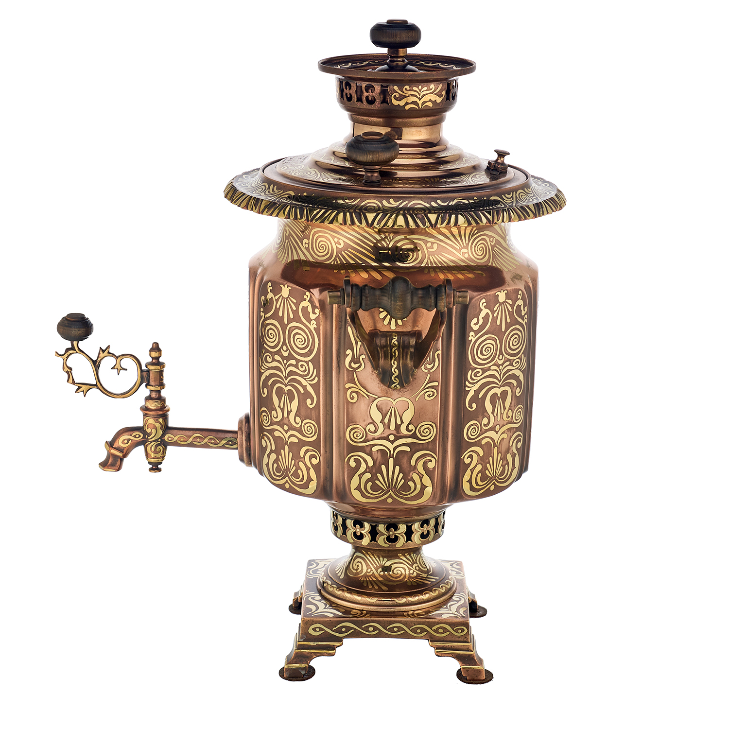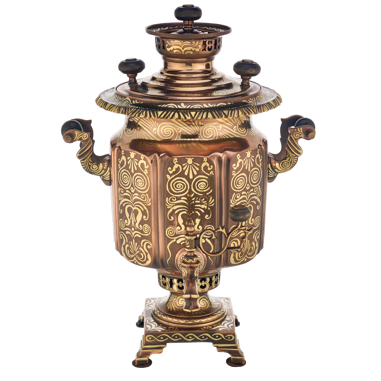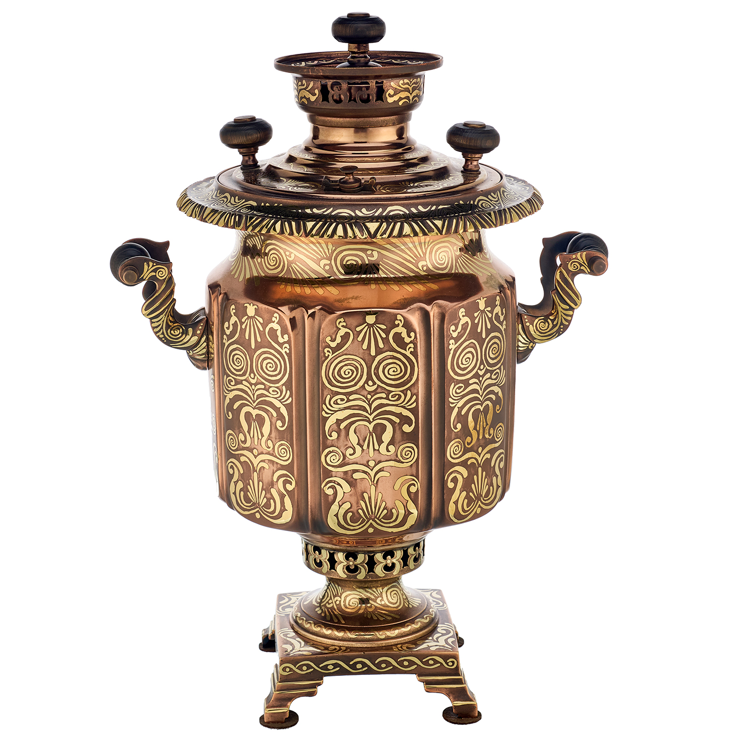 Самовар Тейле жаровой 6 л с орнаментом.Материалы: латунь, патина, золочение.
