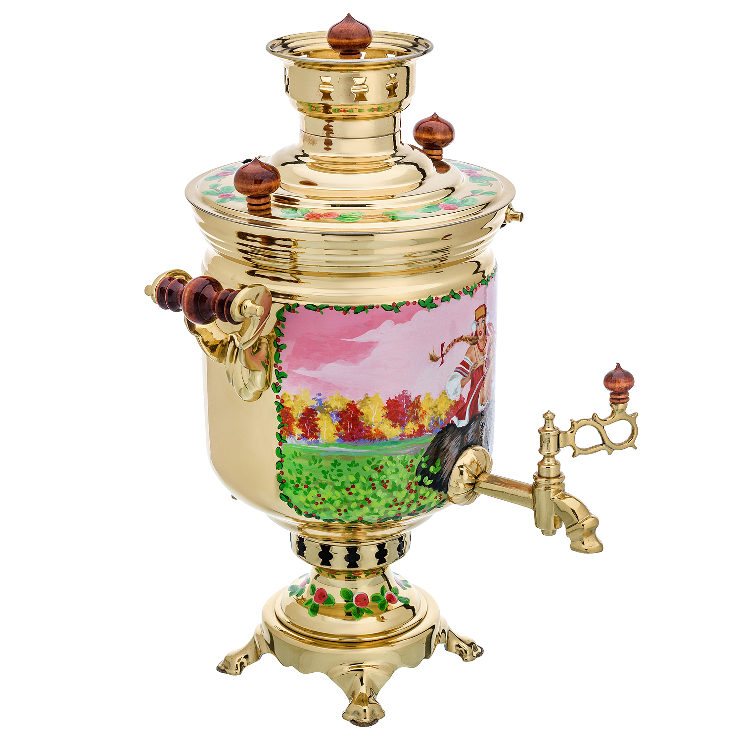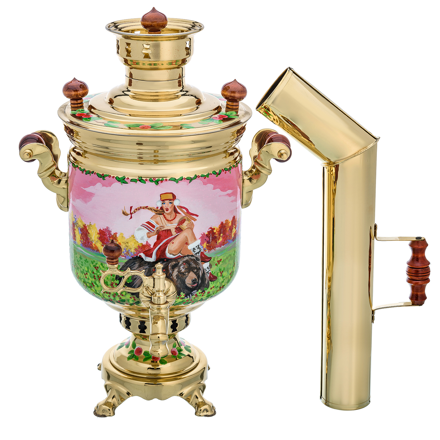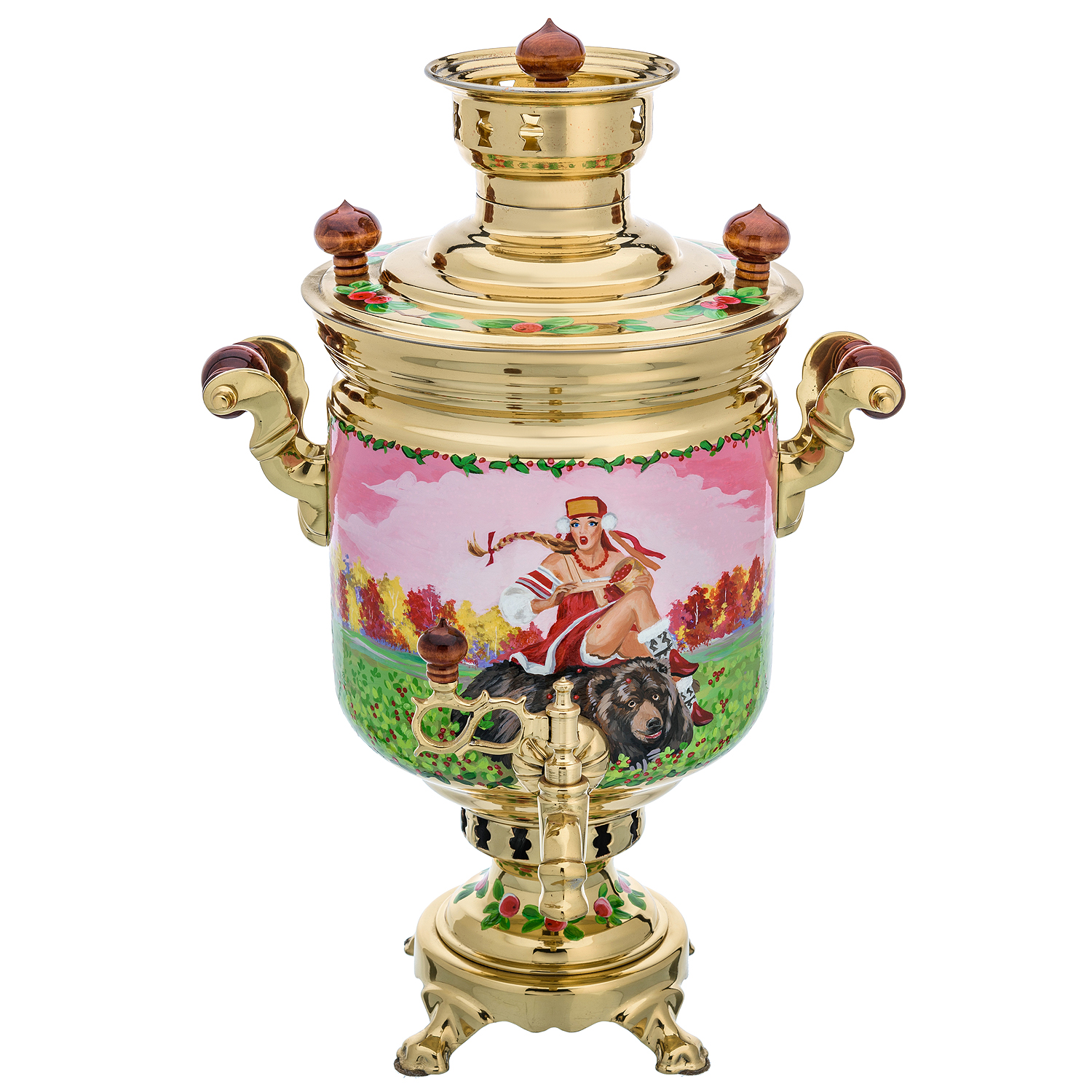 Самовар комбинированный латунный 5 л "Девушка с медведем". Форма Банка
