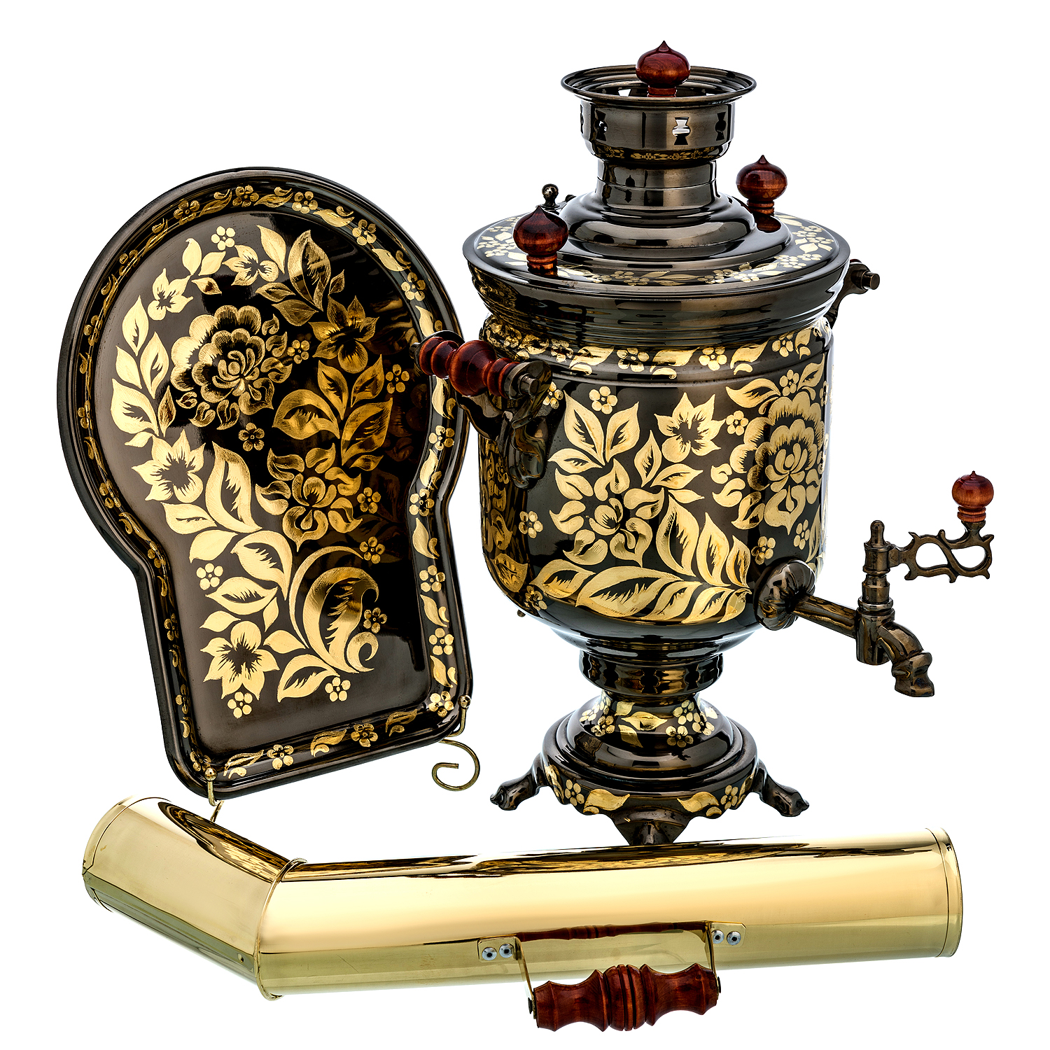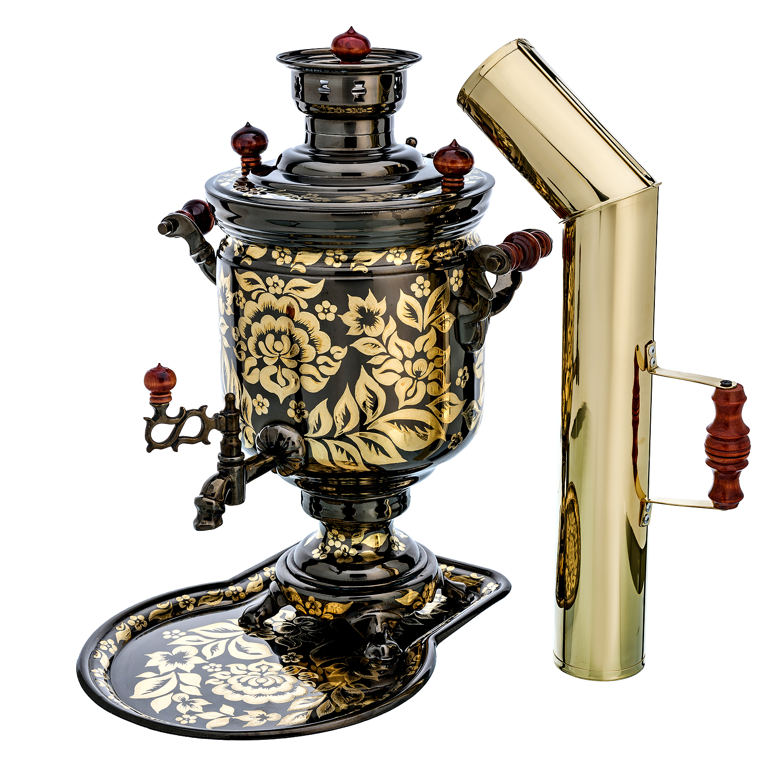Самовар комбинированный латунный в черном никеле, толстостенный, с ручной гравировкой, 5 литров.Поднос малой формы "замочная скважина", латунный в черном никеле, с ручной гравировкой.