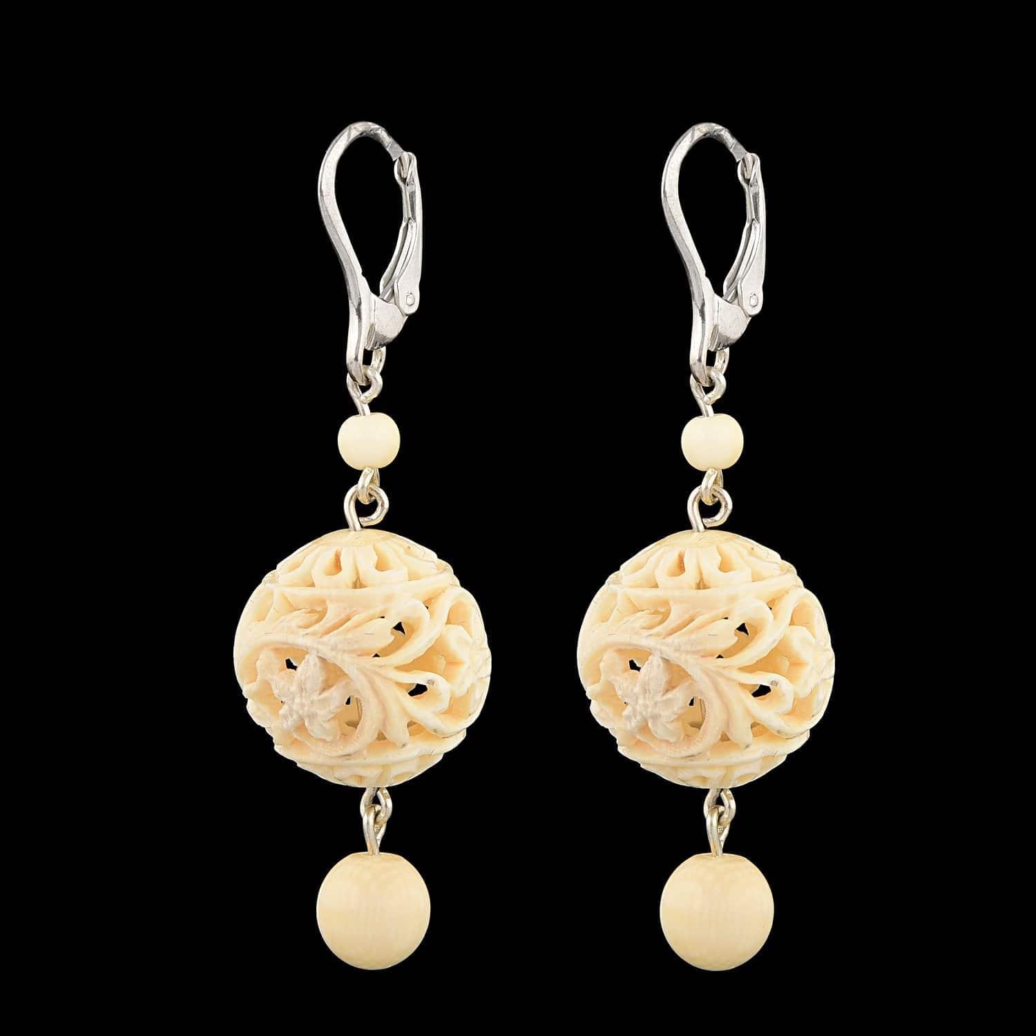 Пара серег с динамичными подвесками, зрительно удлиняющие овал лица, являются штучным дизайнерским украшением в русском стиле. Серьги сложены из элементов, представляющих собой образцы резьбы по кости.