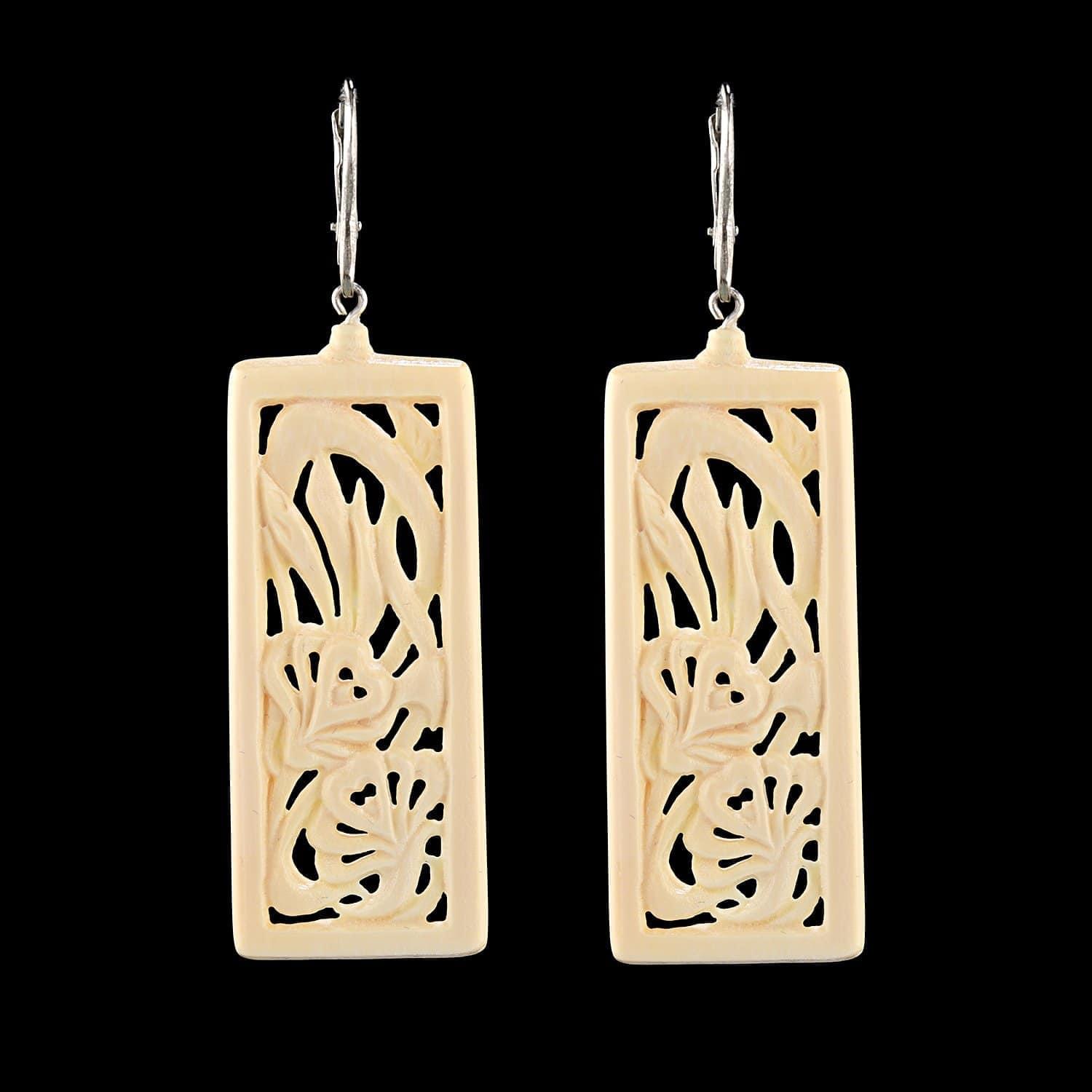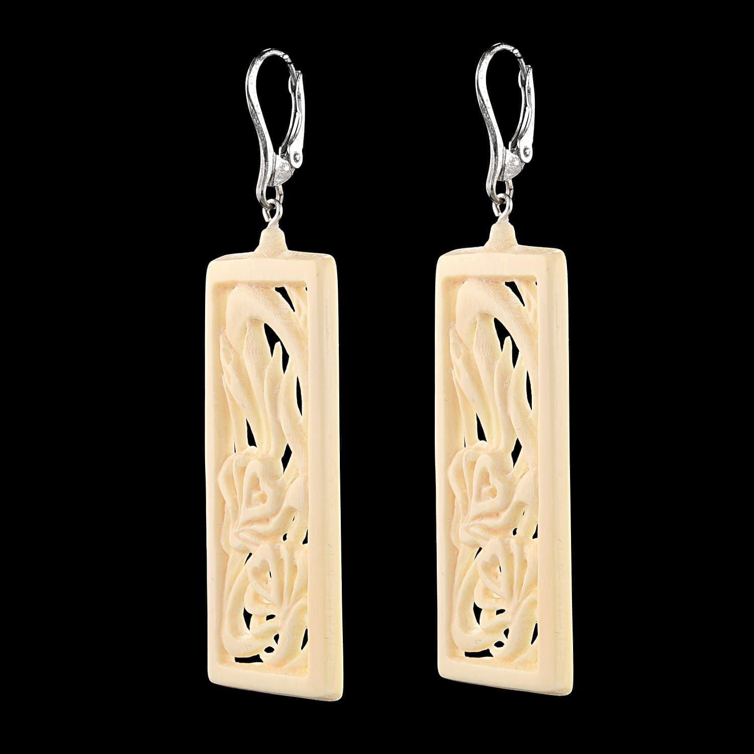 Пара серег с динамичными подвесками, зрительно удлиняющие овал лица, являются штучным дизайнерским украшением в русском стиле. Подвески серег прямоугольной формы представляют собой авторские образцы резьбы по кости с обережным прорезным орнаментом в старорусском стиле...