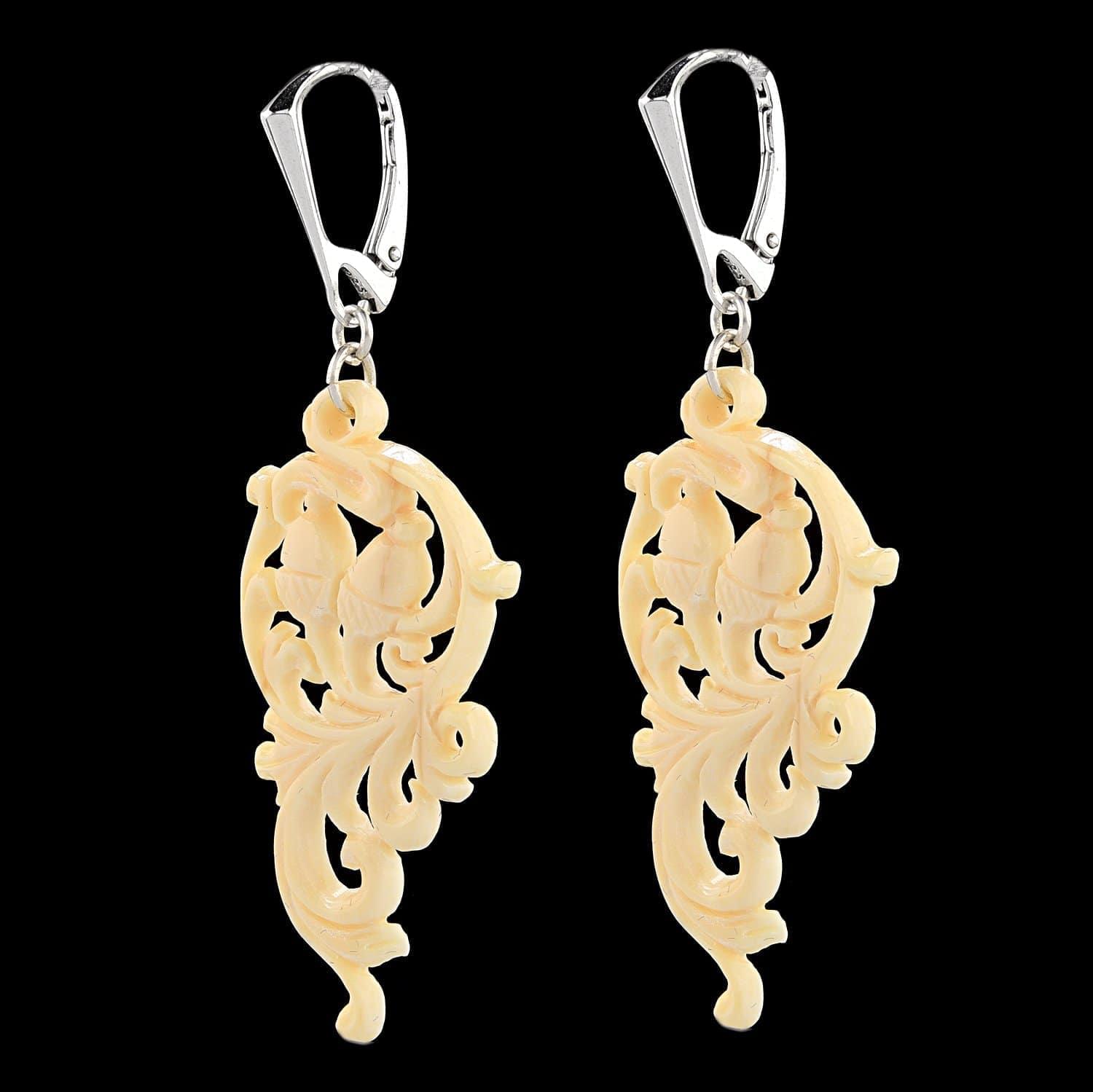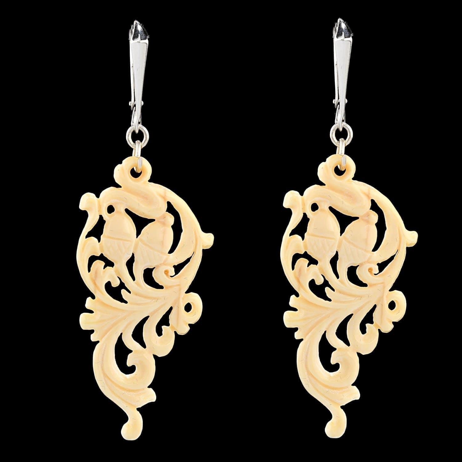 Украшения из кости млекопитающего, исчезнувшего с лица Земли около 9000 лет тому назад, - это предметы силы для обладательницы. Согласно поверьям жителей тундры, оленеводам и рыбакам, украшения из бивня мамонтов передают обладателям силу животного и его энергию. Каждый элемент предлагаемых сережек скрупулезно оформлен мастером-камнерезом в технике сквозной резьбы, затем частично выбелен и отшлифован. Желудь - символ плодородия и здоровья - выступает в качестве лейтмотива в растительной композиции на каждом элементе... ....