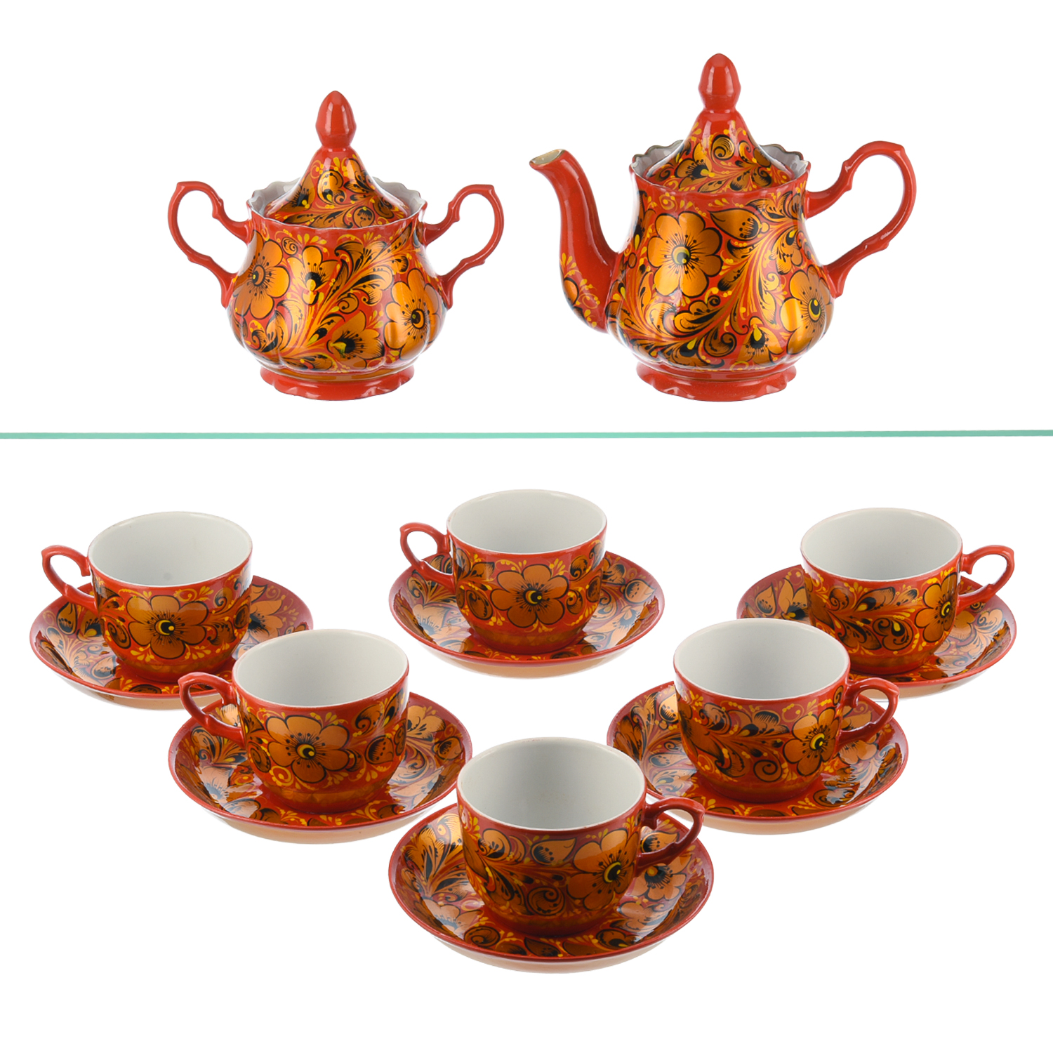 Чайный сервиз на 6 персон "Кудрина на красном". Хохлома