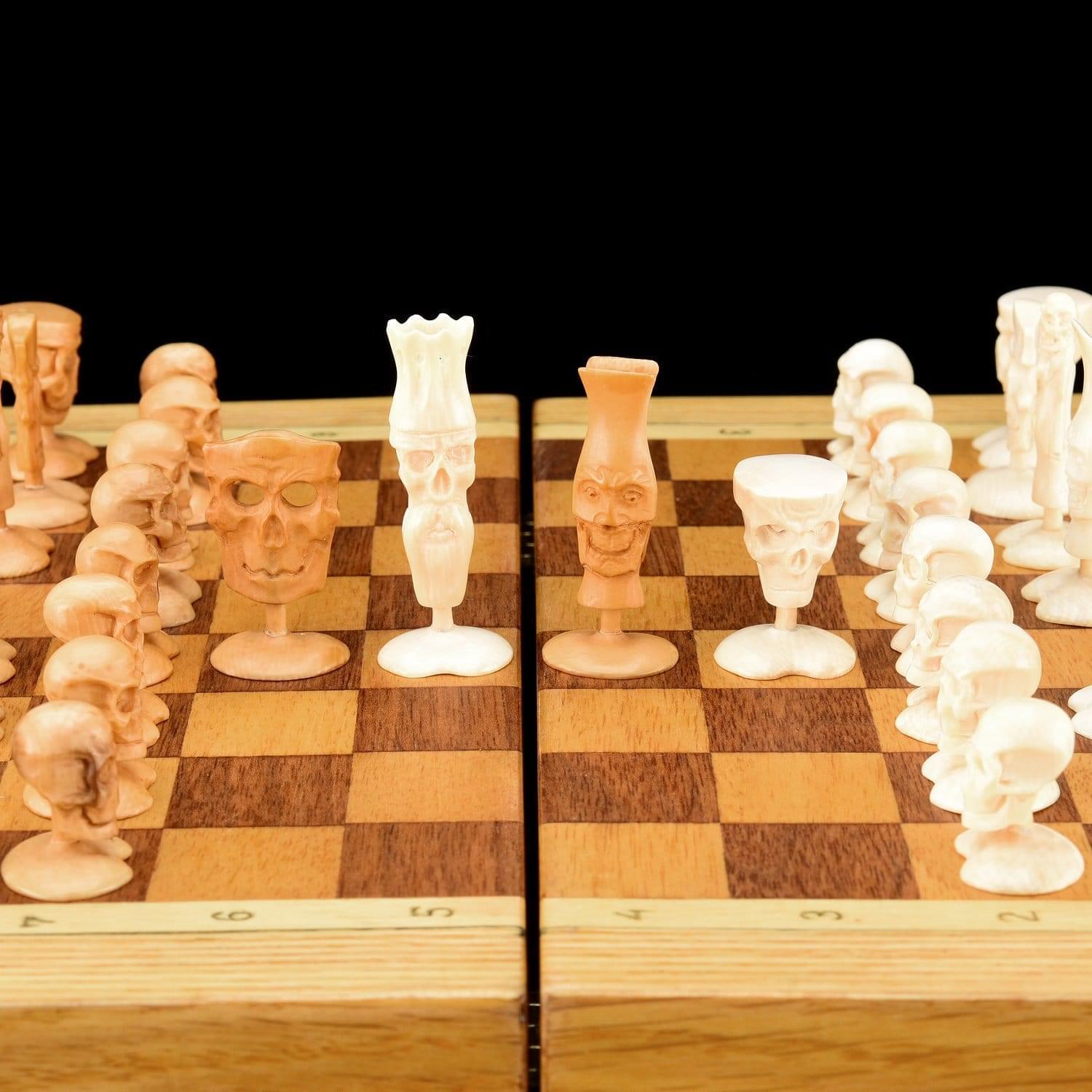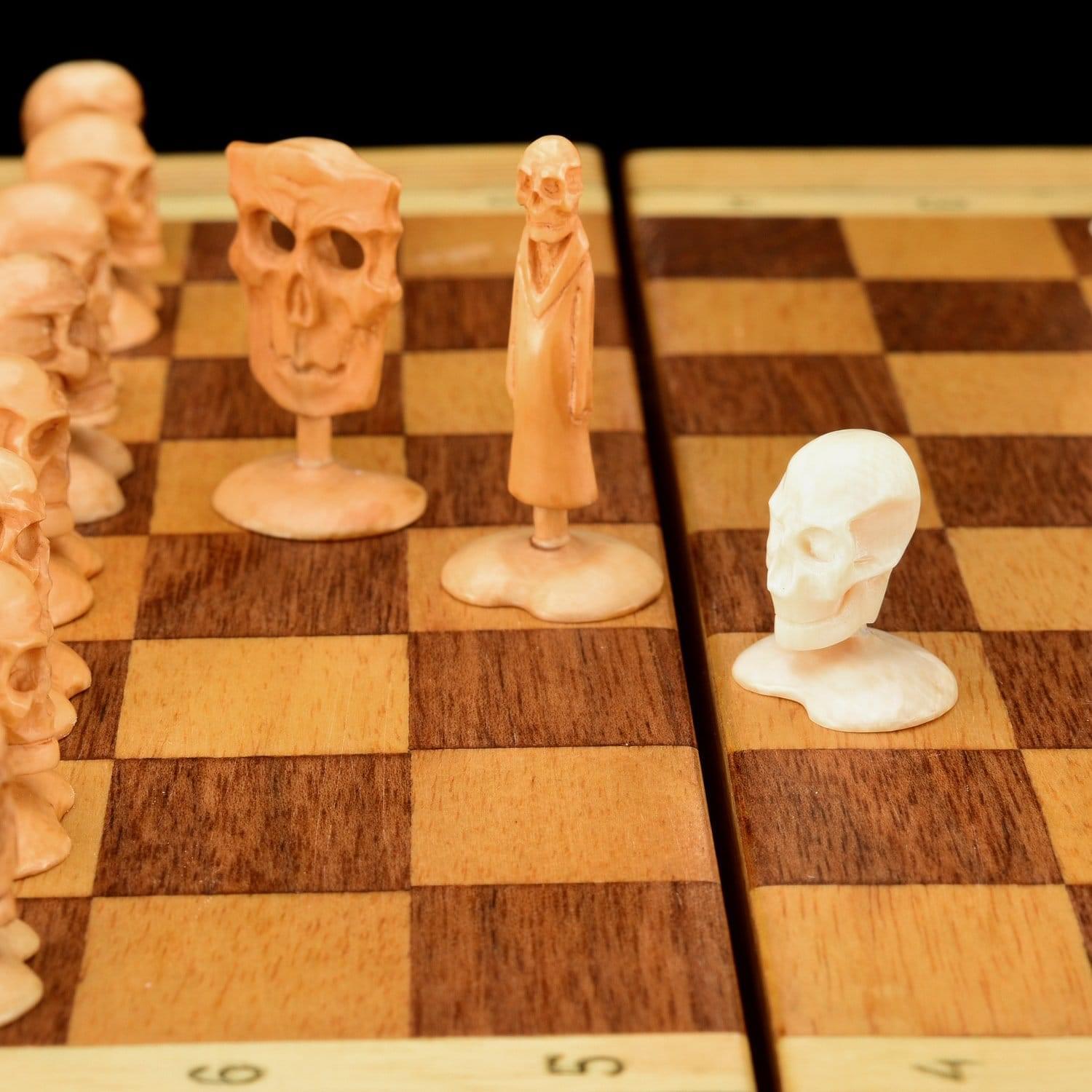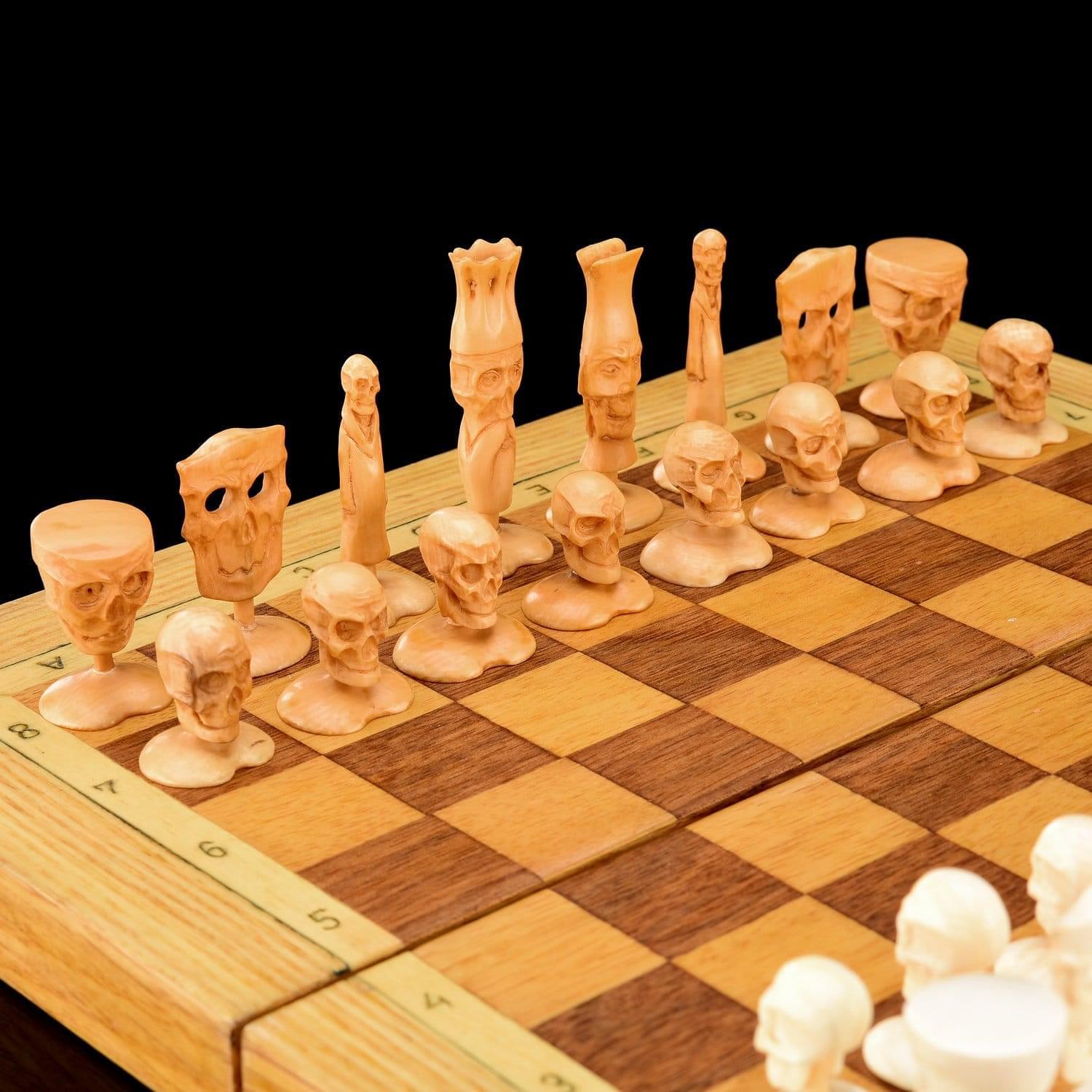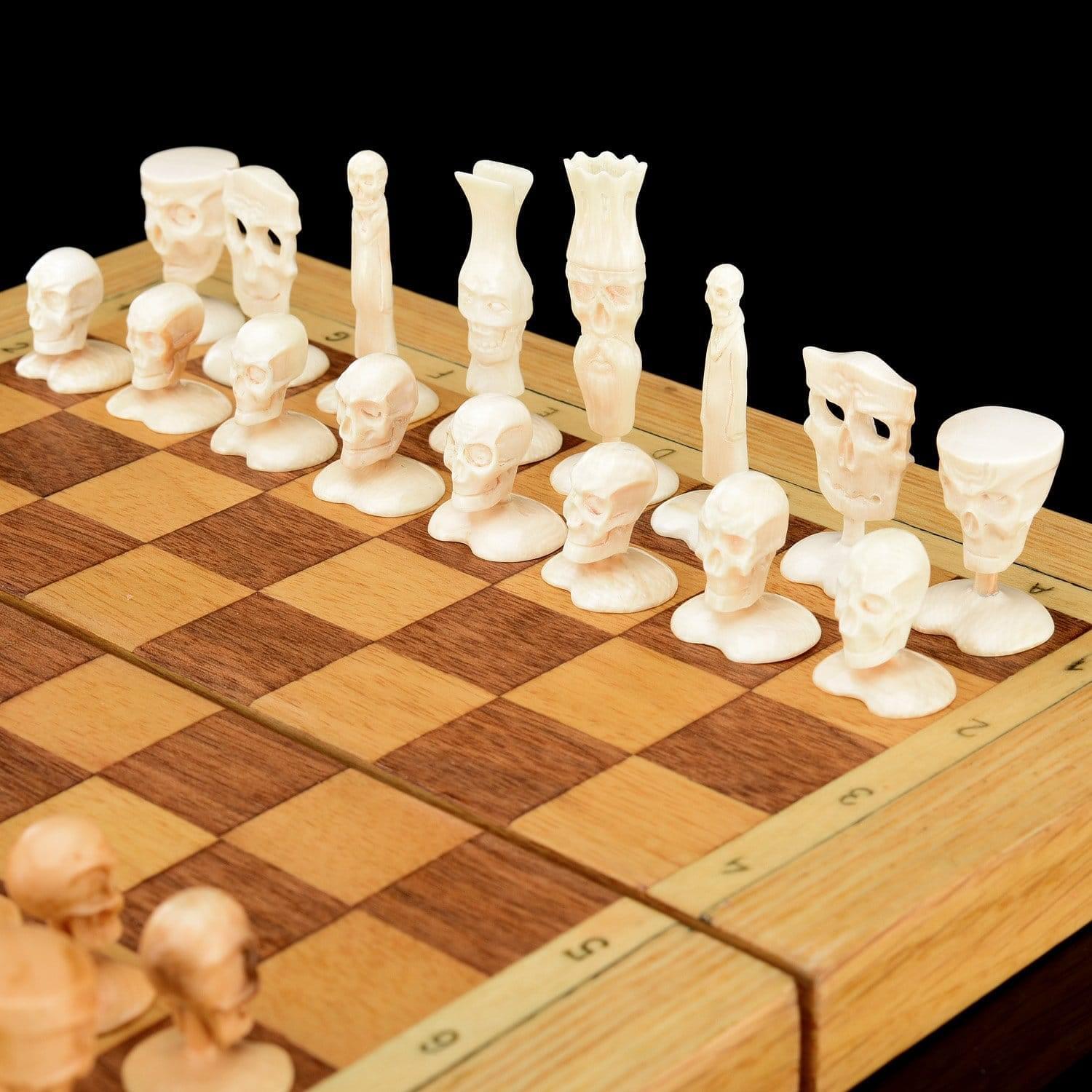 Пешки и другие фигуры выполнены в виде черепов. Ферзи представляют статуэтки мертвецов, привидений. Шахматы с дизайнерскими фигурами из бивня мамонта являются уникальным экспонатом, образцами косторезного промысла Севера России. Бивень мамонта найден на берегу Иртыша. Возле этой реки под землей хранятся бивни с незапамятных времен. Мамонты вымерли больше 9000 лет назад. Цены на бивни колеблются от тысячи долларов. Изделия из бивней коллекционируют во всем мире. На Руси считалось, что кость мамонта передает человеку силу и энергию этого «царя зверей». Именно мамонта так называли у нас, а не льва. Шахматам приписывают мистические свойства, веря в их способность менять человеческие судьбы. За 1,5 тысячи лет существования игры сотни игроков стали гроссмейстерами, тысячи – мастерам спорта, но только 16 – чемпионами. Название «шахматы» происходит от персидских слов «шах» и «мат» («властитель умер», «король в ловушке» или «королю не убежать»). Прародителем игры считается древнеиндийская чатуранга, появившаяся в 6 веке нашей эры и символизировавшая войну. В Древней Индии чатурангой называли войско из боевых колесниц (ратха), слонов (хасти), конницы (ашва) и пеших воинов (падати). Шахматный разум живет и после смерти. В 1985 году за шахматной доской встретились гроссмейстеры Виктор Корчной и Геза Мароци. К дате дебюта Геза Мароци был мертв уже 34 года. В качестве посредника между мастерами выступал медиум Роберт Ролланс, не умевший играть в шахматы. Игра завершилась в 1993 году. Мароци играл хорошо, но сдался на 47-м ходу. Ролланс умер через три недели после завершения игры. .