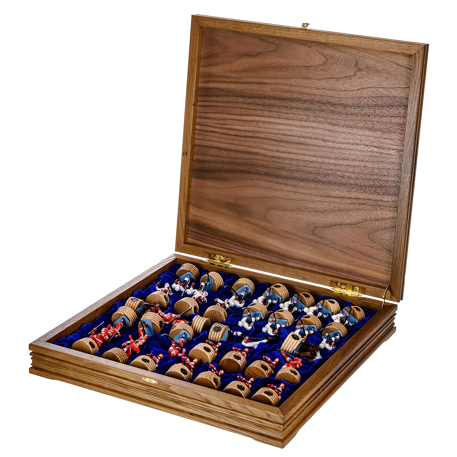 Деревянный шахматный ларец с металлическими фигурами "Хоккей" станет отличным подарком для хоккеиста, хоккейного болельщика или просто человека, неравнодушного к спорту. Внутри подарочных шахмат установлен ложемент с атлассной тканью, каждая фигурка ложится в свою ячейку. Такие эксклюзивные деревянные шахматы непременно являются центровым акцентом интерьера. В нашем интернет магазине Вы можете купить уникальные дорогие шахматы, а так же собрать шахматы на заказ по Вашим предпочтениям, выбрав материал ларца, фигур, деталей экстерьера и интерьера изделия.