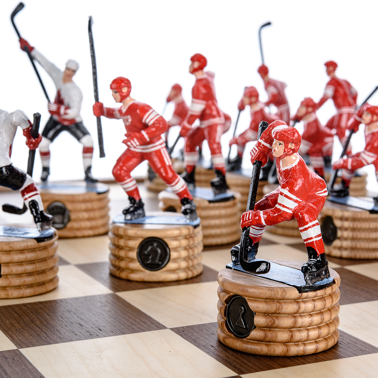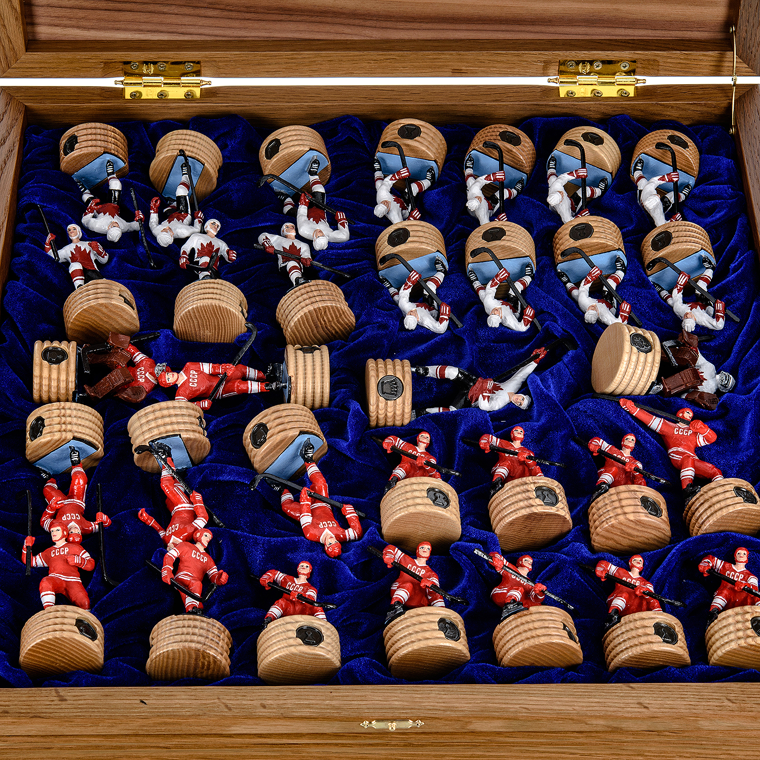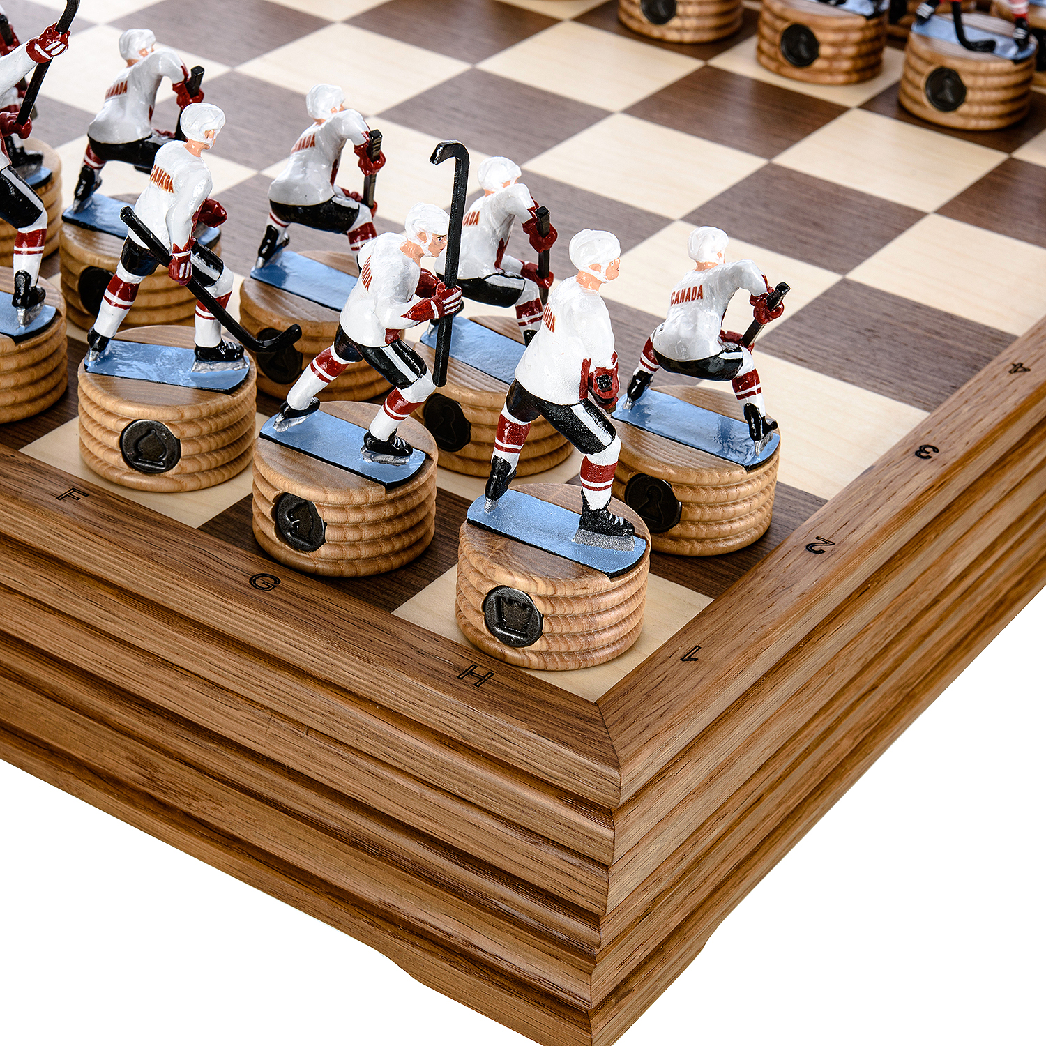 Шахматы деревянные с металлическими фигурами "Хоккей. СССР-Канада".Материалы: мореный дуб, цинковый сплав.