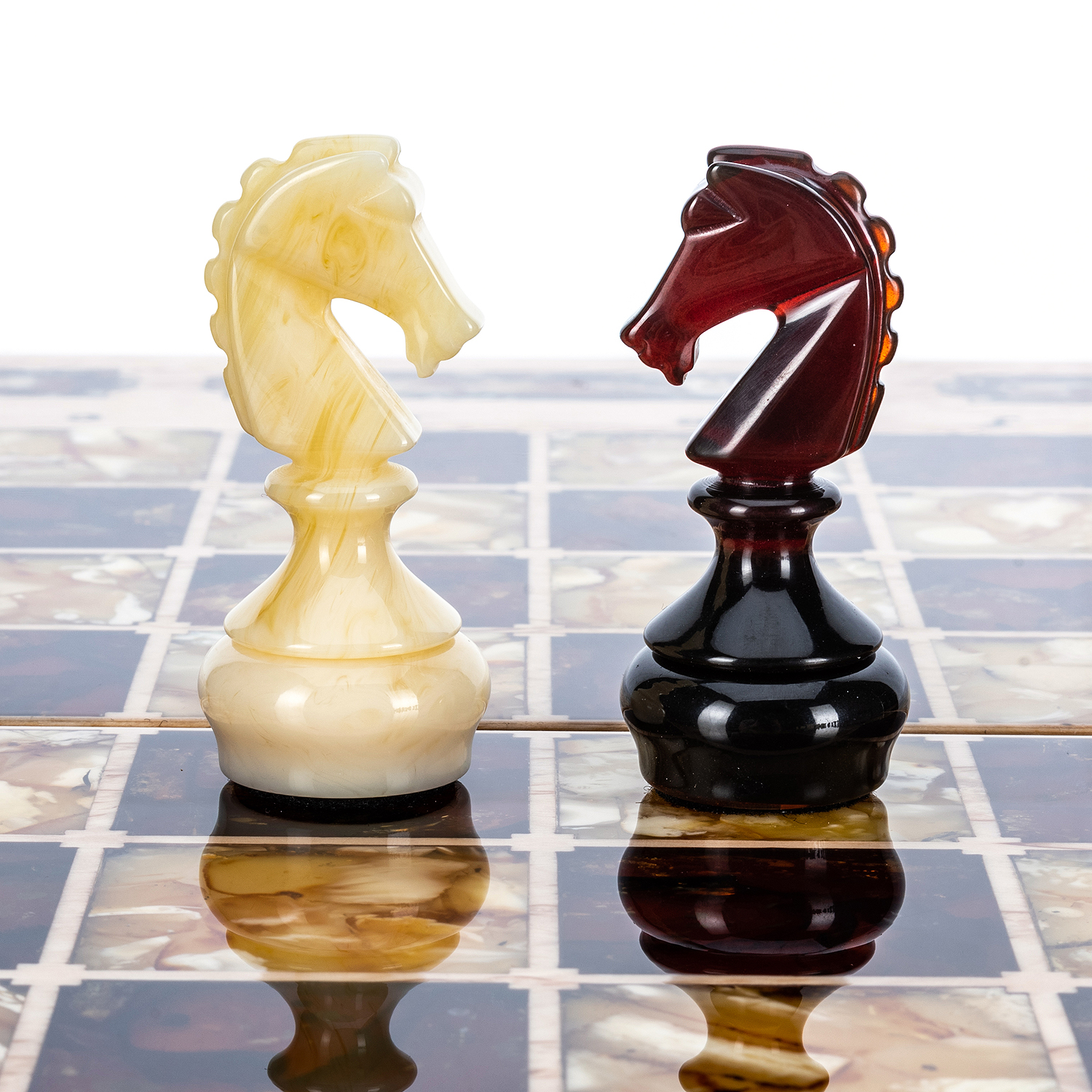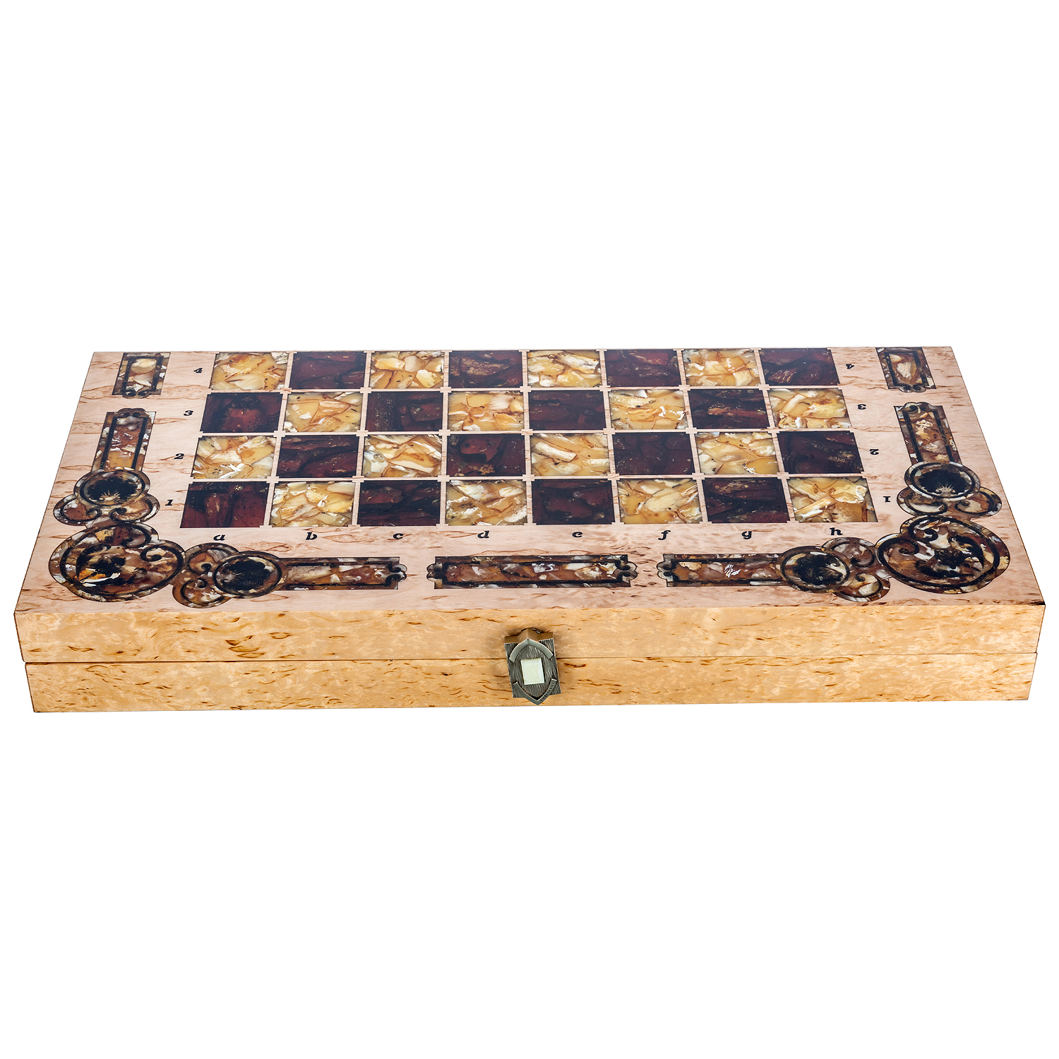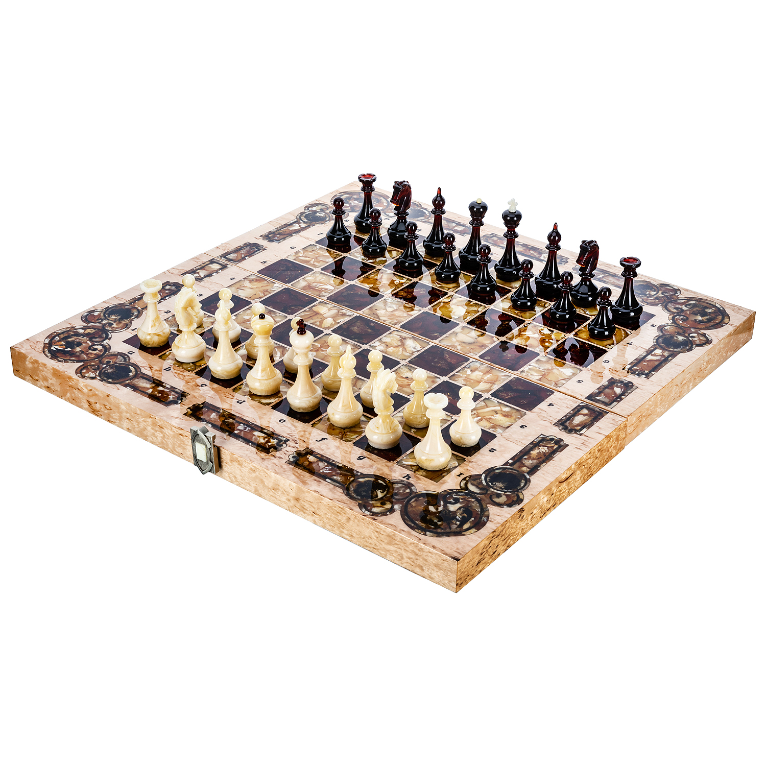 Шахматы с инкрустацией и фигурами из янтаря "Арабески-Марин" 56х56 см