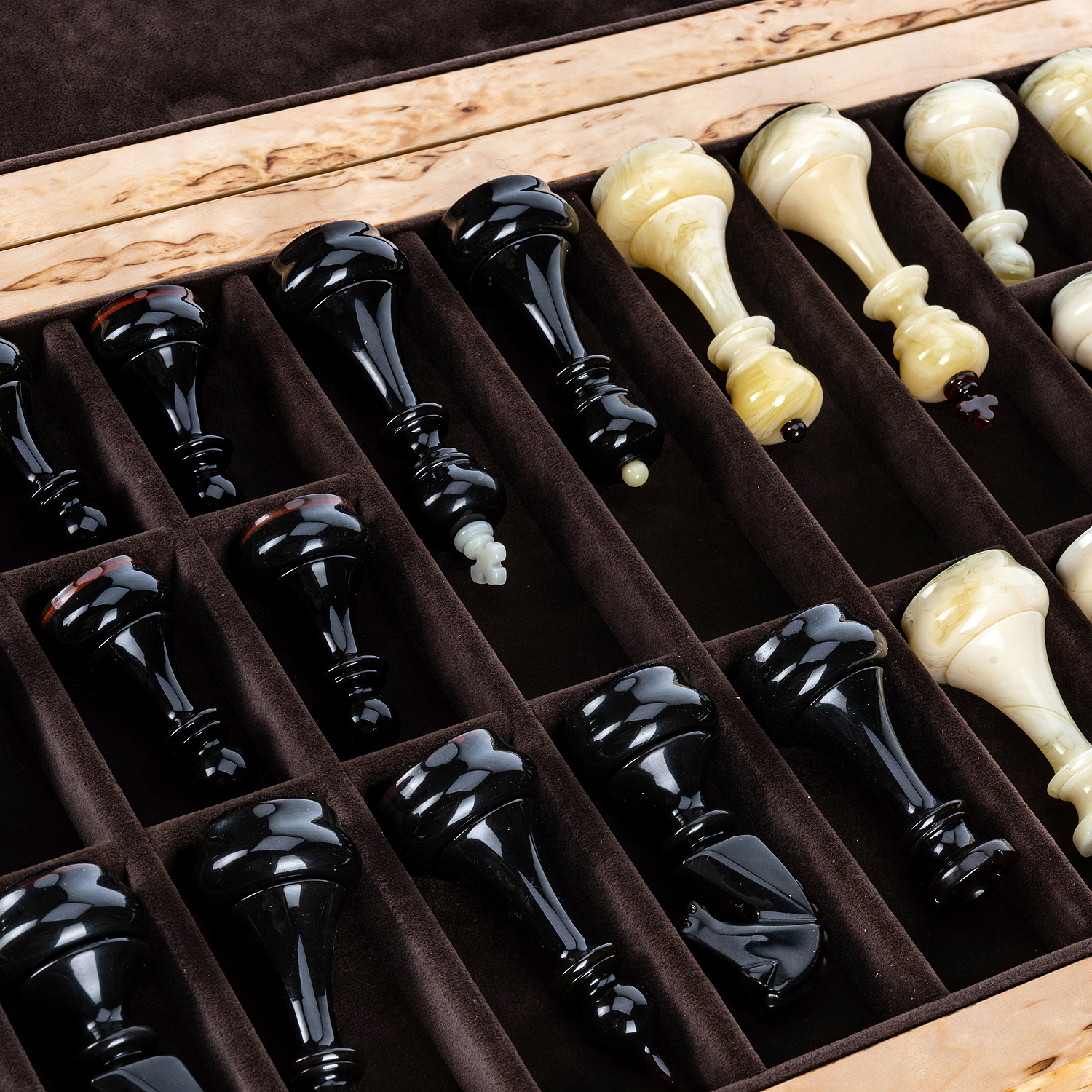 Шахматы с инкрустацией и фигурами из янтаря "Арабески-Марин".Материалы: корень ореха, янтарь.