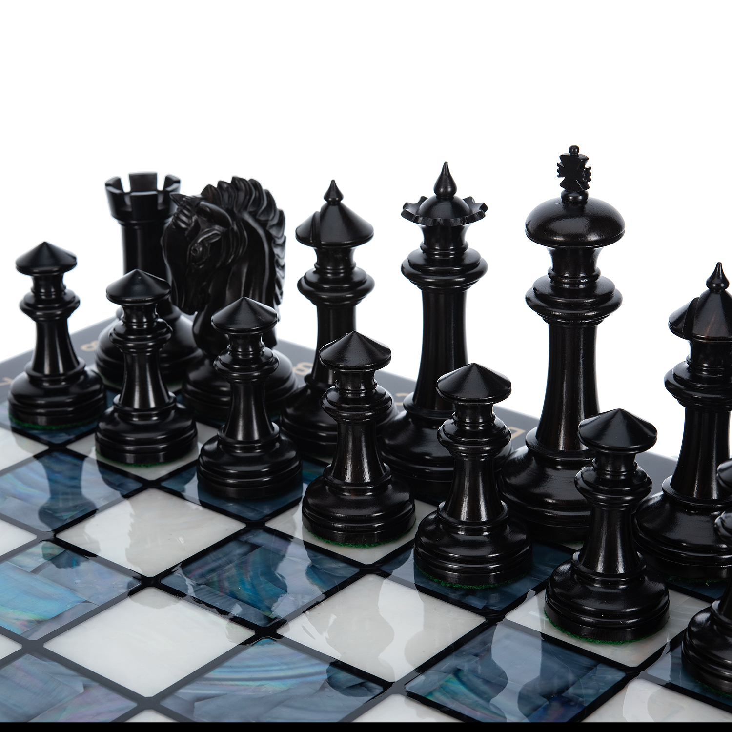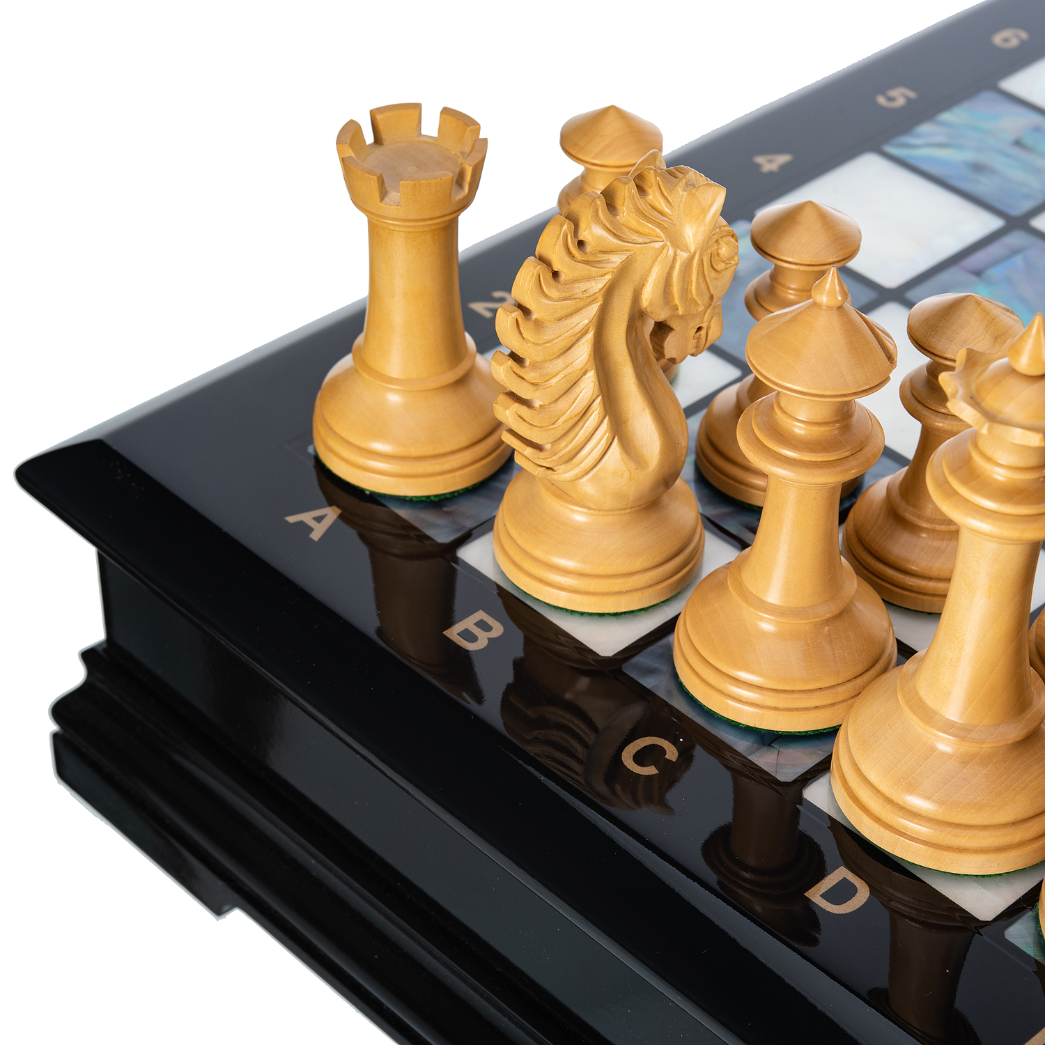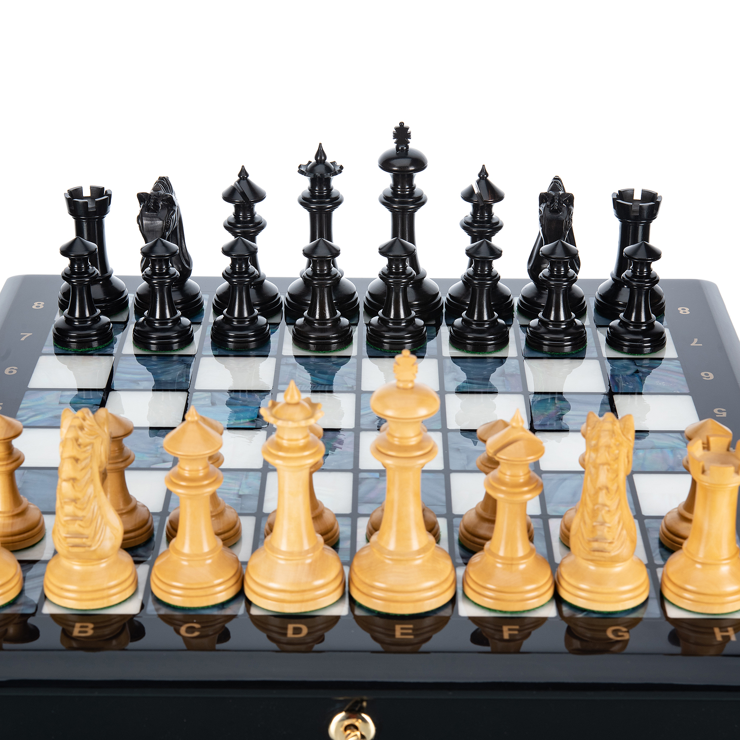 Шахматы с перламутром и деревянными фигурами "Вестминстер".Для изготовления фигур используются эбеновое черное дерево и самшит.