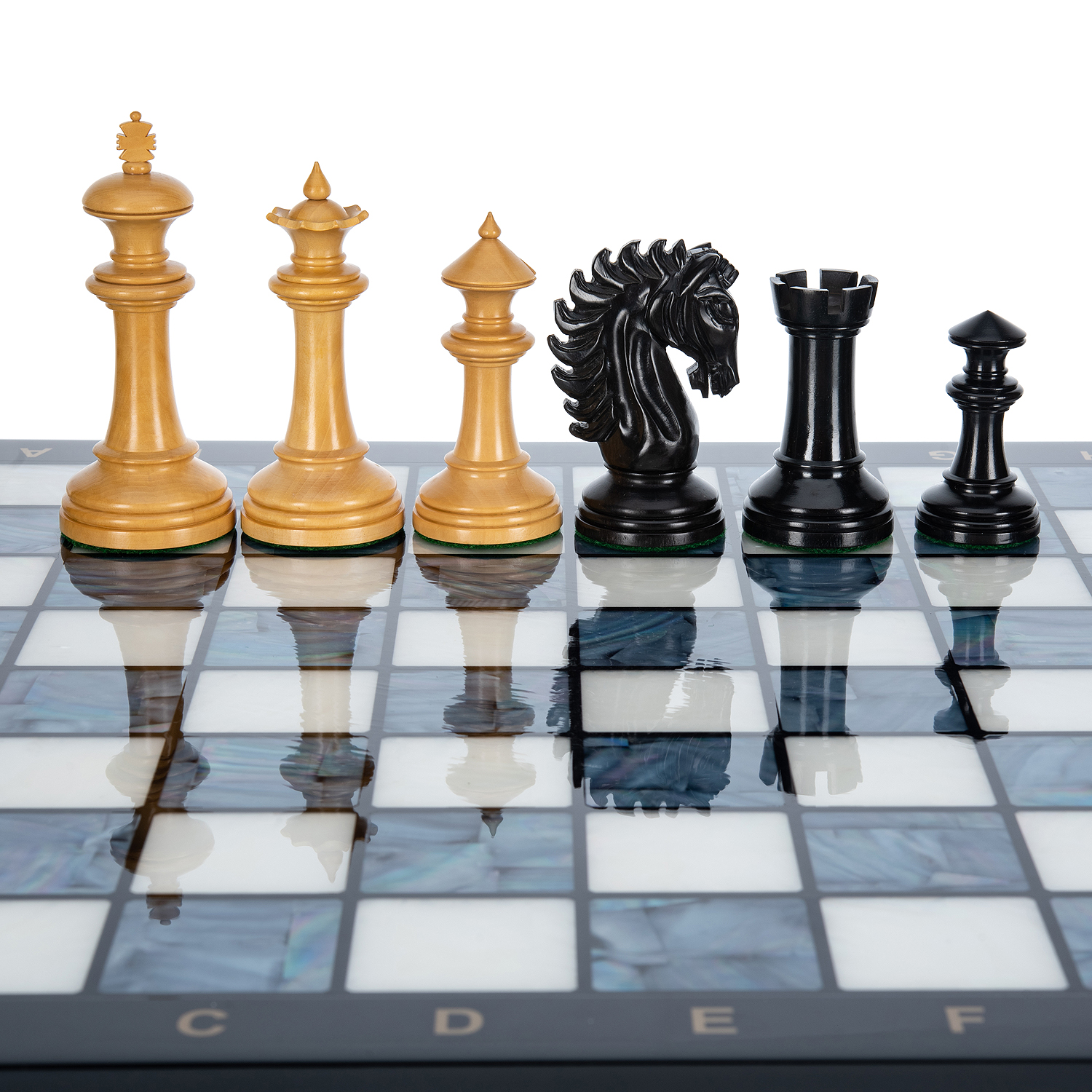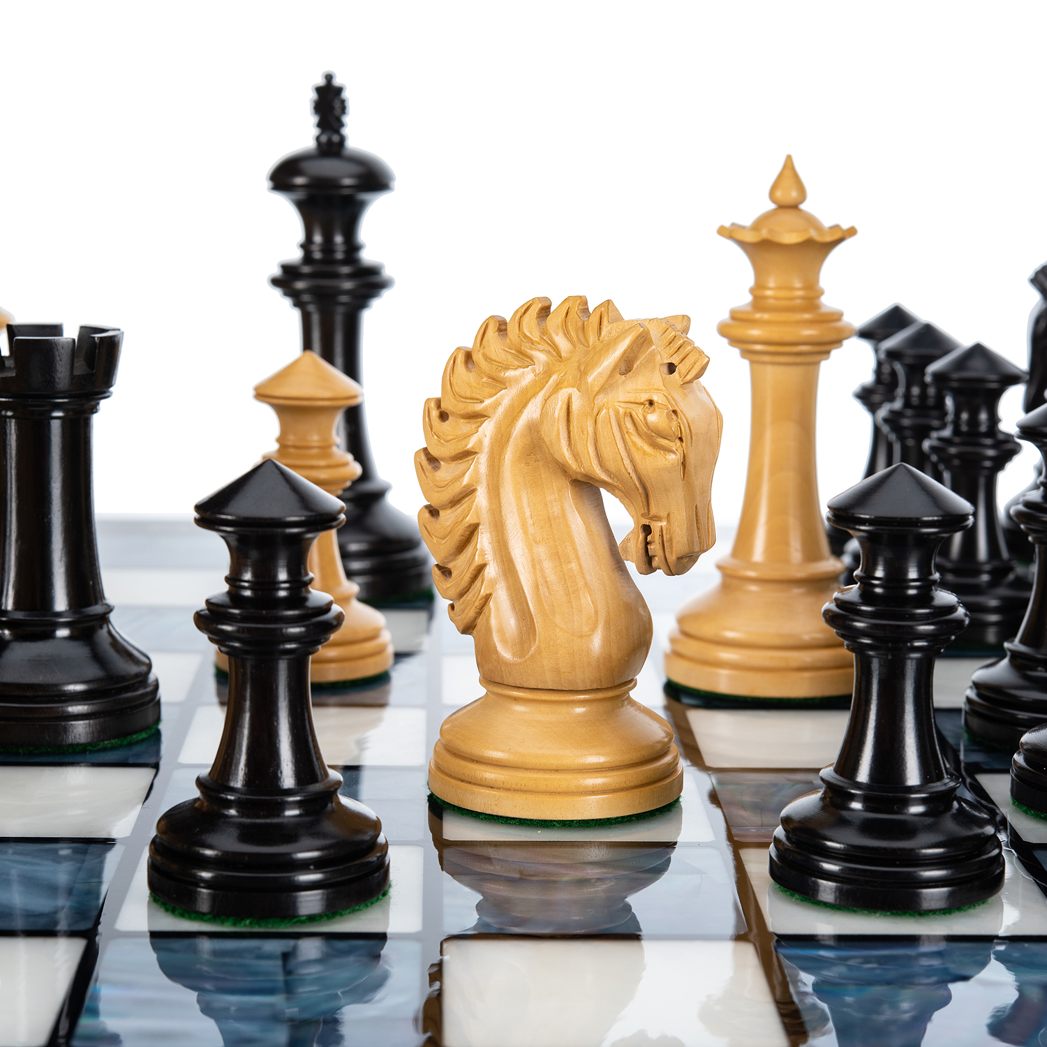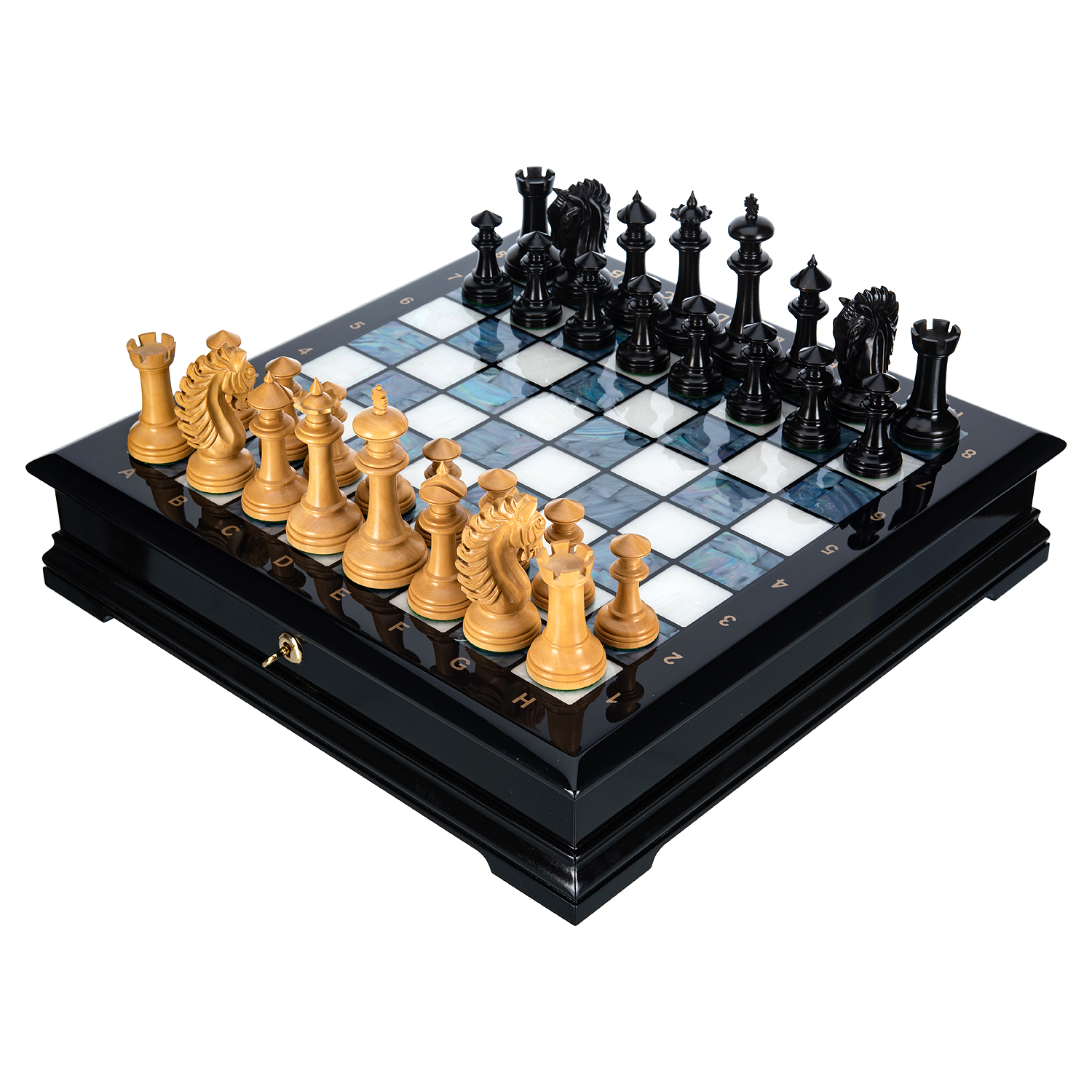 Шахматы с перламутром и деревянными фигурами "Вестминстер".Для изготовления фигур используются эбеновое черное дерево и самшит.