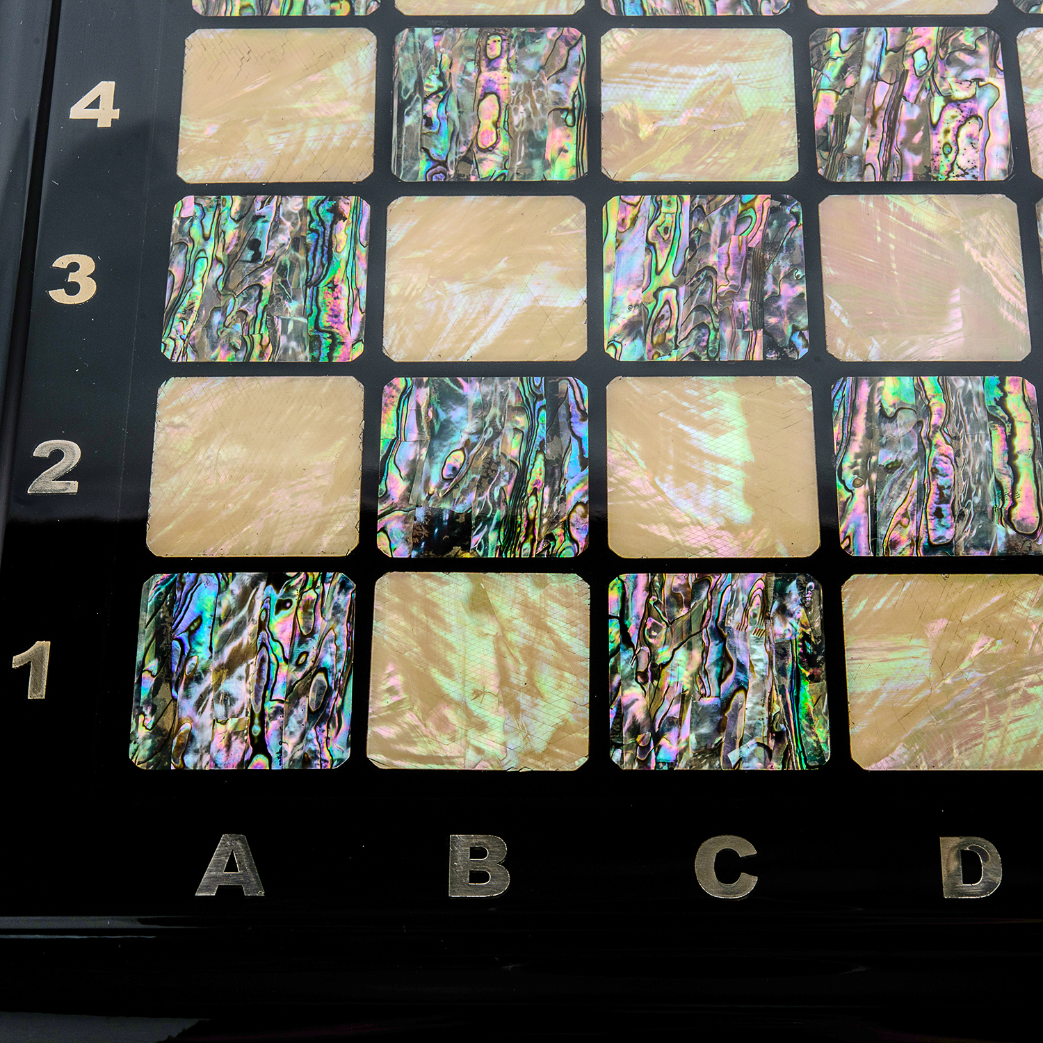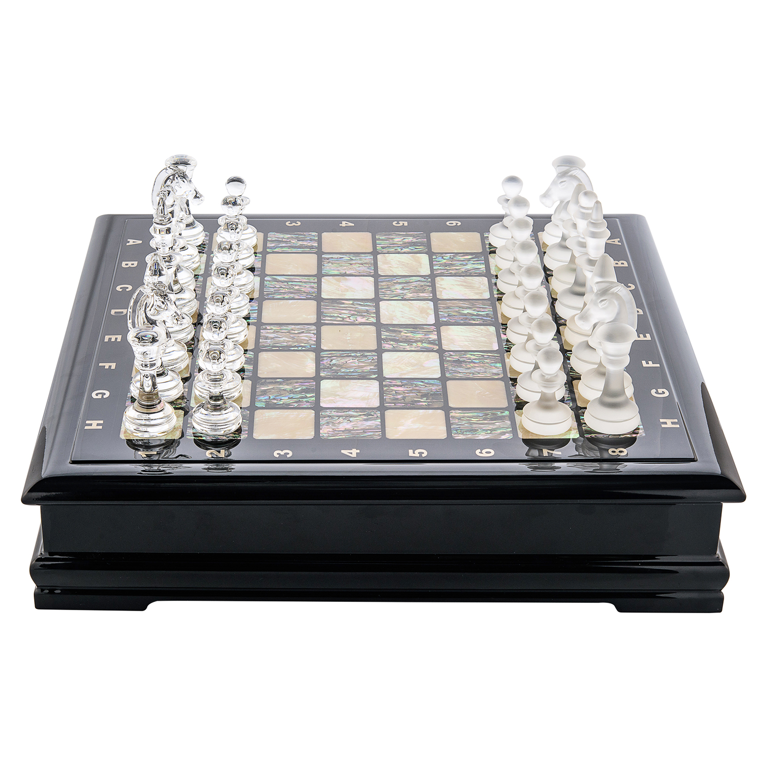 В данной модели сочетаются классический дизайн ларца с рояльным лаком и исспользование необычных для шахмат уникальных материалов, таких как натуральный перламутр и свинцовый хрусталь. Внутри янтарных шахмат установлен ложемент из искусственной замши, который позволит располагать каждую хрустальную фигуру в своей отдельной ячейке. Каждые наши перламутровые шахматы с хрустальными фигурами поставляются в фирменном кожаном кейсе.