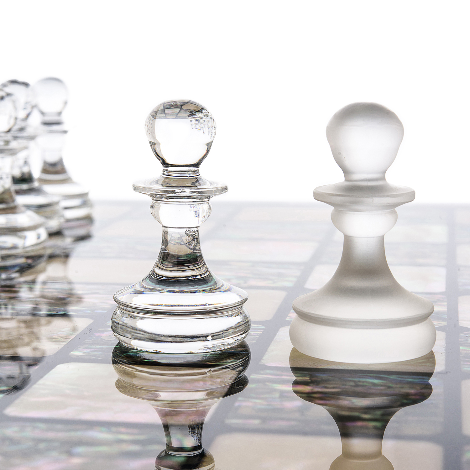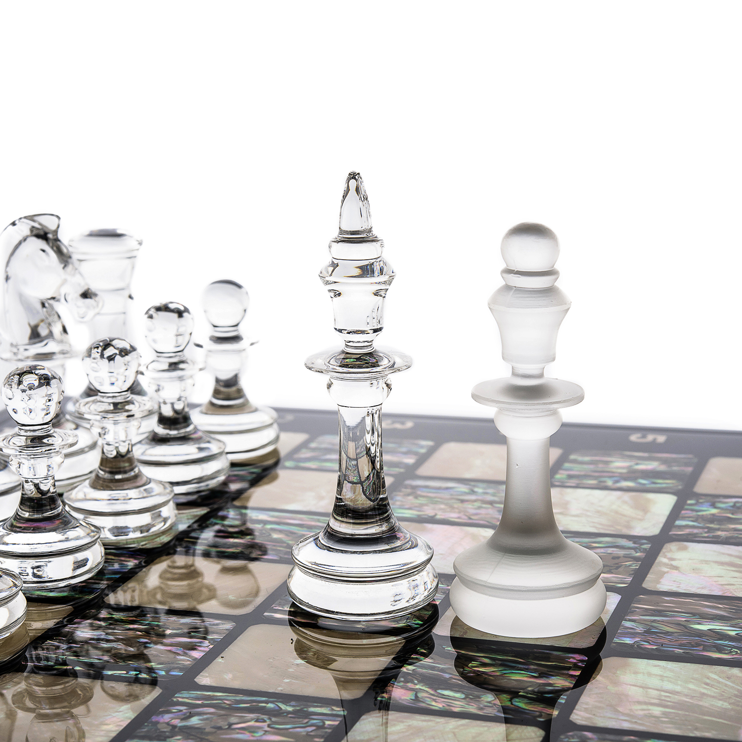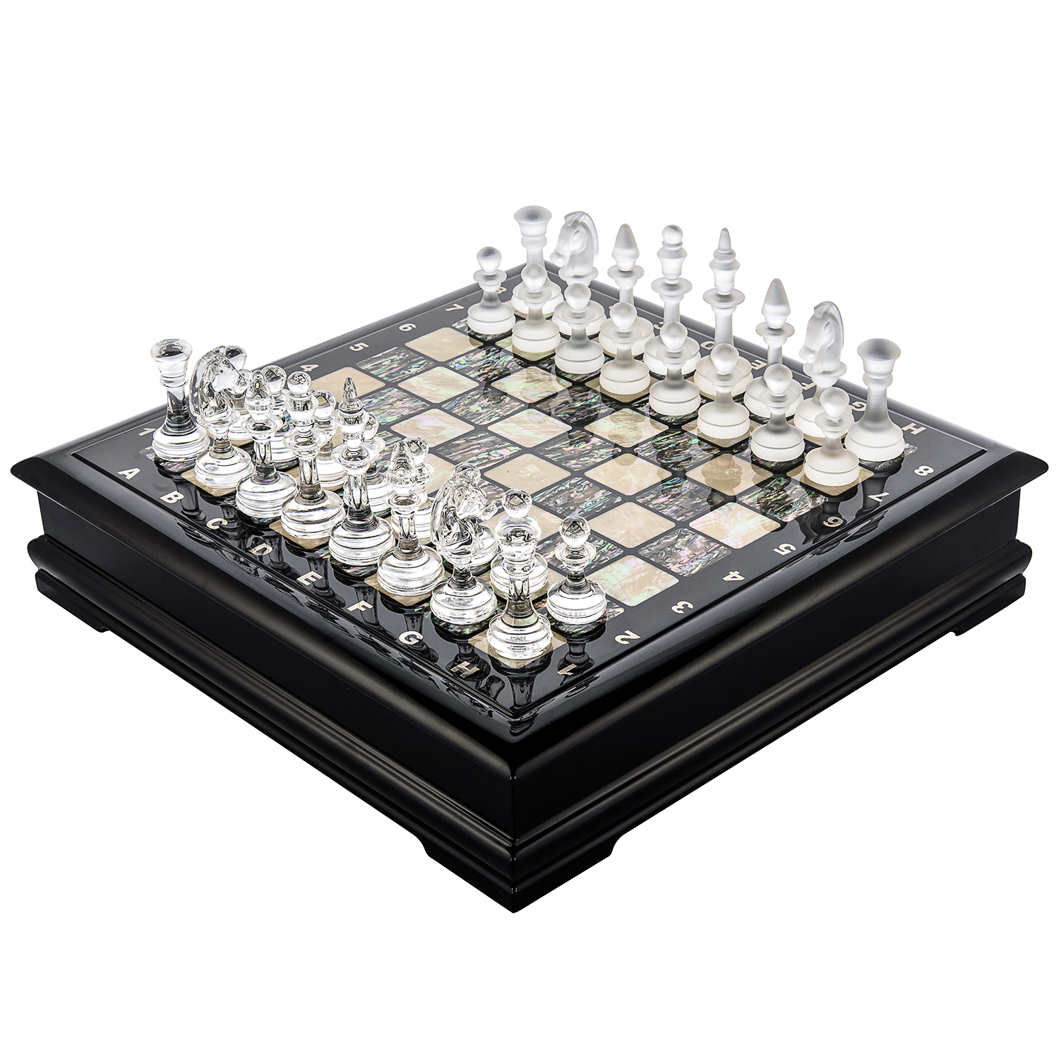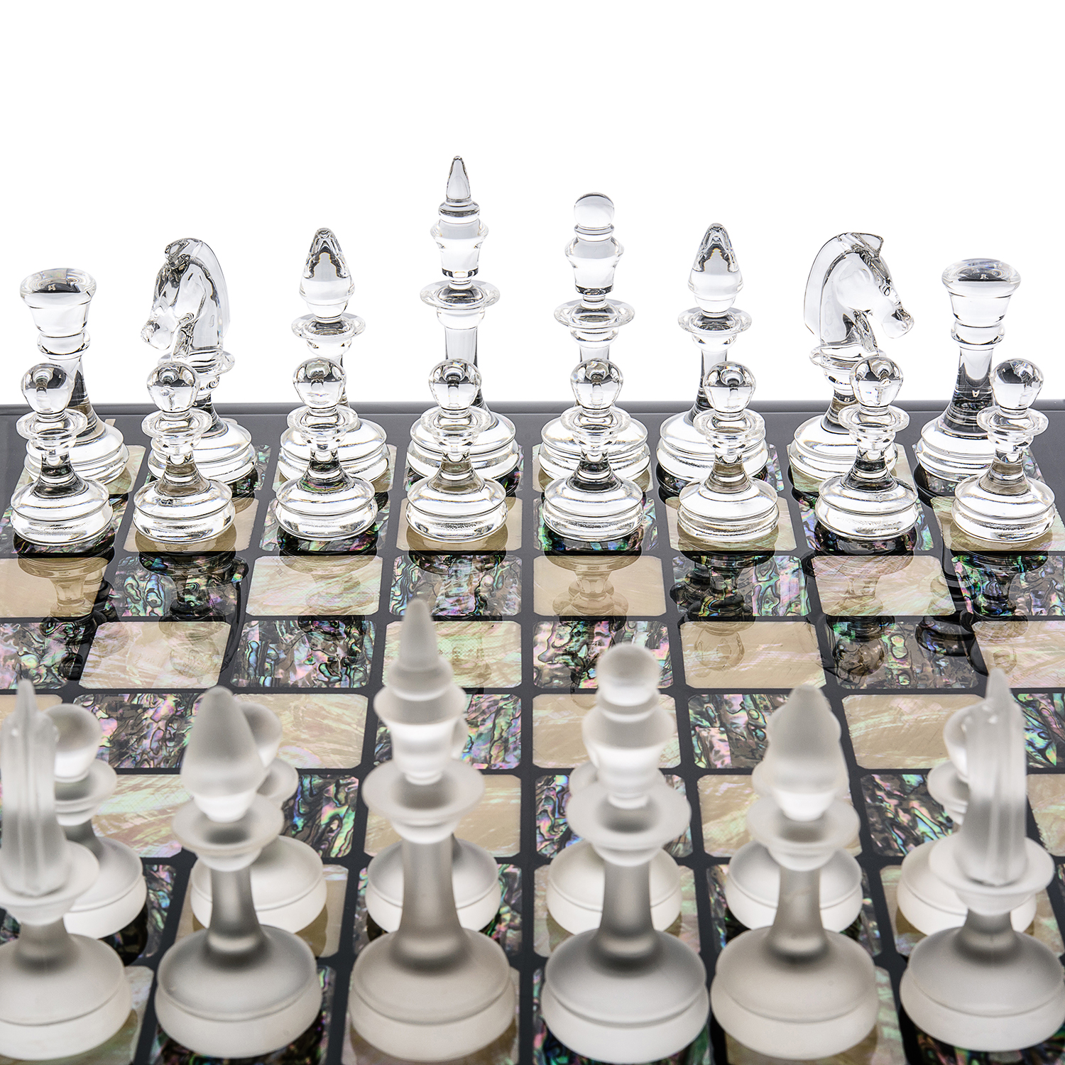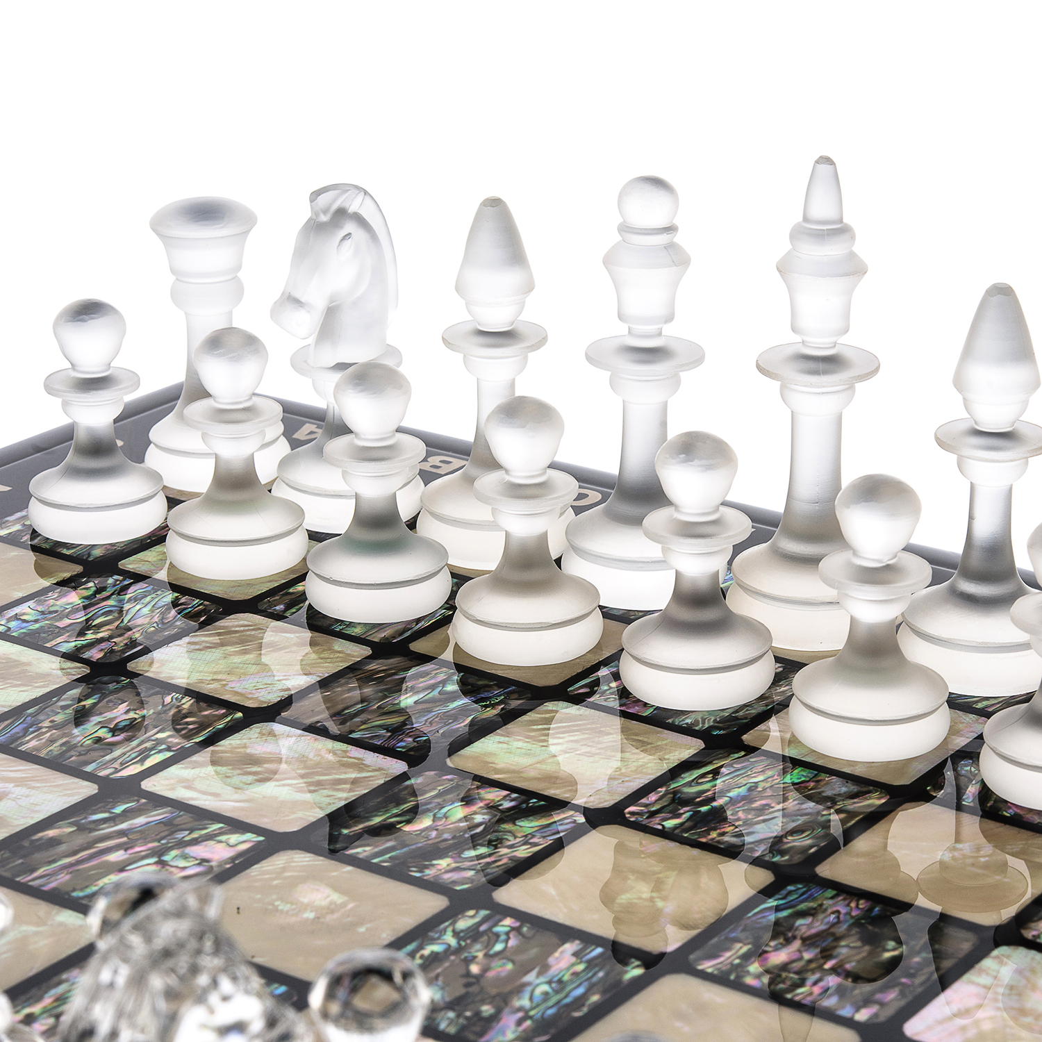 Шахматы с перламутровым полем и фигурами из хрусталя.Материалы: дерево, перламутр, хрусталь.