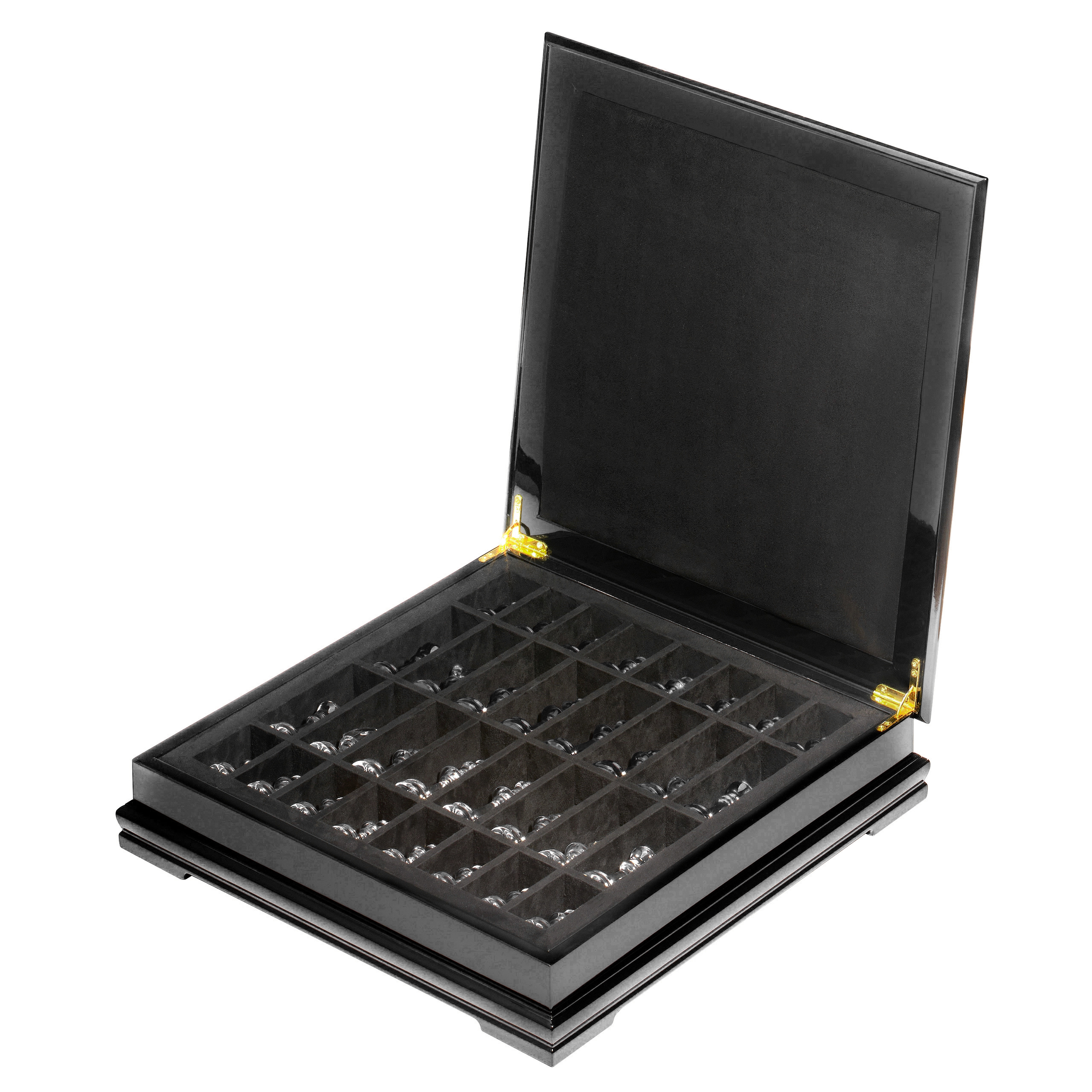 Шахматный ларец с натуральным перламутром и фигурами из хрусталя (отделка серой тканью) 45х45 см