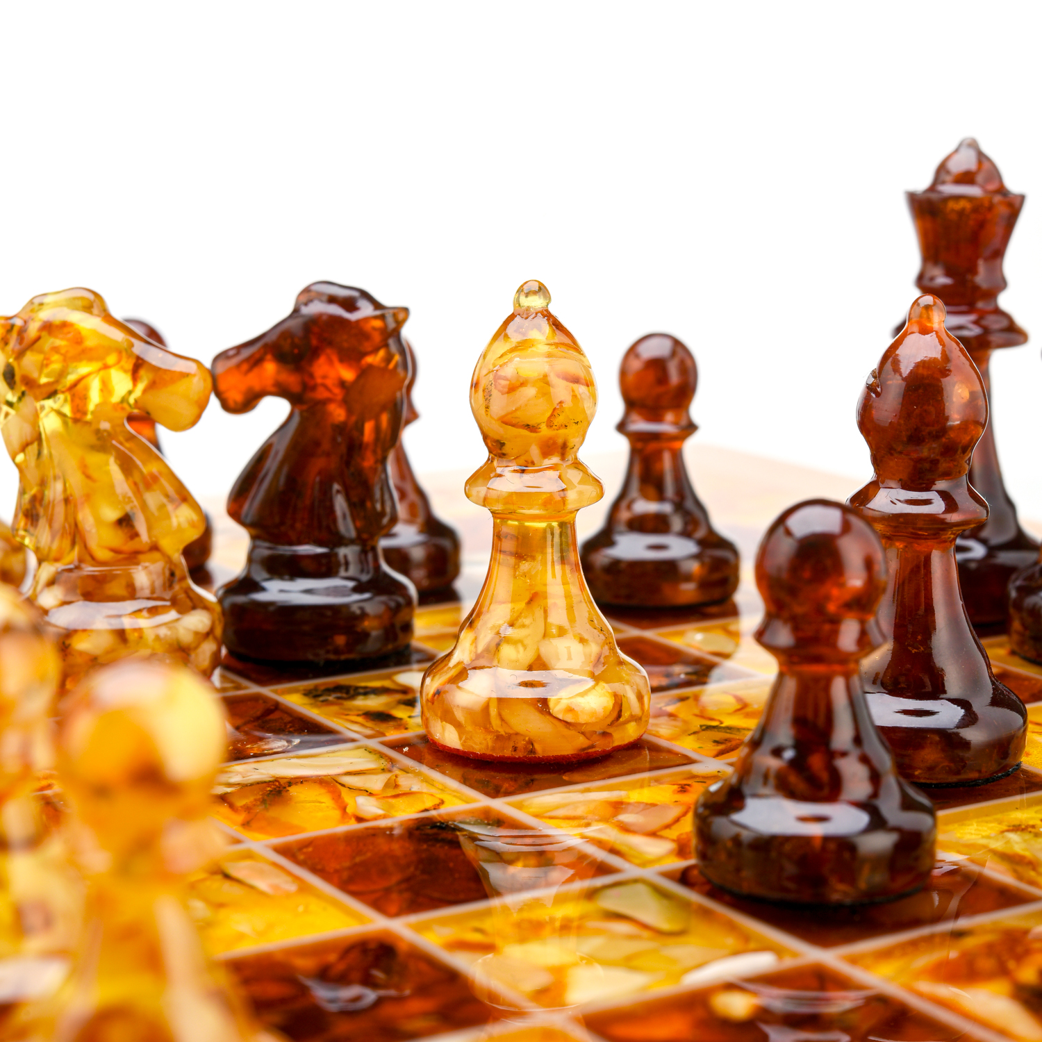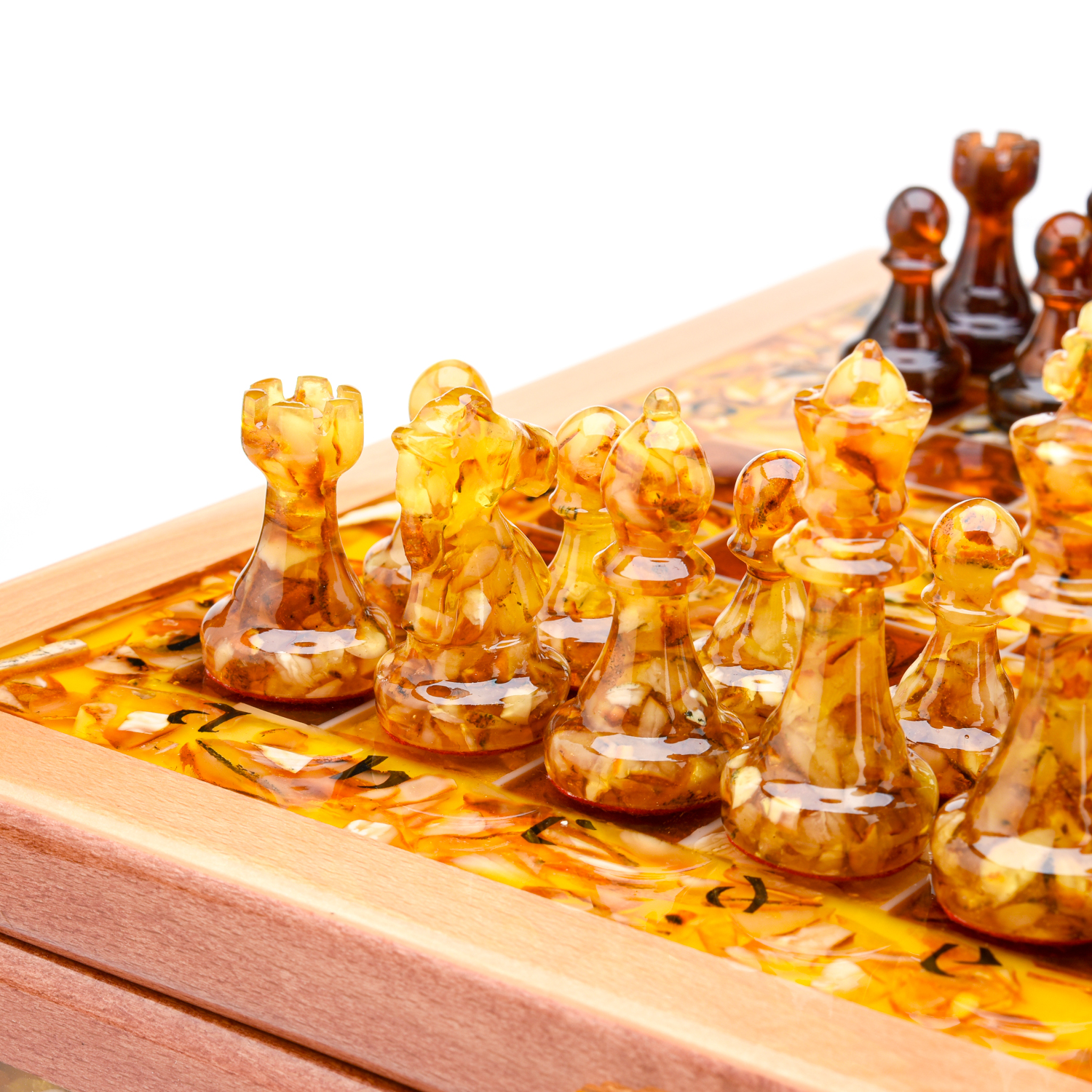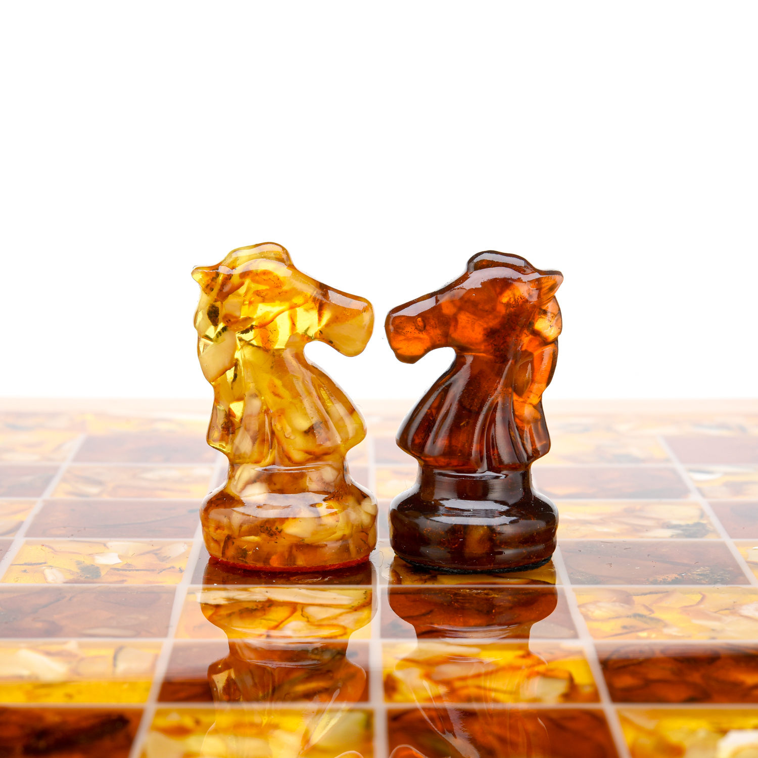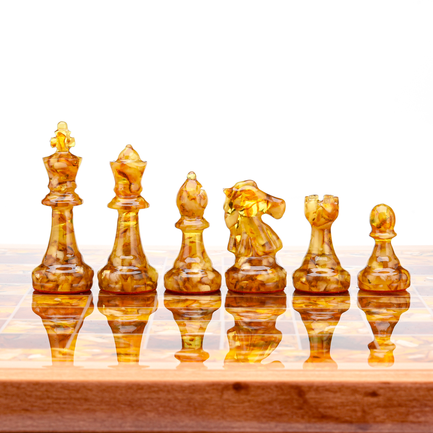 Шахматы с инкрустацией и фигурами из янтаря 28х28 см