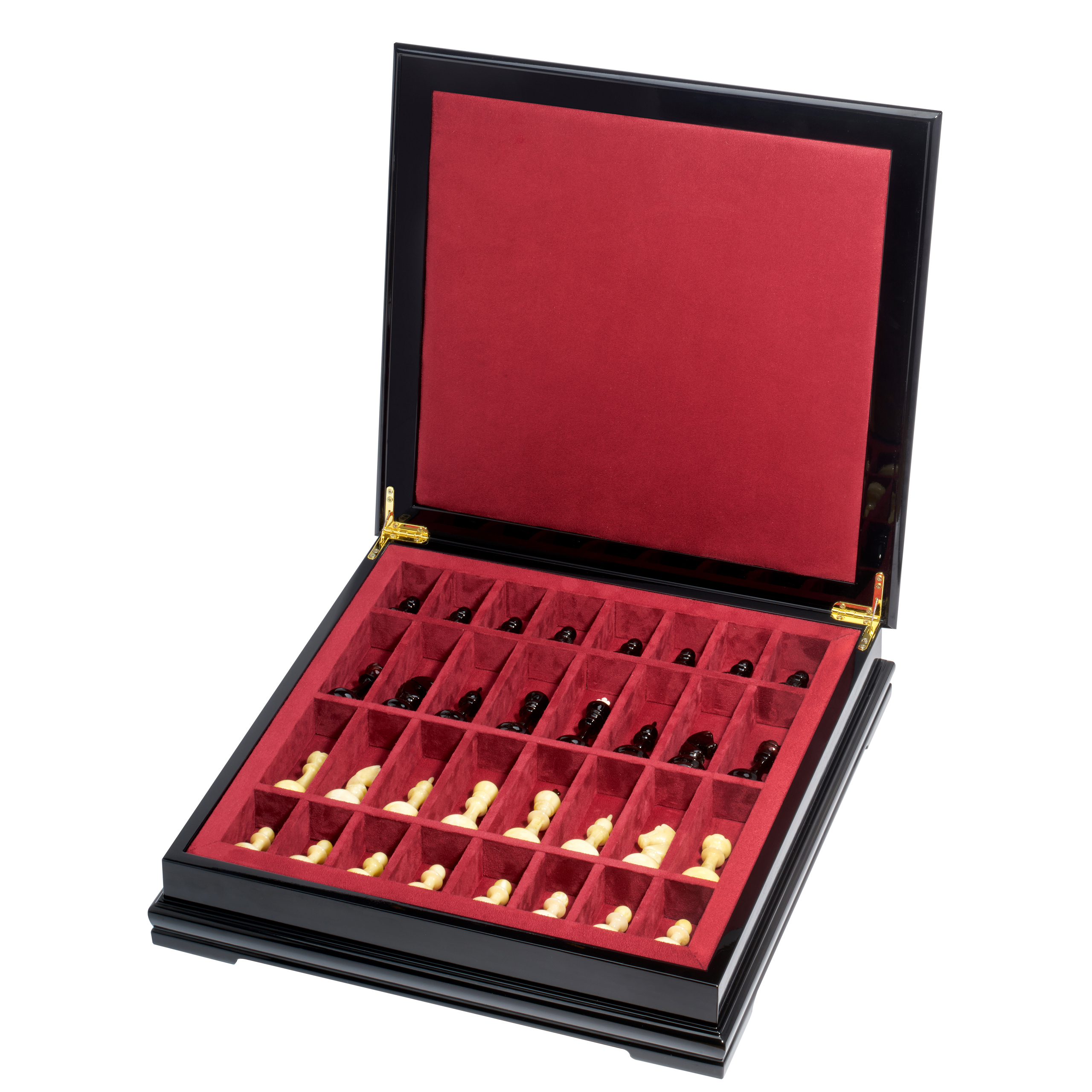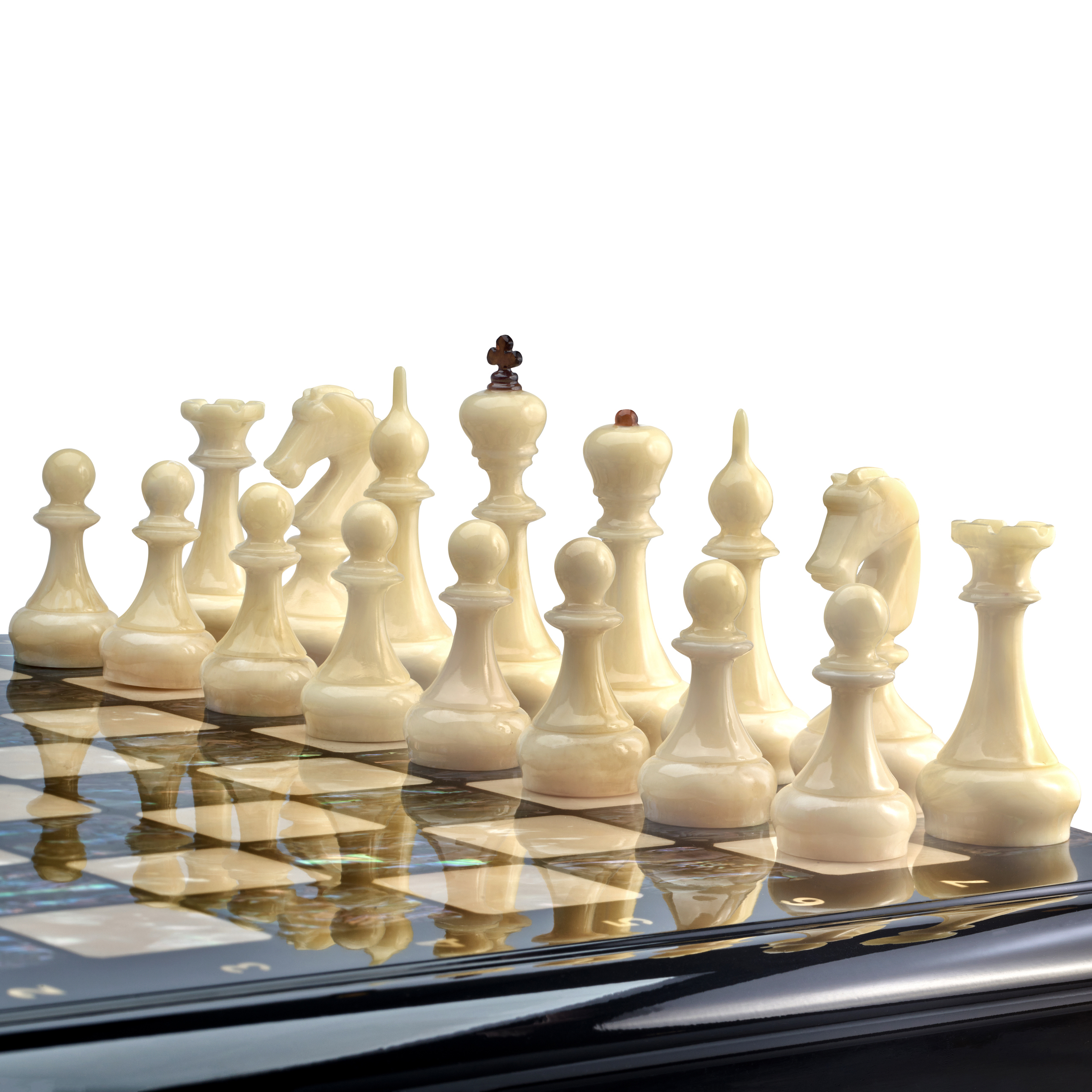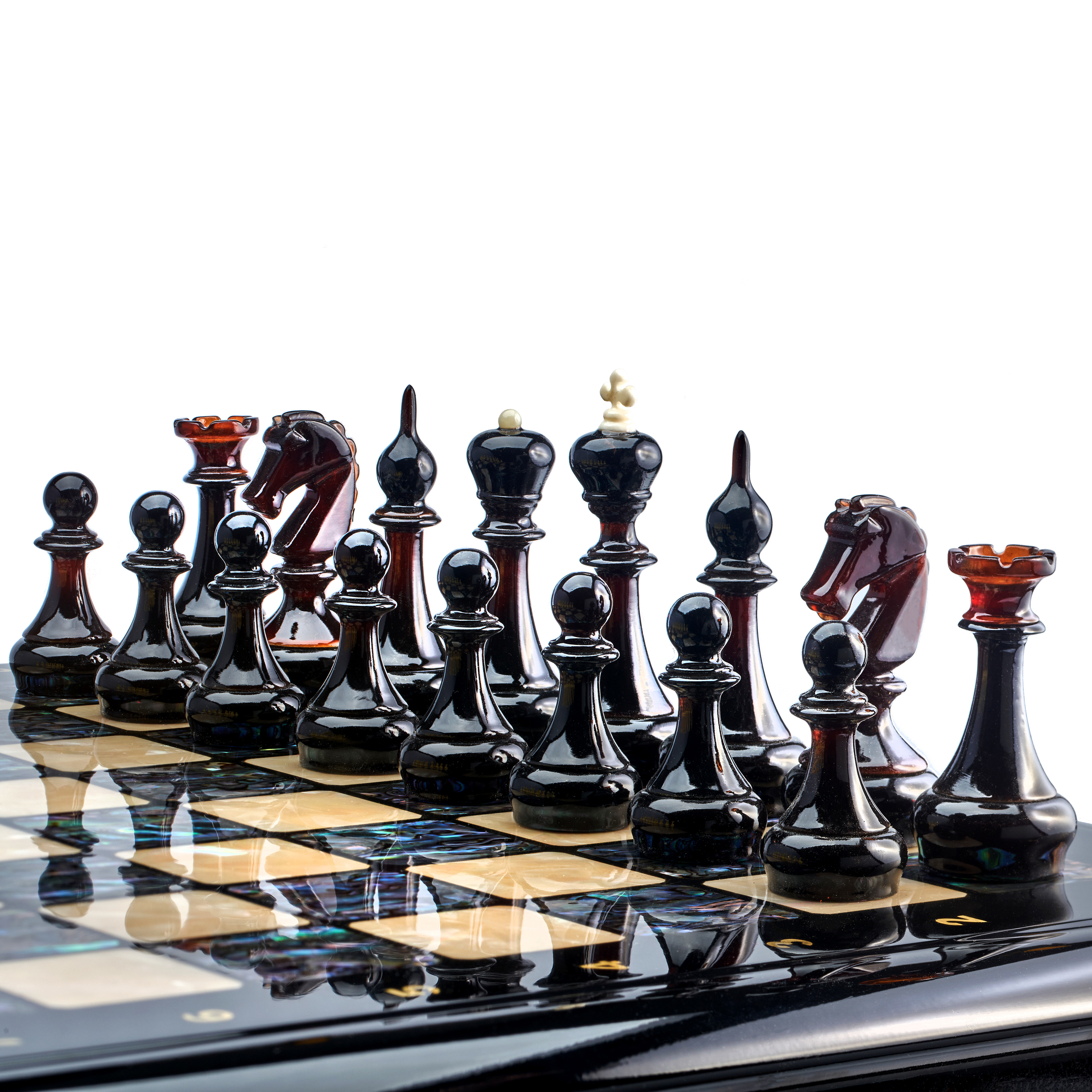 Русские подарки и сувениры → Настольные игры → Шахматы → Шахматный ларец с натуральным перламутром и фигурами из янтаря (отделка красной тканью) 45х45 см