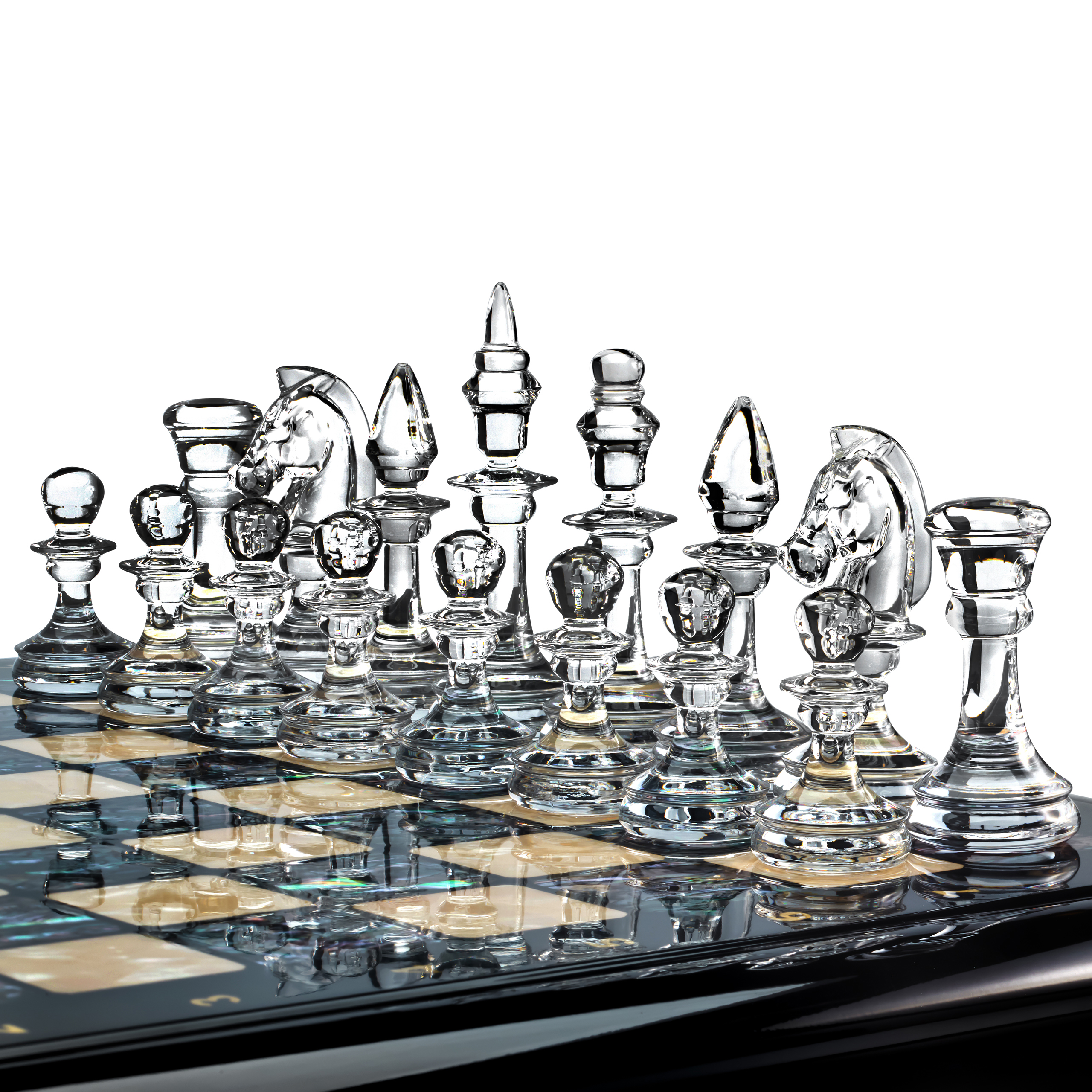 Шахматы с перламутровым полем и фигурами из хрусталя.Материалы: дерево, перламутр, хрусталь.