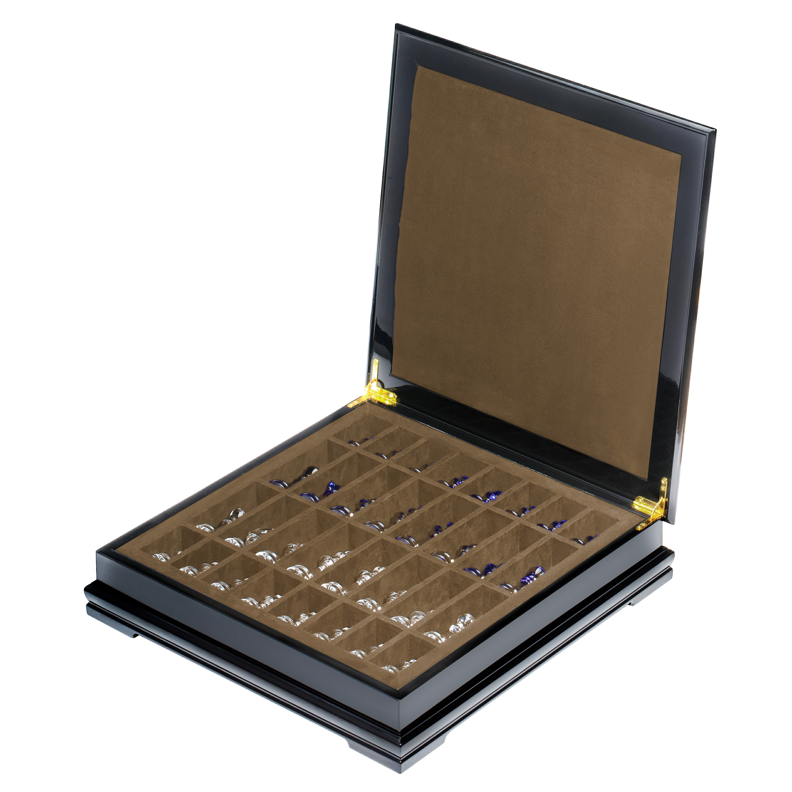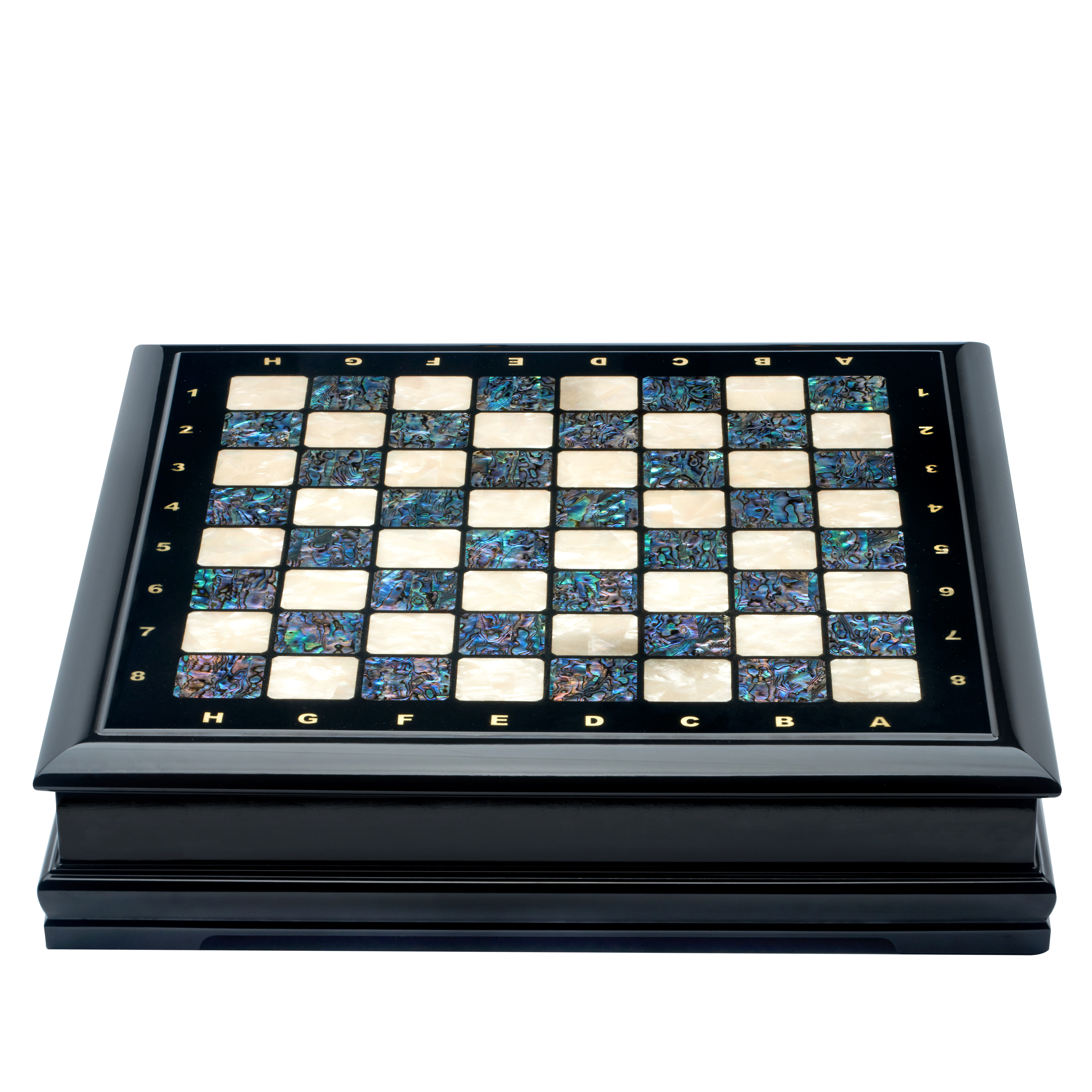 В данной модели сочетаются классический дизайн ларца с рояльным лаком и исспользование необычных для шахмат уникальных материалов, таких как натуральный перламутр и свинцовый хрусталь. Внутри янтарных шахмат установлен ложемент из искусственной замши, который позволит располагать каждую хрустальную фигуру в своей отдельной ячейке. Каждые наши перламутровые шахматы с хрустальными фигурами поставляются в фирменном кожаном кейсе.