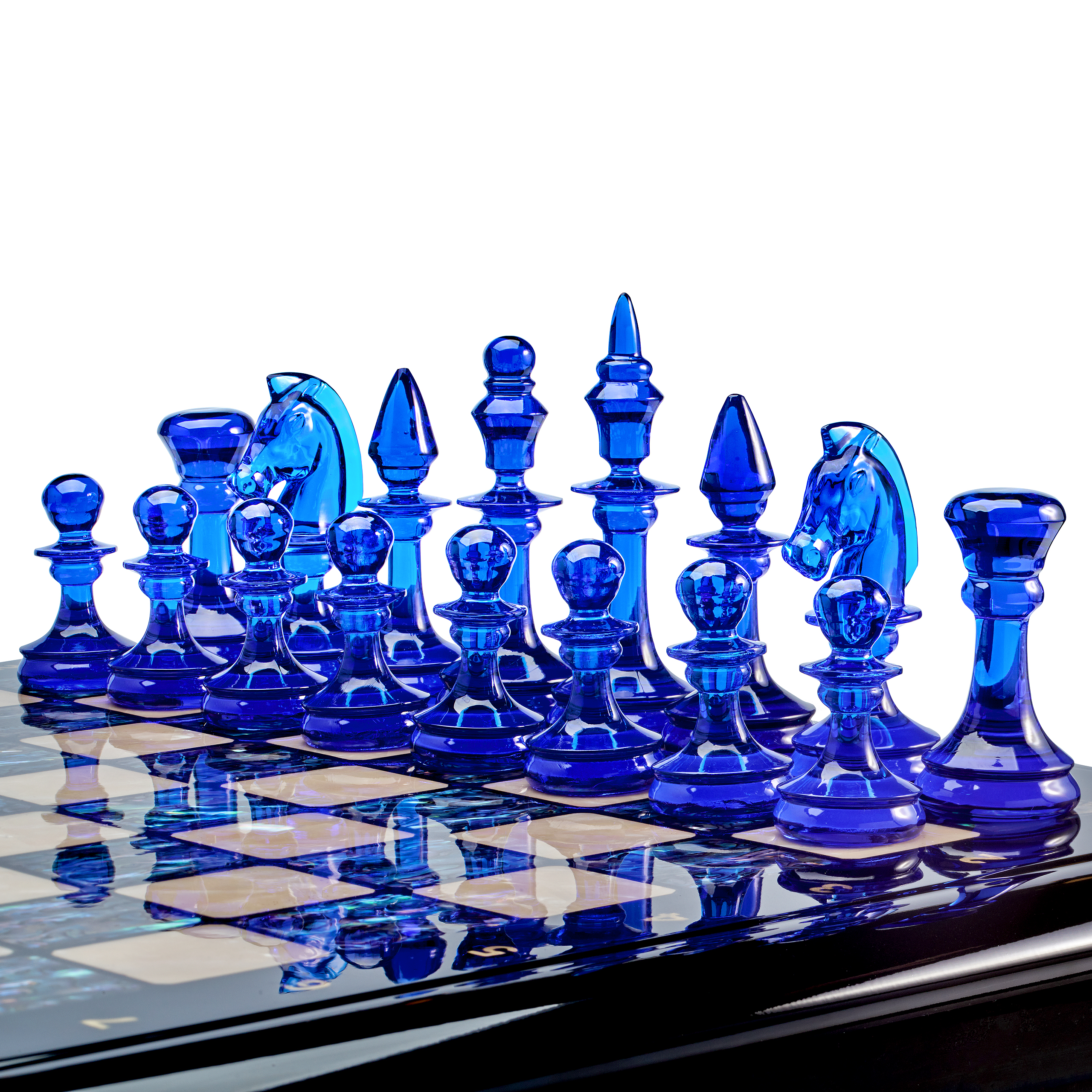 Шахматный ларец с натуральным перламутром и фигурами из цветного хрусталя (отделка красной тканью) 45х45 см