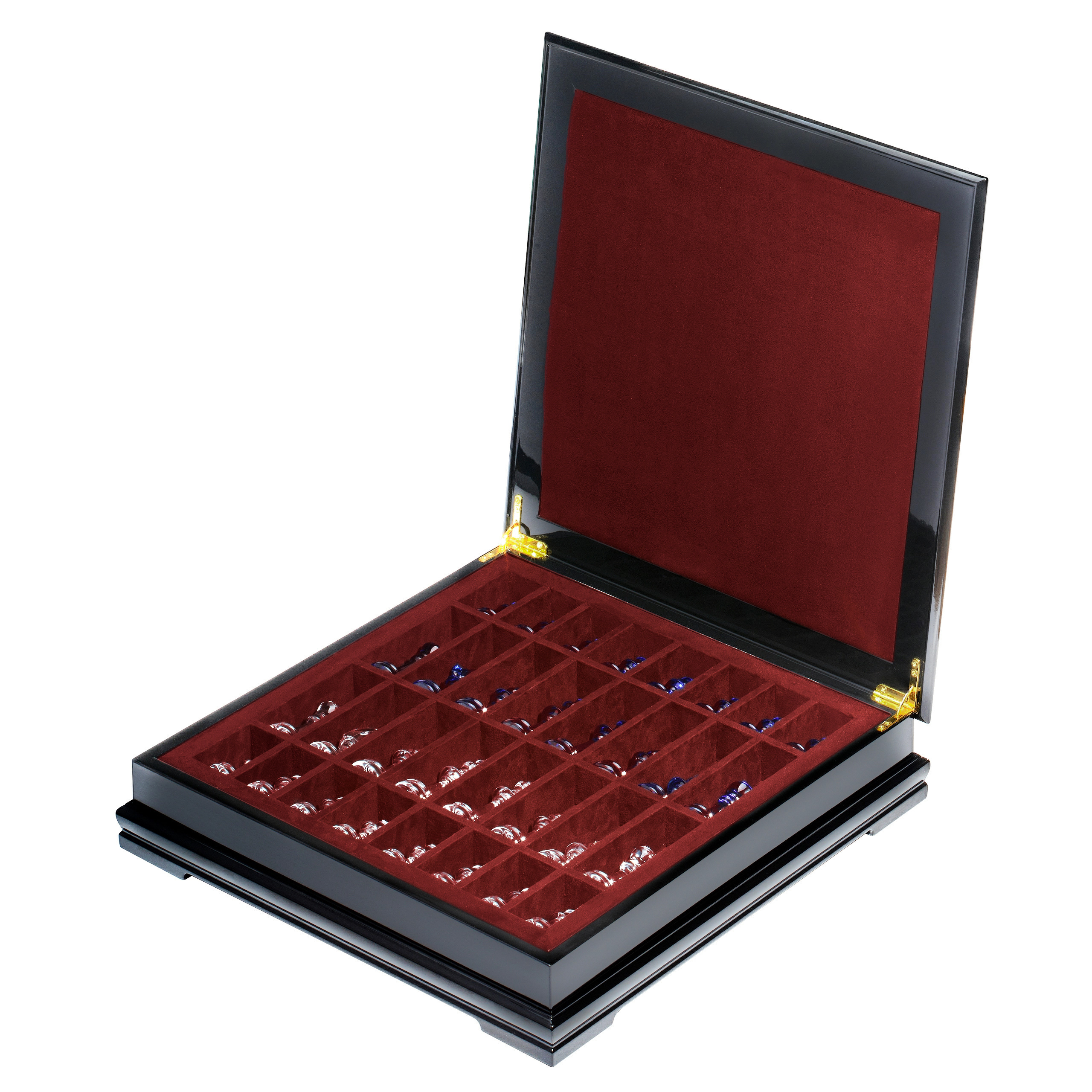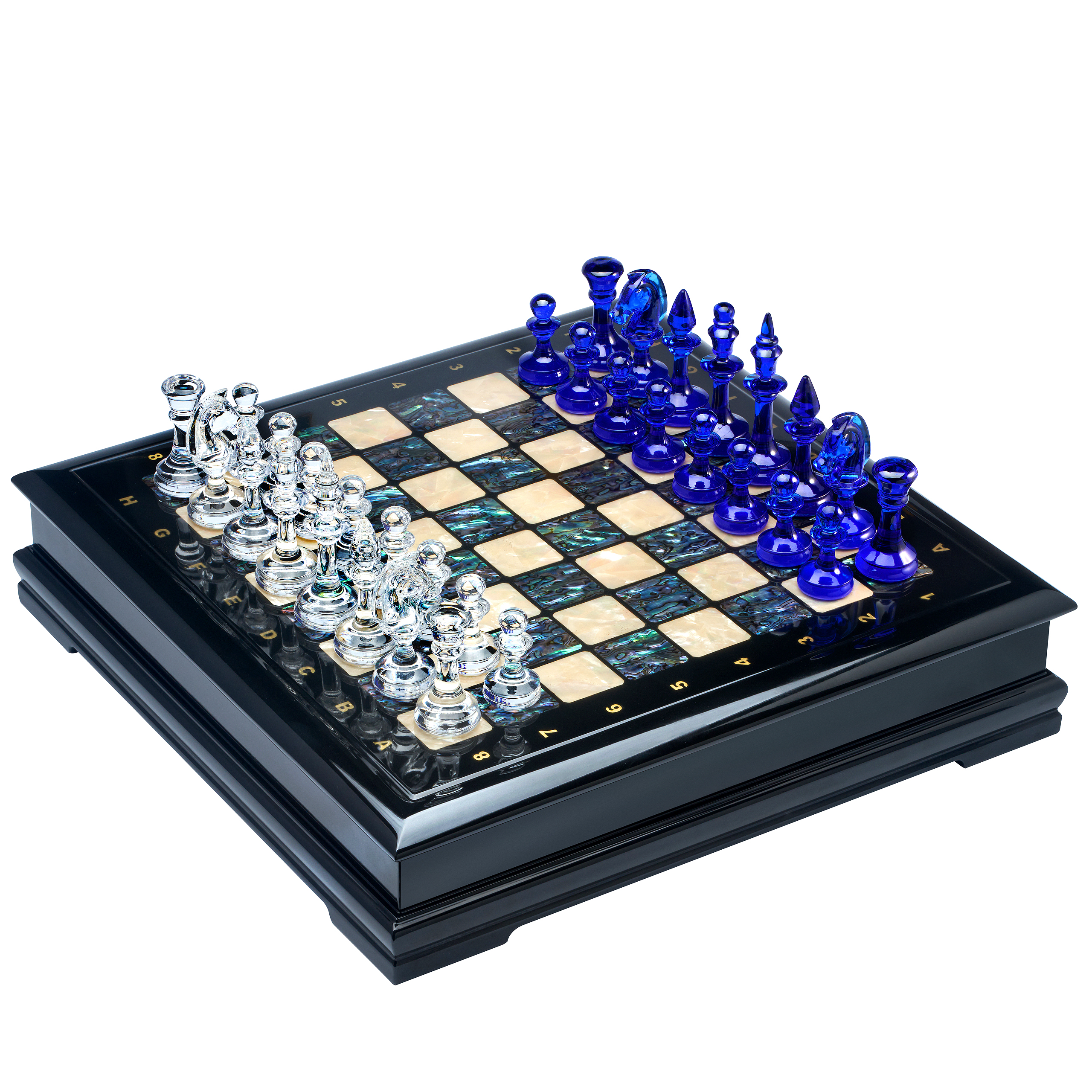 Русские подарки и сувениры → Настольные игры → Шахматы → Шахматный ларец с натуральным перламутром и фигурами из цветного хрусталя (отделка красной тканью) 45х45 см