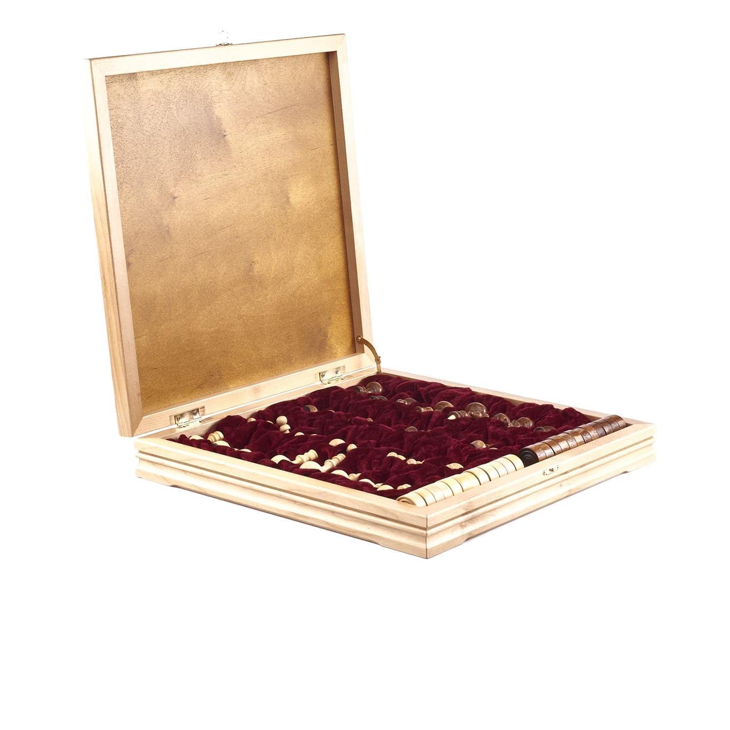 Шахматы и шашки в одном составляют оригинальный игровой набор. Сделан он из нескольких видов древесины, включая розовое дерево. Другие его названия: баи́я, буа де роз, тюльпановое дерево. Это древесина, получаемая от субтропического дерева из рода Дальбергия, произрастающего в Бразилии.Деревья рода Дальбергия дают также большую часть древесины палисандр.