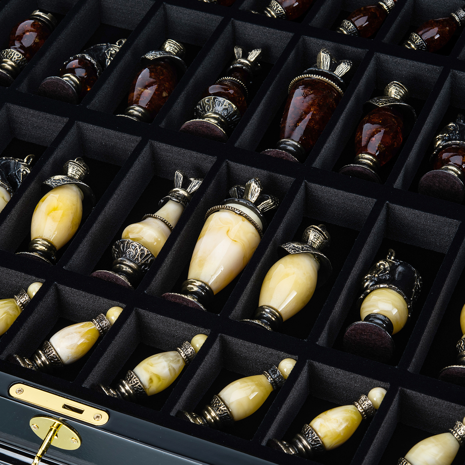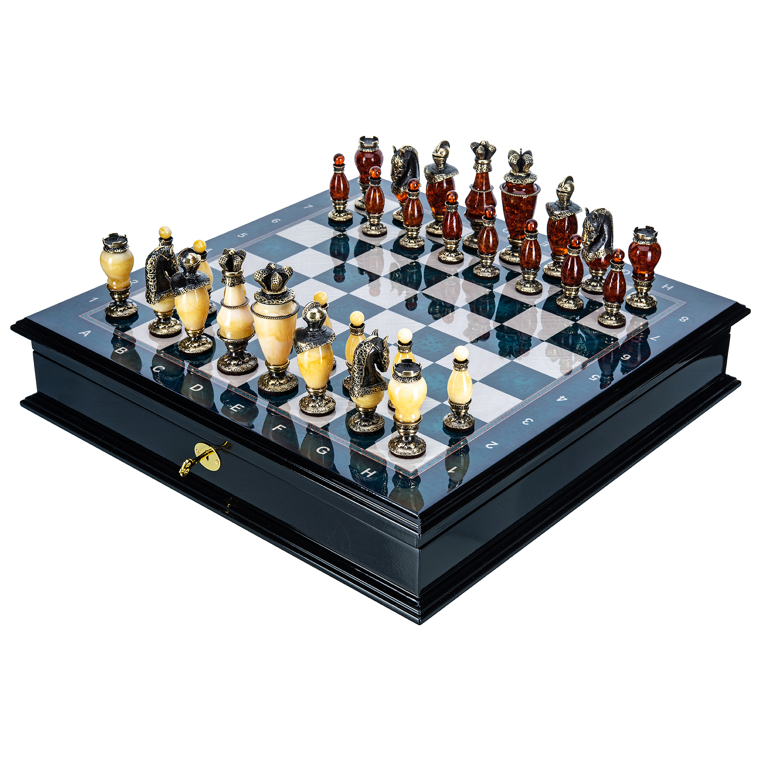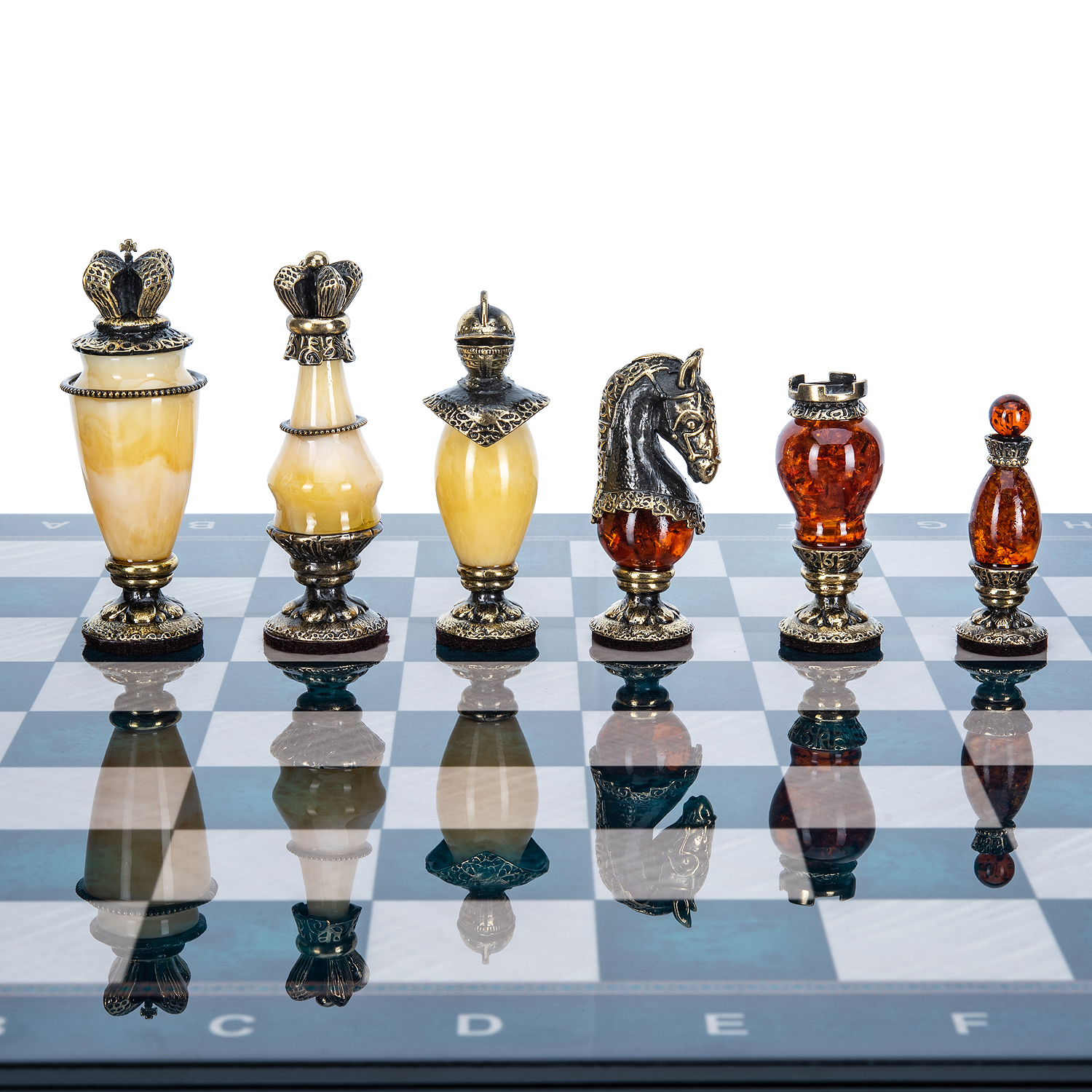 Шахматы с янтарными фигурами "Рыцарский турнир".Материалы: дерево, янтарь, бронза.