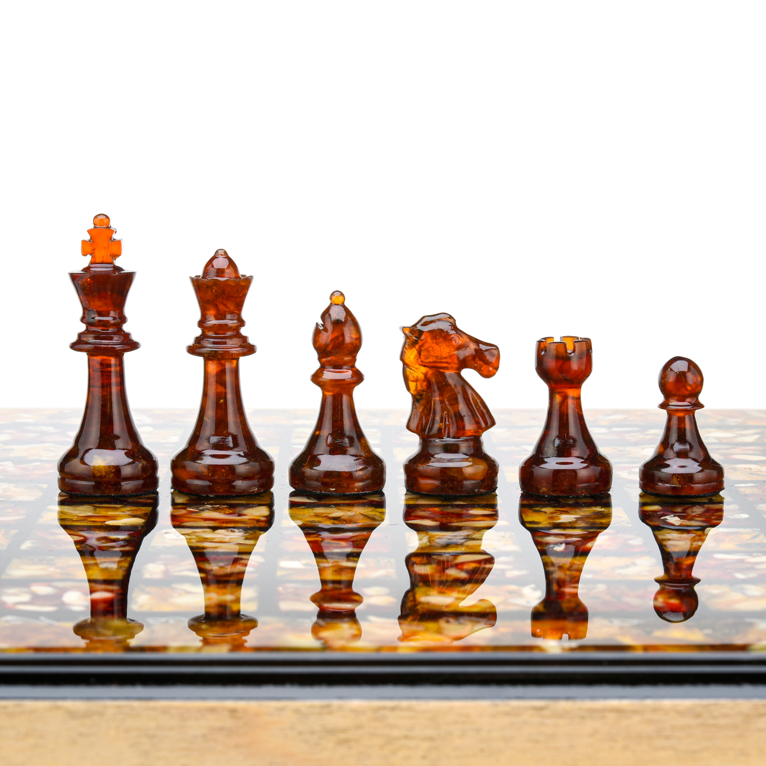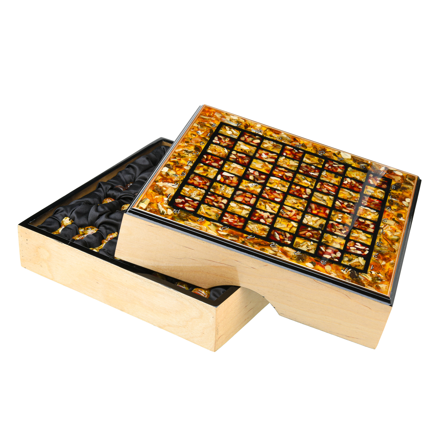 Шахматный ларец с инкрустацией и фигурами из янтаря 30х30 см