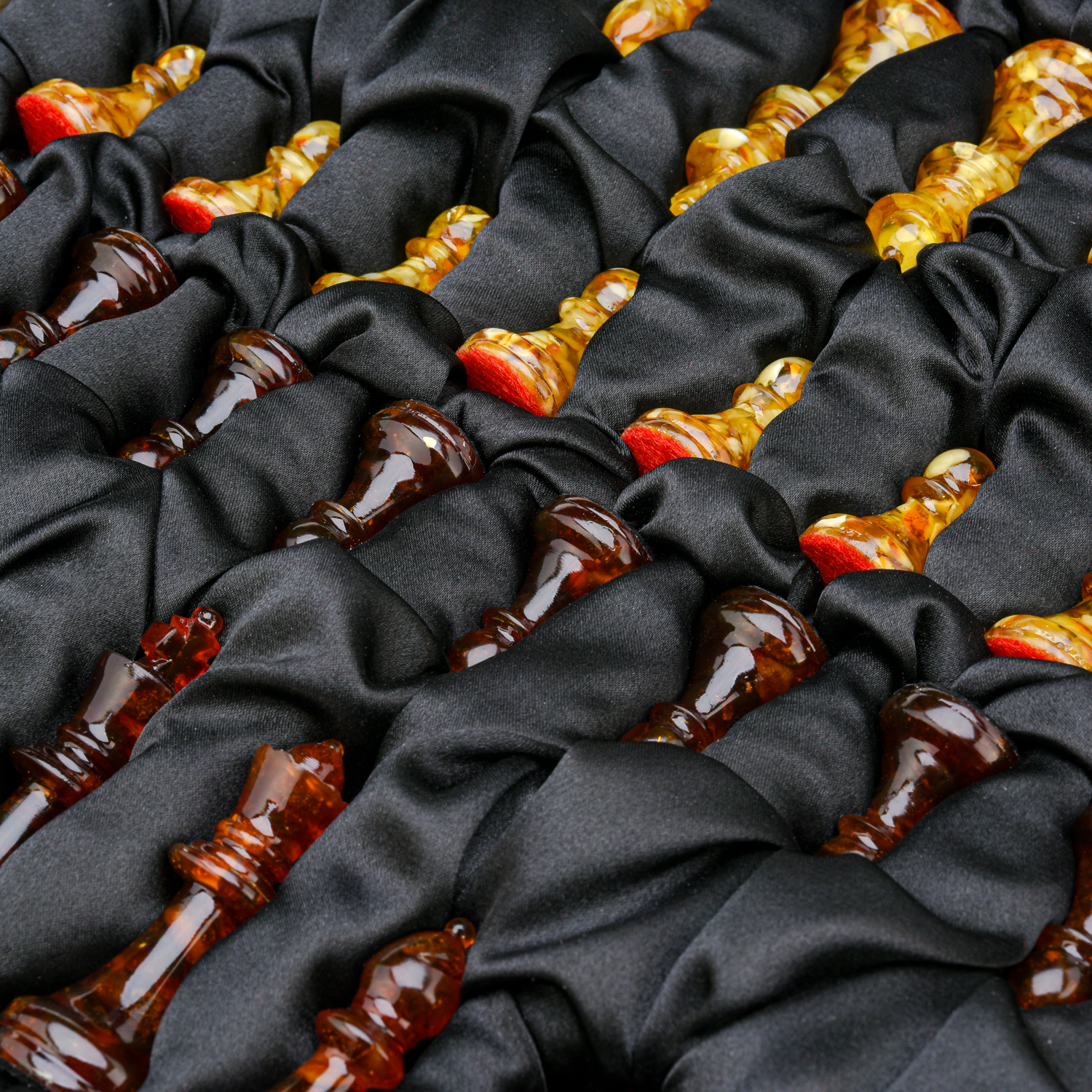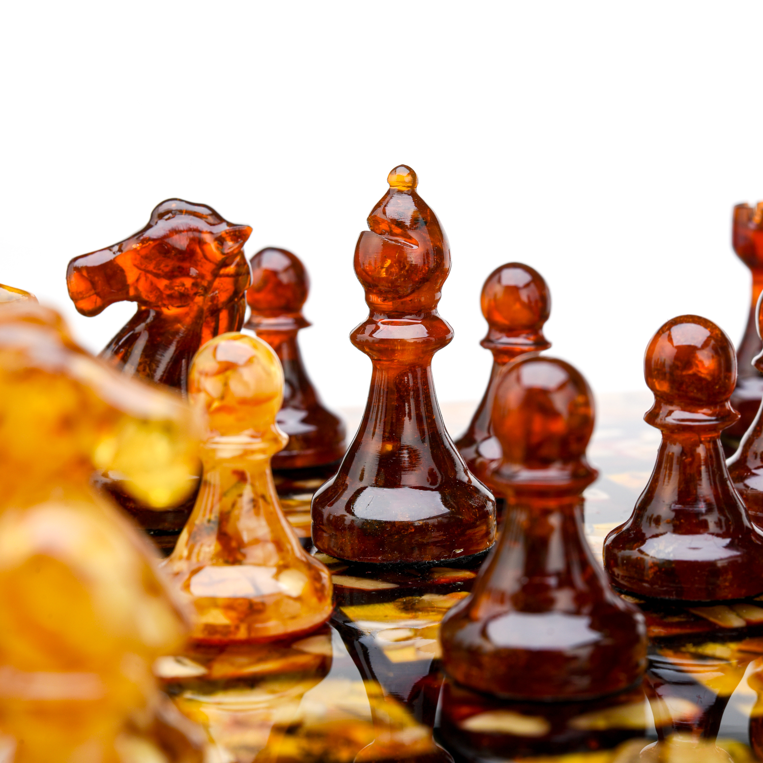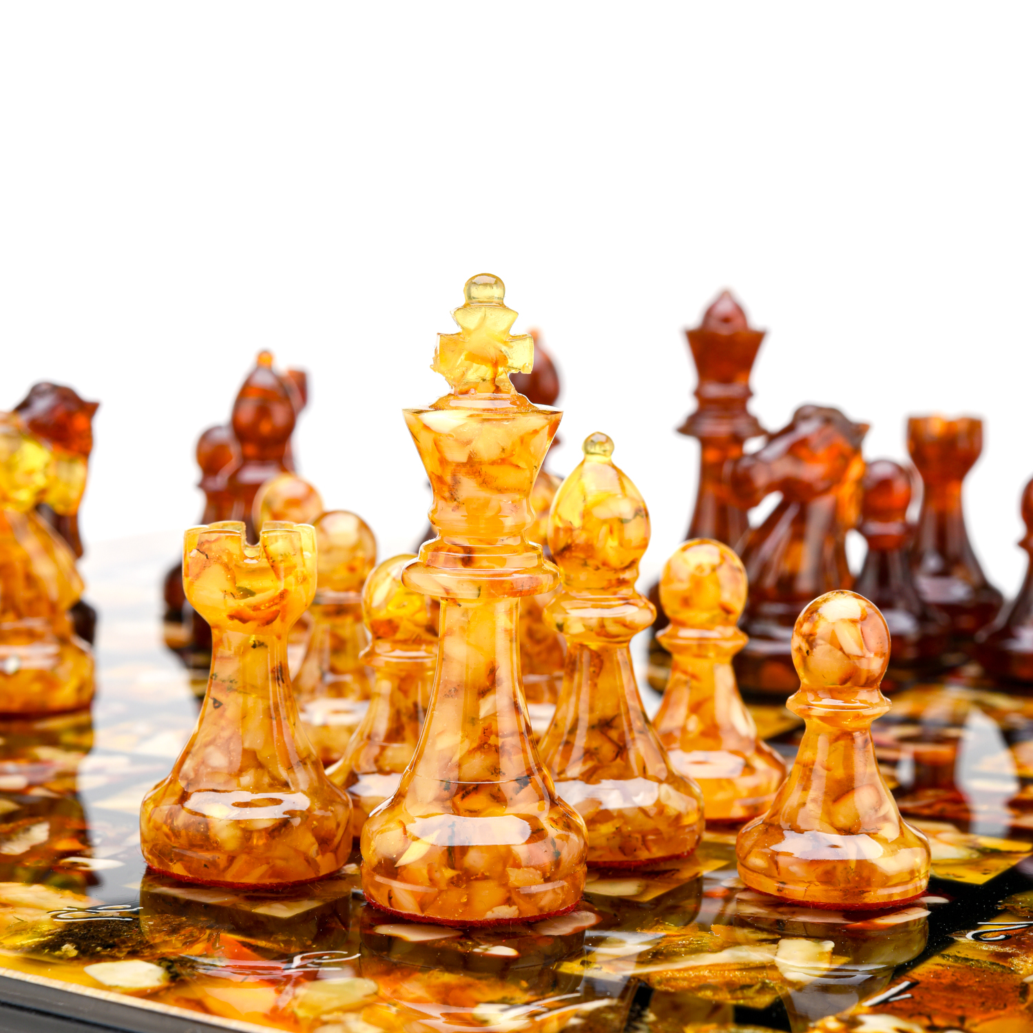 Шахматный ларец с инкрустацией и фигурами из янтаря.Материалы: дерево, янтарь, полиэфирная смола.