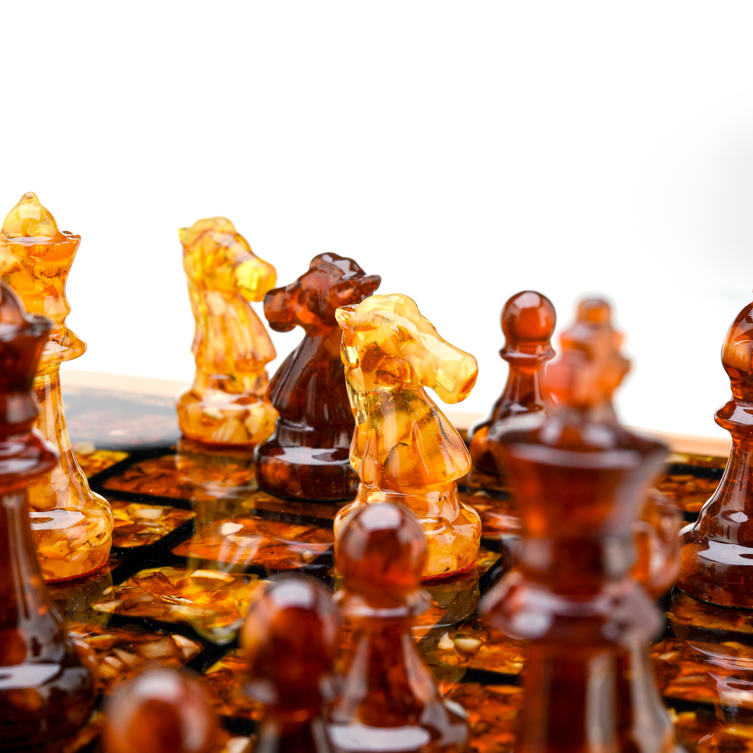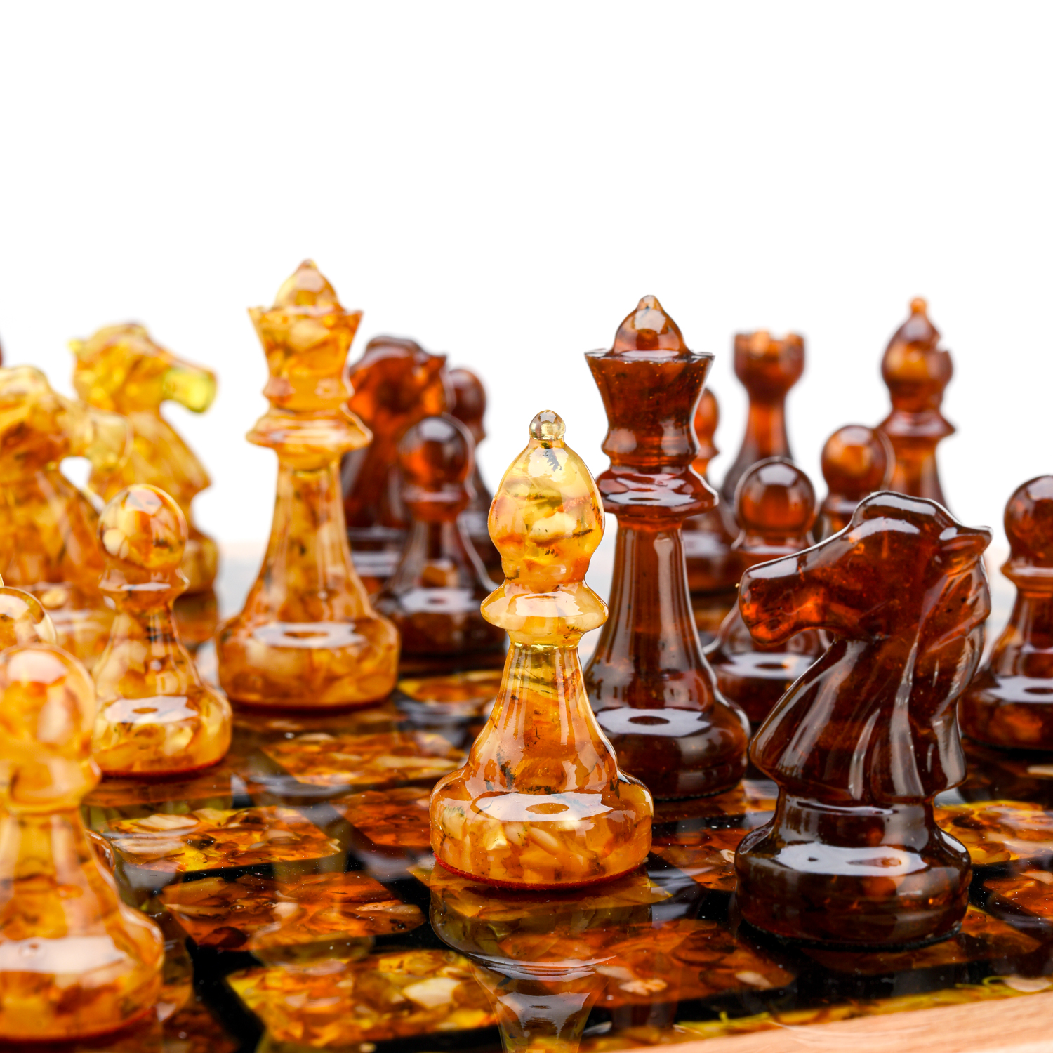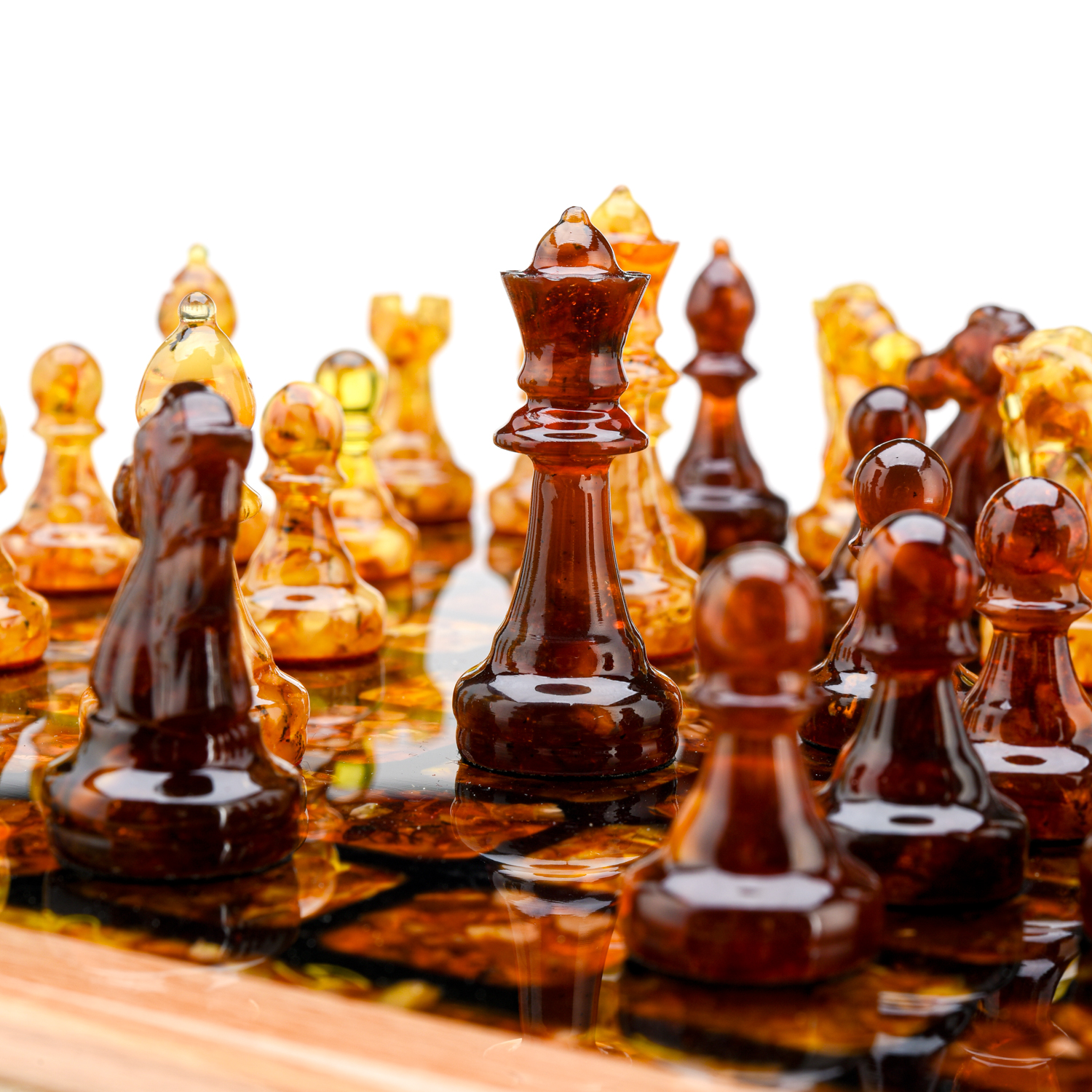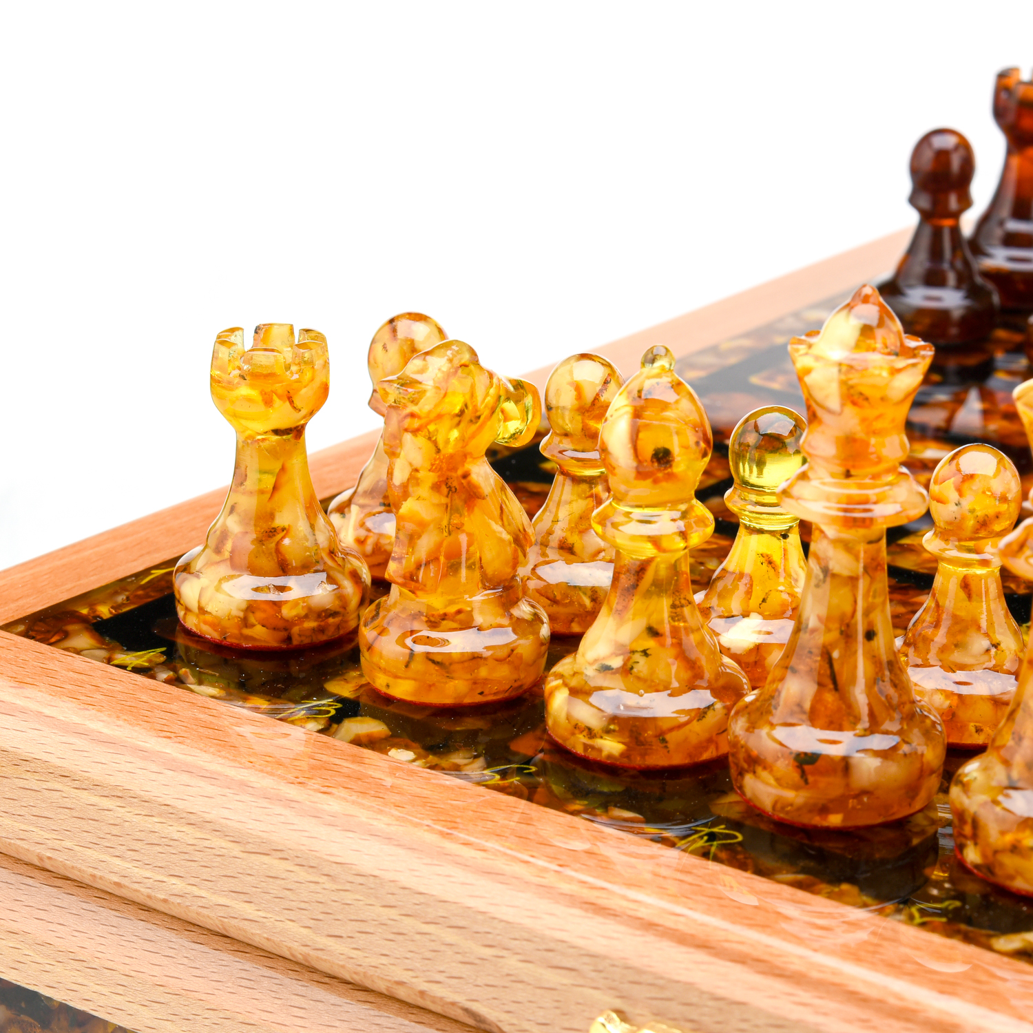 Шахматный ларец с инкрустацией и фигурами из янтаря.Материалы: дерево, янтарь, полиэфирная смола.