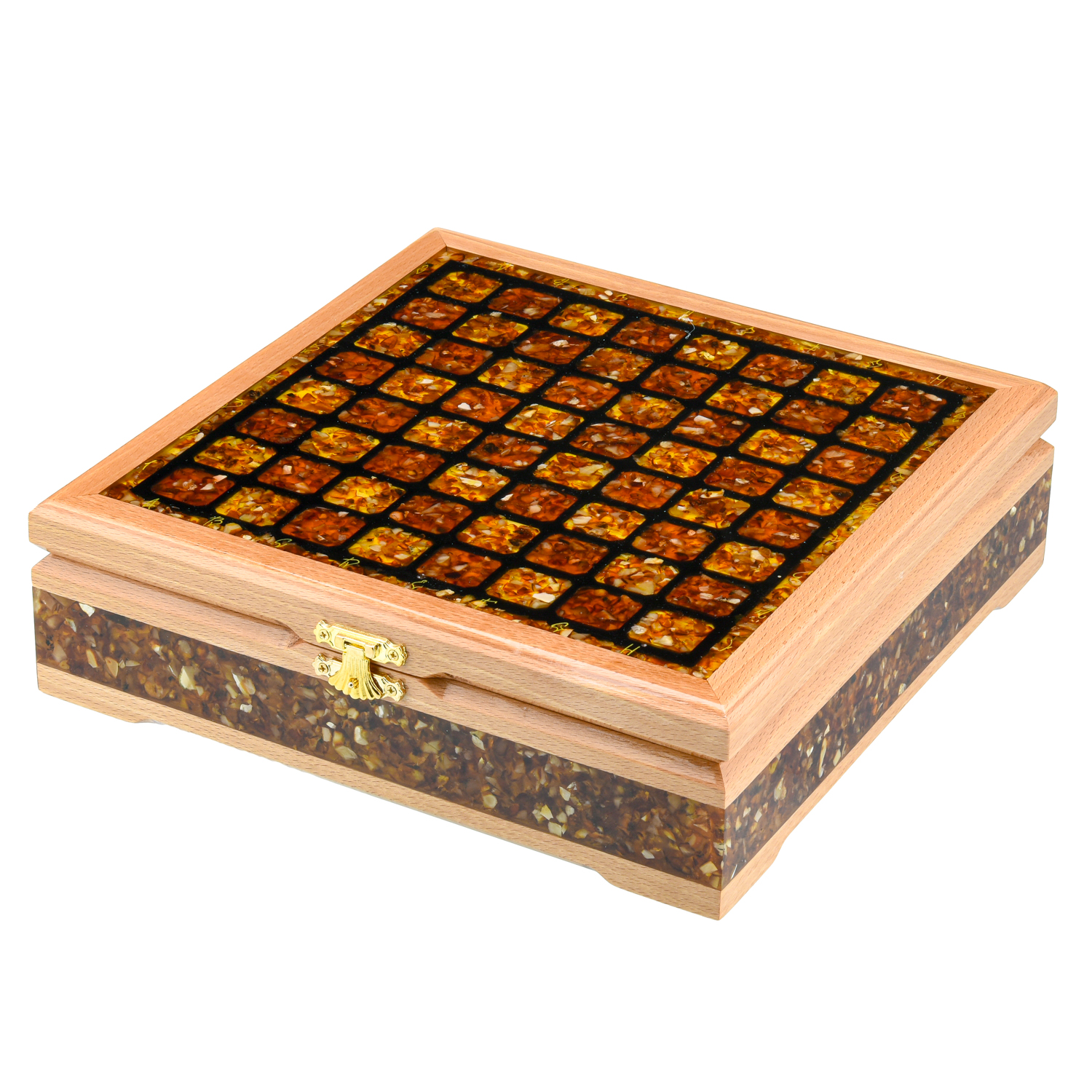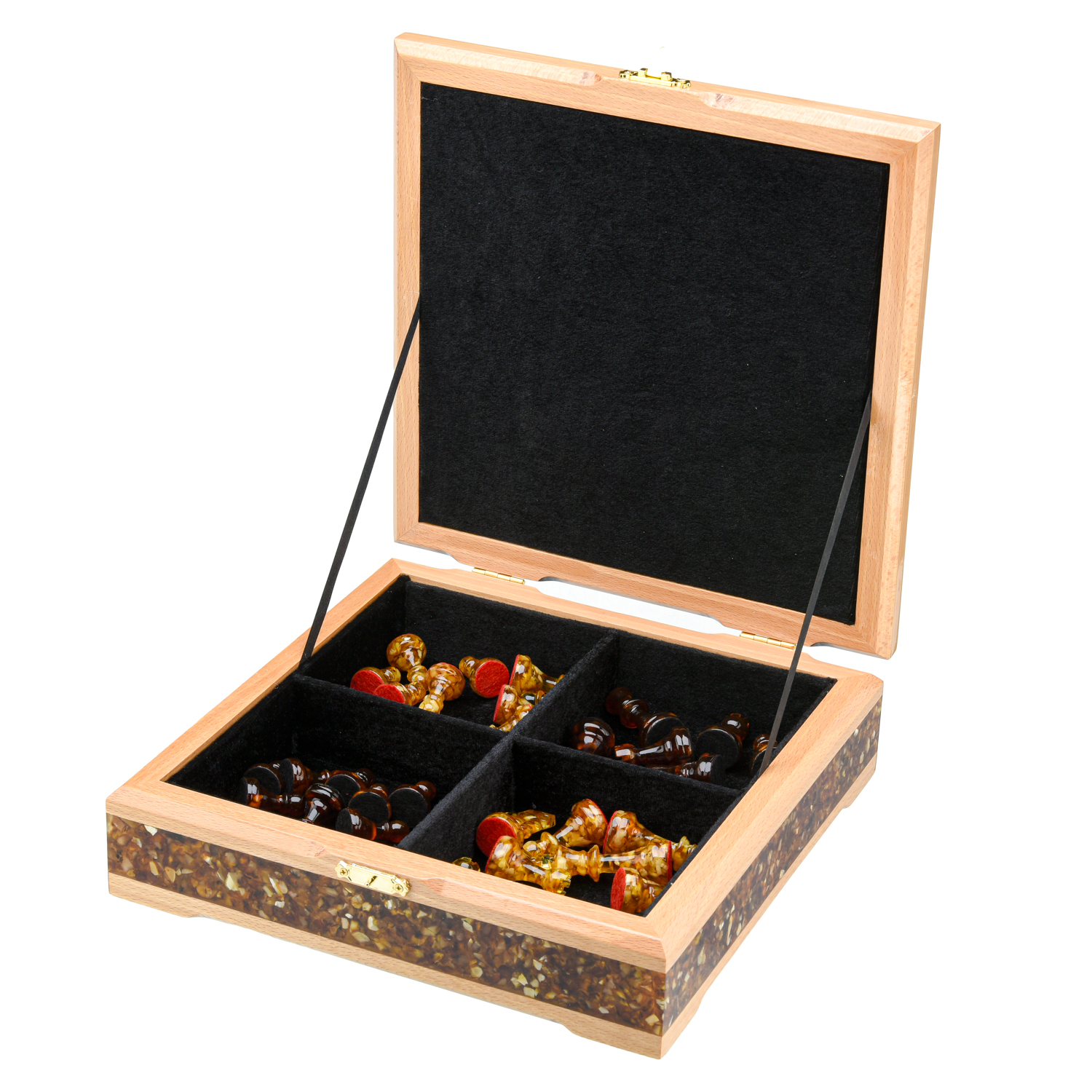 Шахматный ларец с инкрустацией и фигурами из янтаря 28х28 см