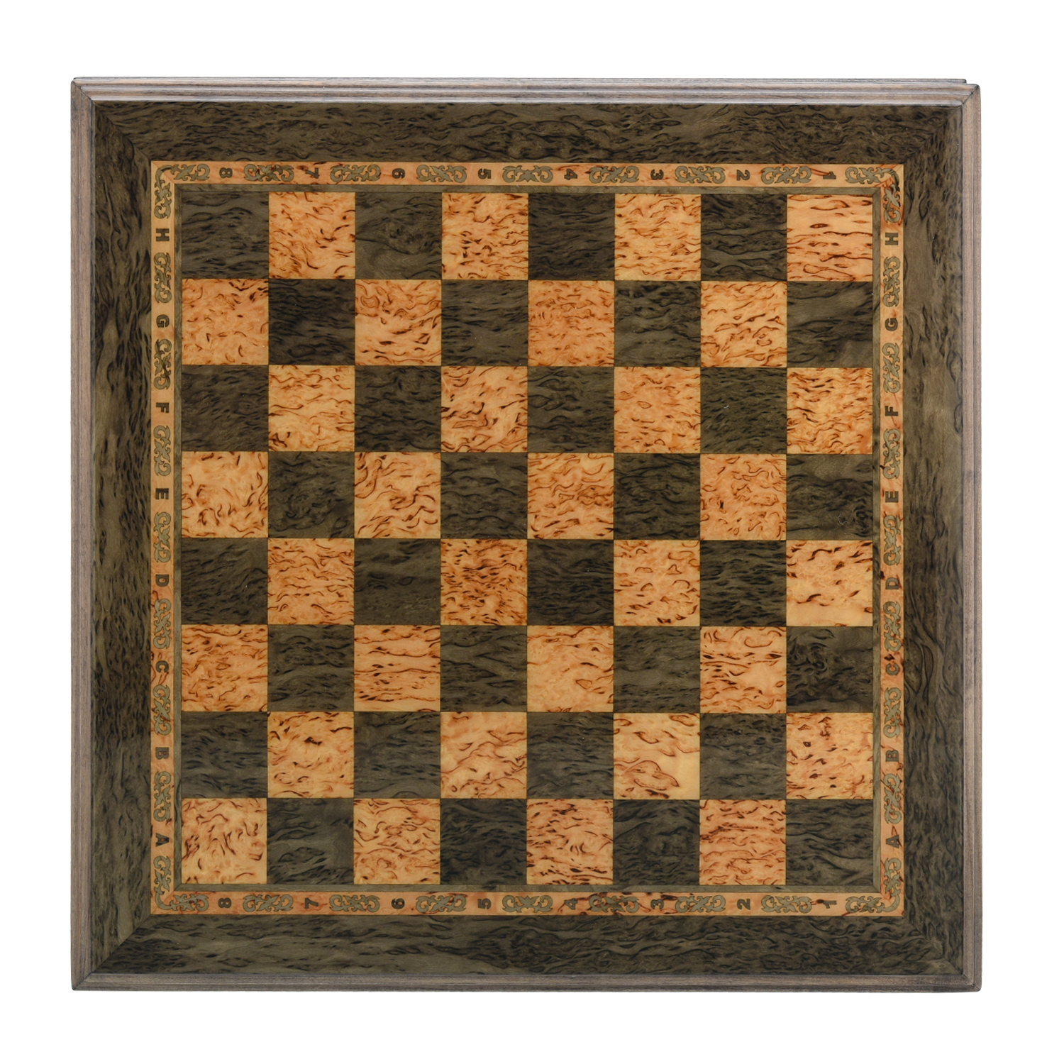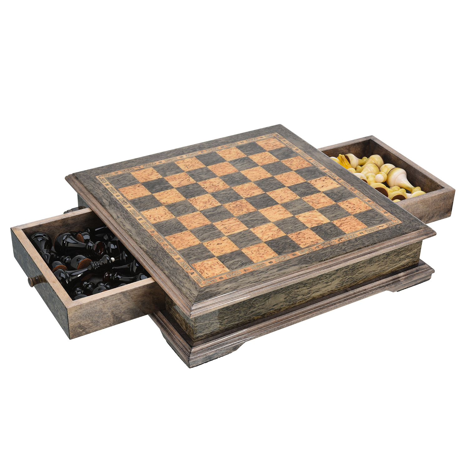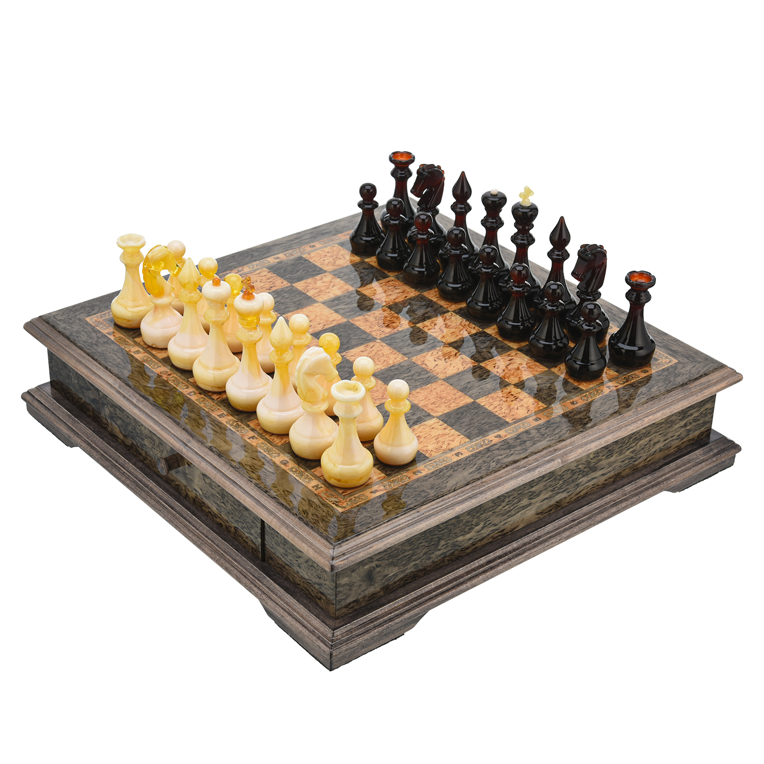 Шахматы из карельской березы с янтарными фигурами 38х38 см
