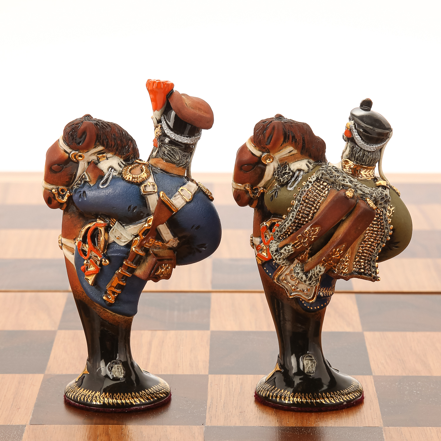 Колоритные шахматные фигурки оформлены в соответствии с оригинальными и причудливыми авторскими эскизами из твердого, не пористого фарфора, который называют "русским белым золотом". Поверхность каждой фигуры расписана вручную разноцветными красками в технике подглазурной росписи. Роспись защищена слоями прозрачной стеклянной глазури. Эффектная и стойкая позолота нанесена тонкой кистью поверх нее.
