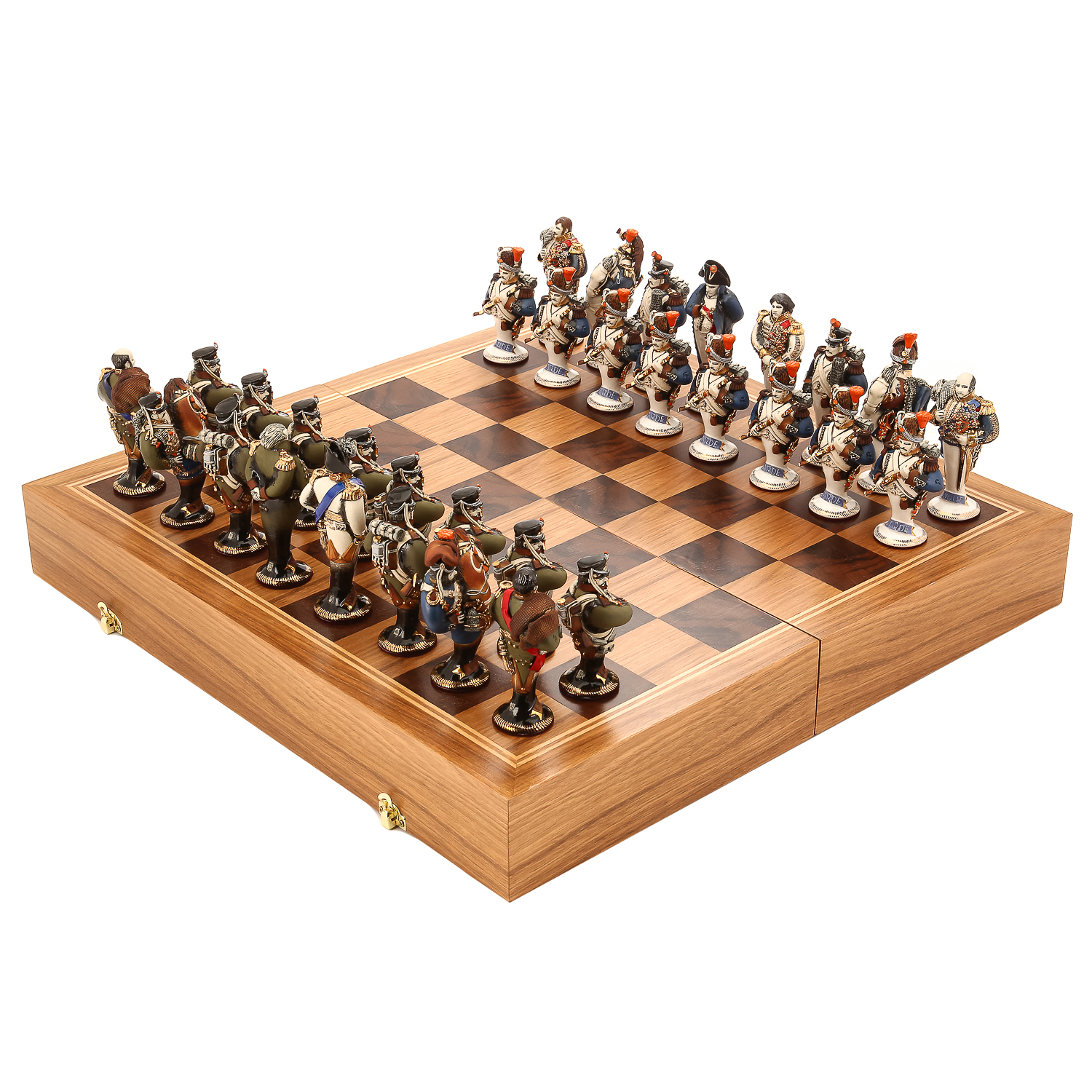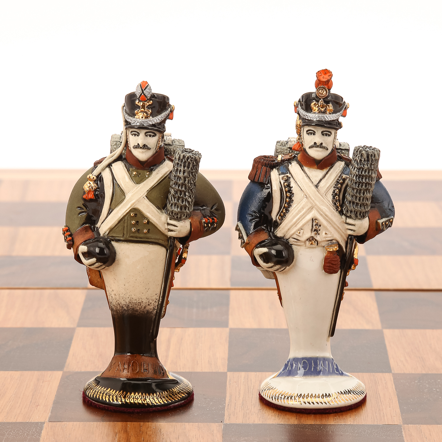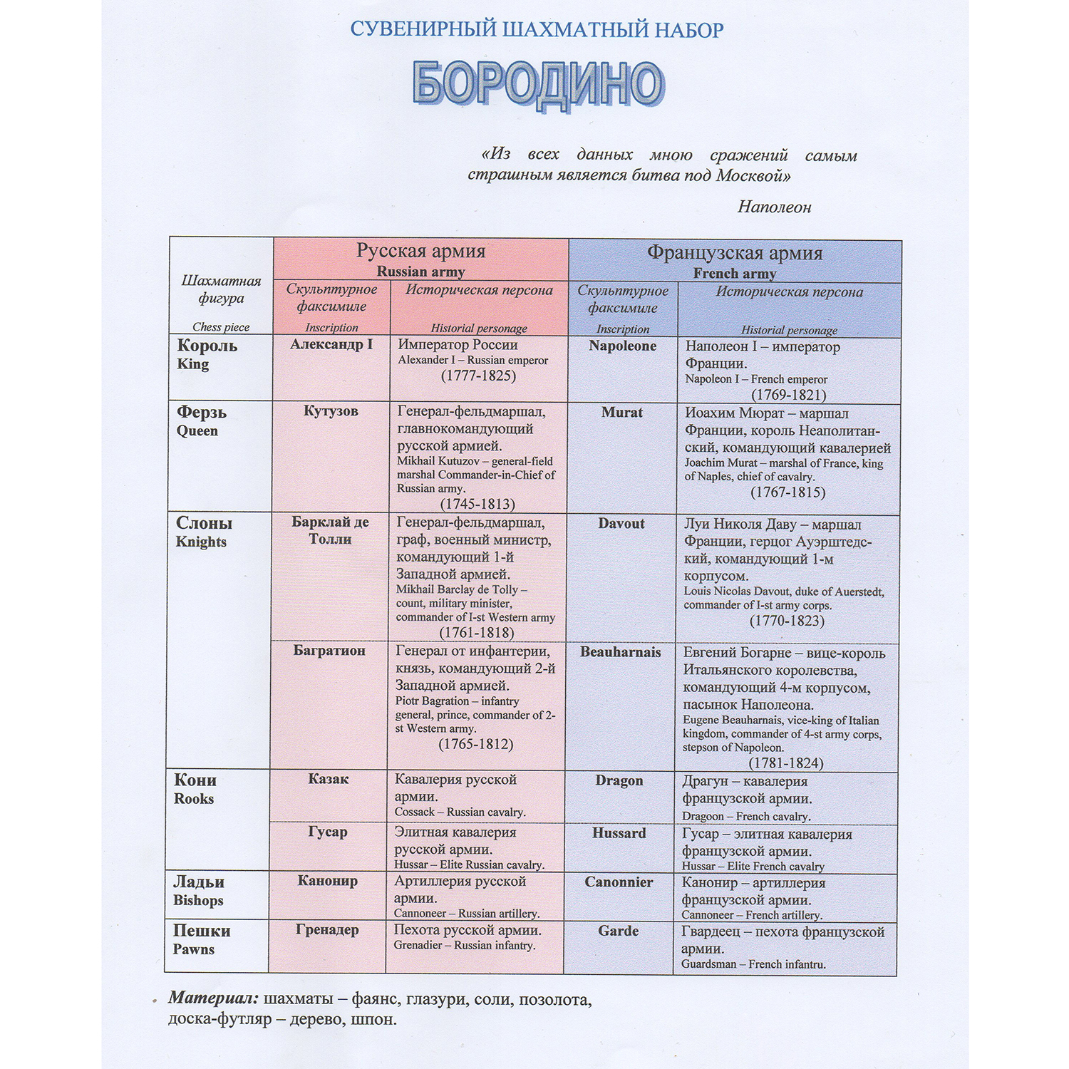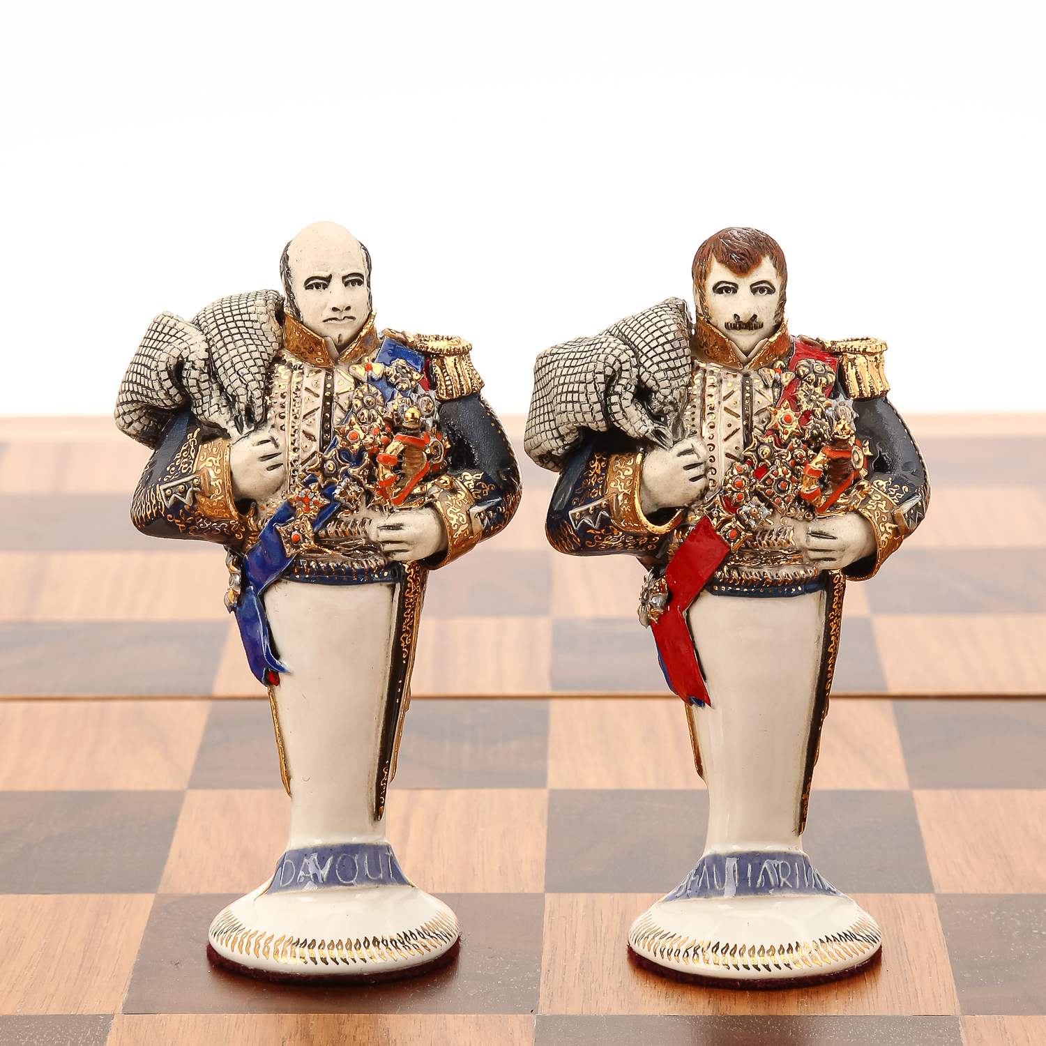 Оригинальная художественная концепция этих шахмат и мастерство исполнения определяют их стоимость. Шахматные фигуры - это высококлассные образцы работы российского художника по фарфору. На поле доски - войска Наполеона и Александра I. Образы воинов русской и французской армий отличаются высокой детализацией. Фигурки являются штучными интерьерными аксессуарами.Стоя на шахматной доске, шахматные фигуры воссоздают дух кровавой исторической битвы, прошедшей в Подмосковье близ Москвы-реки в конце августа 1812 года. Шахматы представлены в единственном экземпляре.
