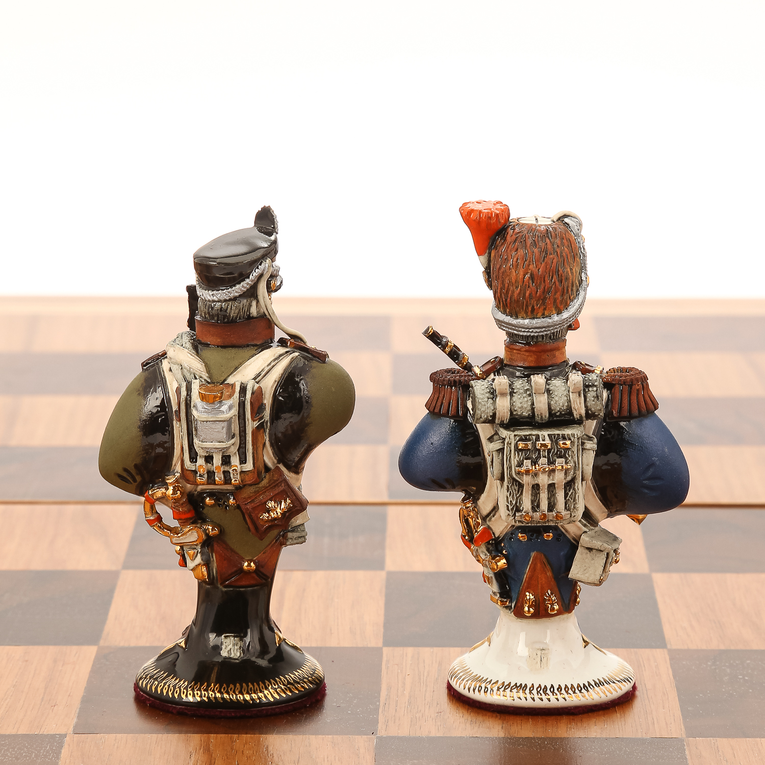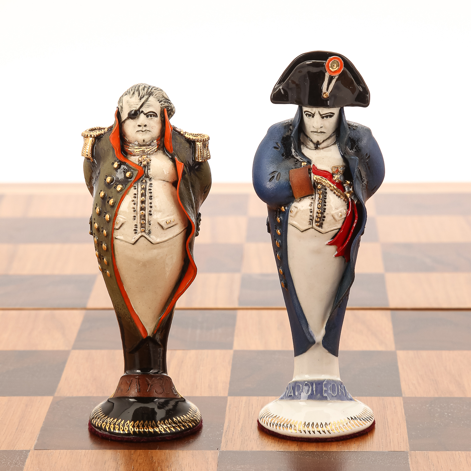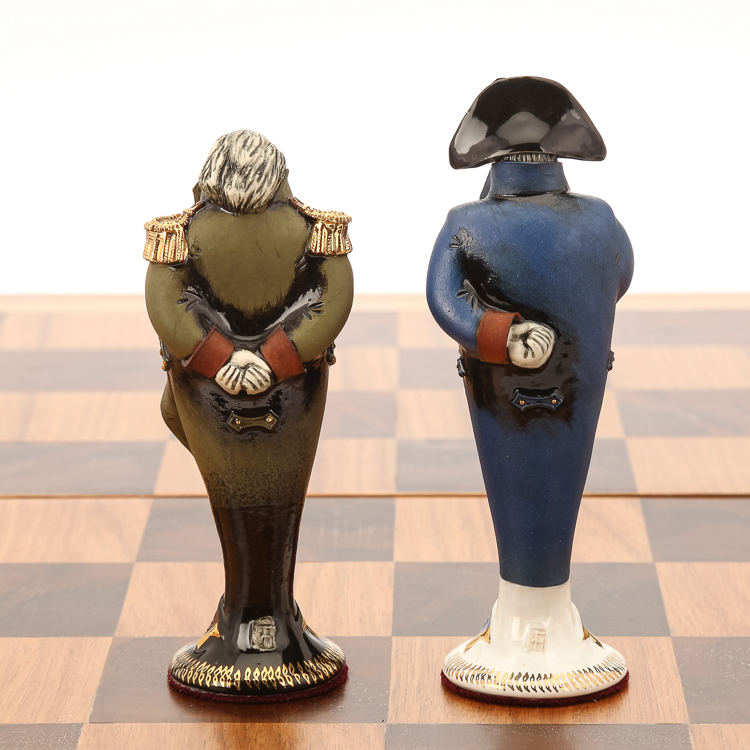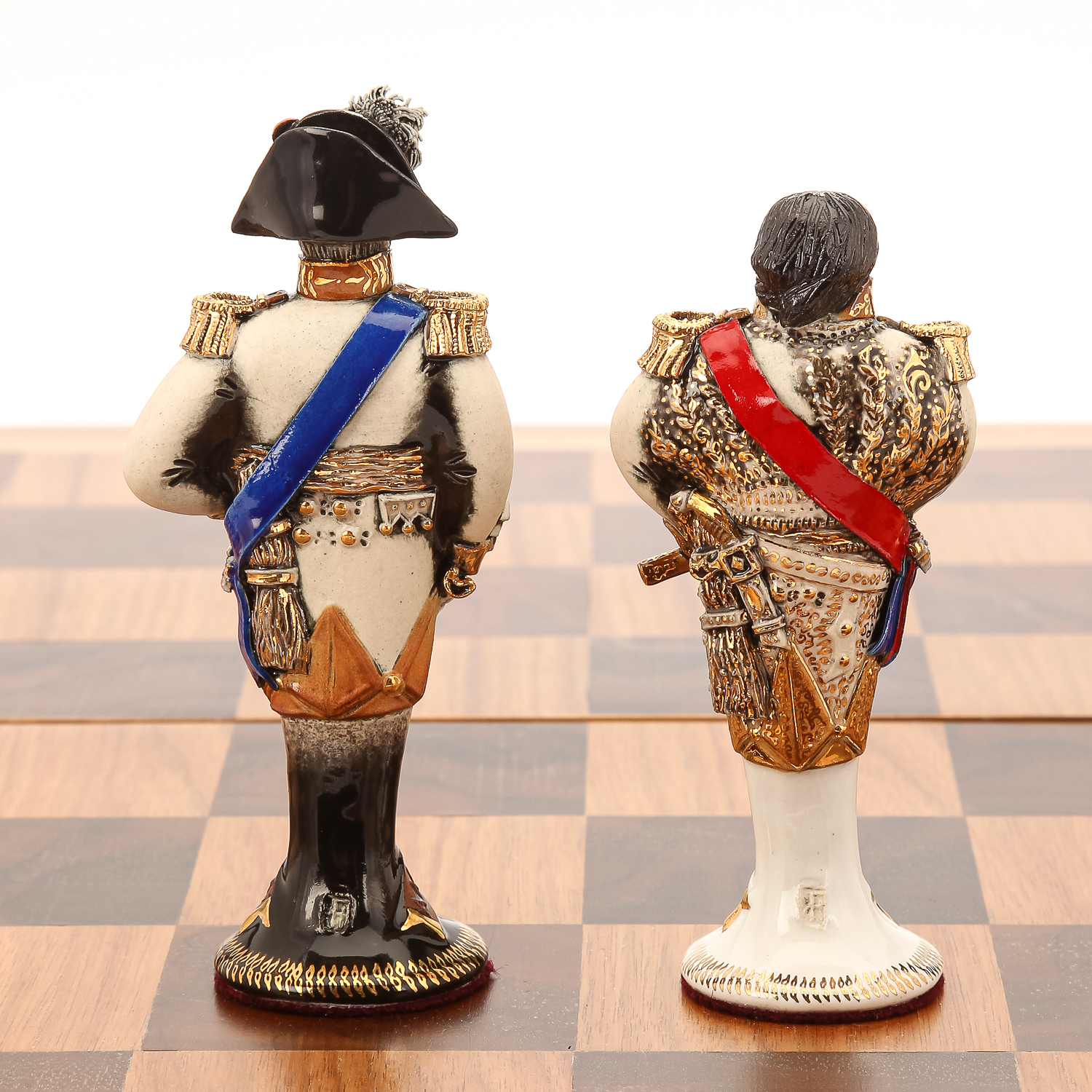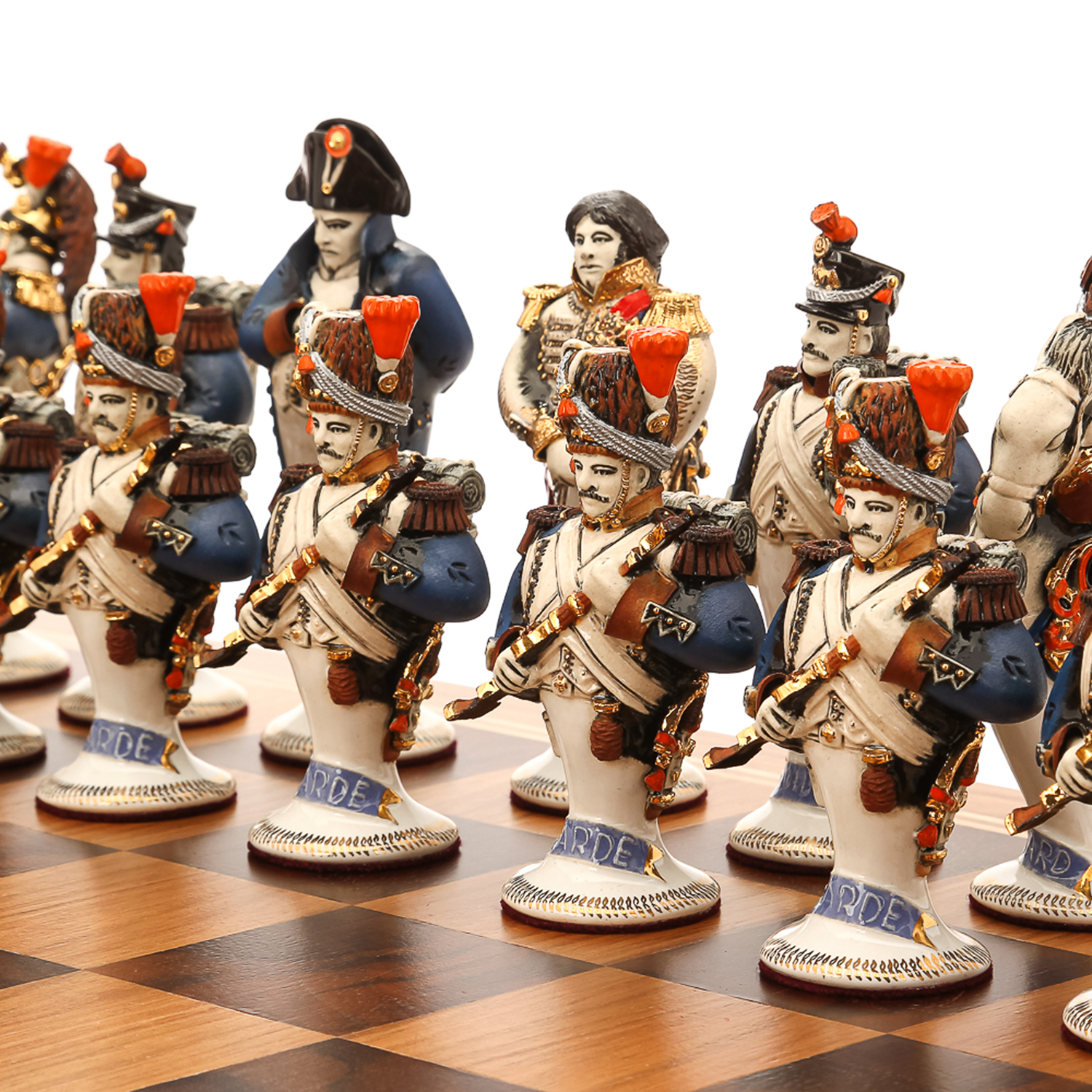 Оригинальная художественная концепция этих шахмат и мастерство исполнения определяют их стоимость. Шахматные фигуры - это высококлассные образцы работы российского художника по фарфору. На поле доски - войска Наполеона и Александра I. Образы воинов русской и французской армий отличаются высокой детализацией. Фигурки являются штучными интерьерными аксессуарами.Стоя на шахматной доске, шахматные фигуры воссоздают дух кровавой исторической битвы, прошедшей в Подмосковье близ Москвы-реки в конце августа 1812 года. Шахматы представлены в единственном экземпляре.