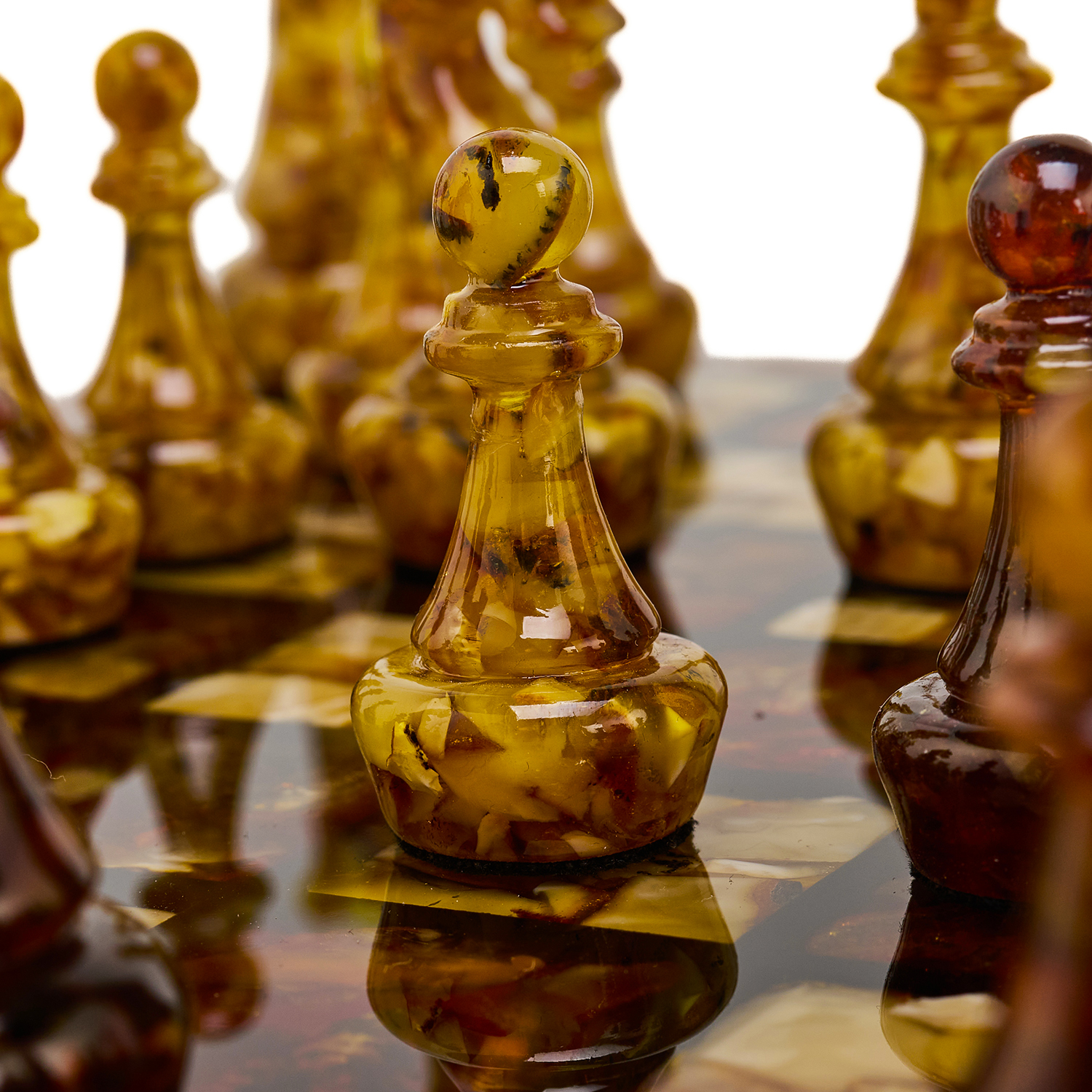 Шахматы с инкрустацией и фигурами из янтаря.Материалы: дерево, янтарь, полиэфирная смола.