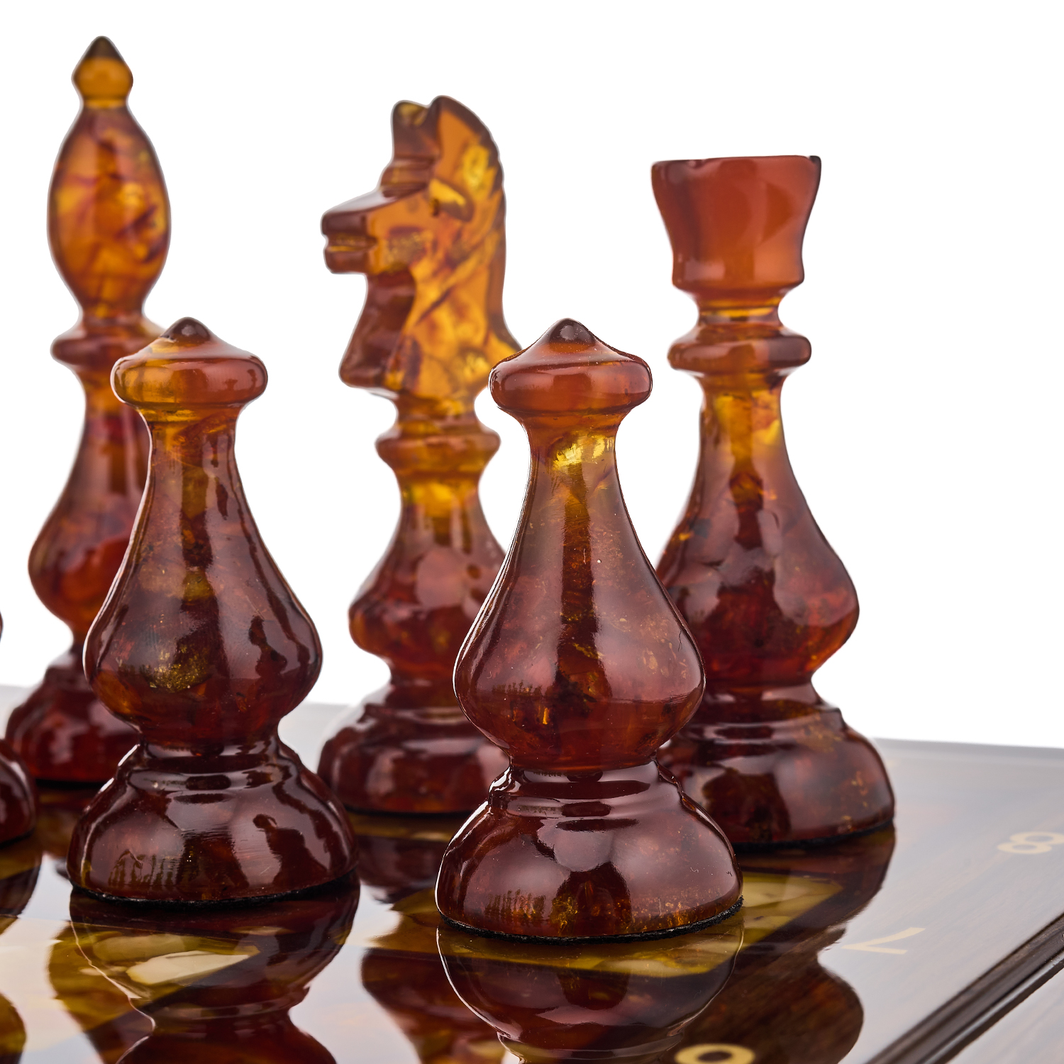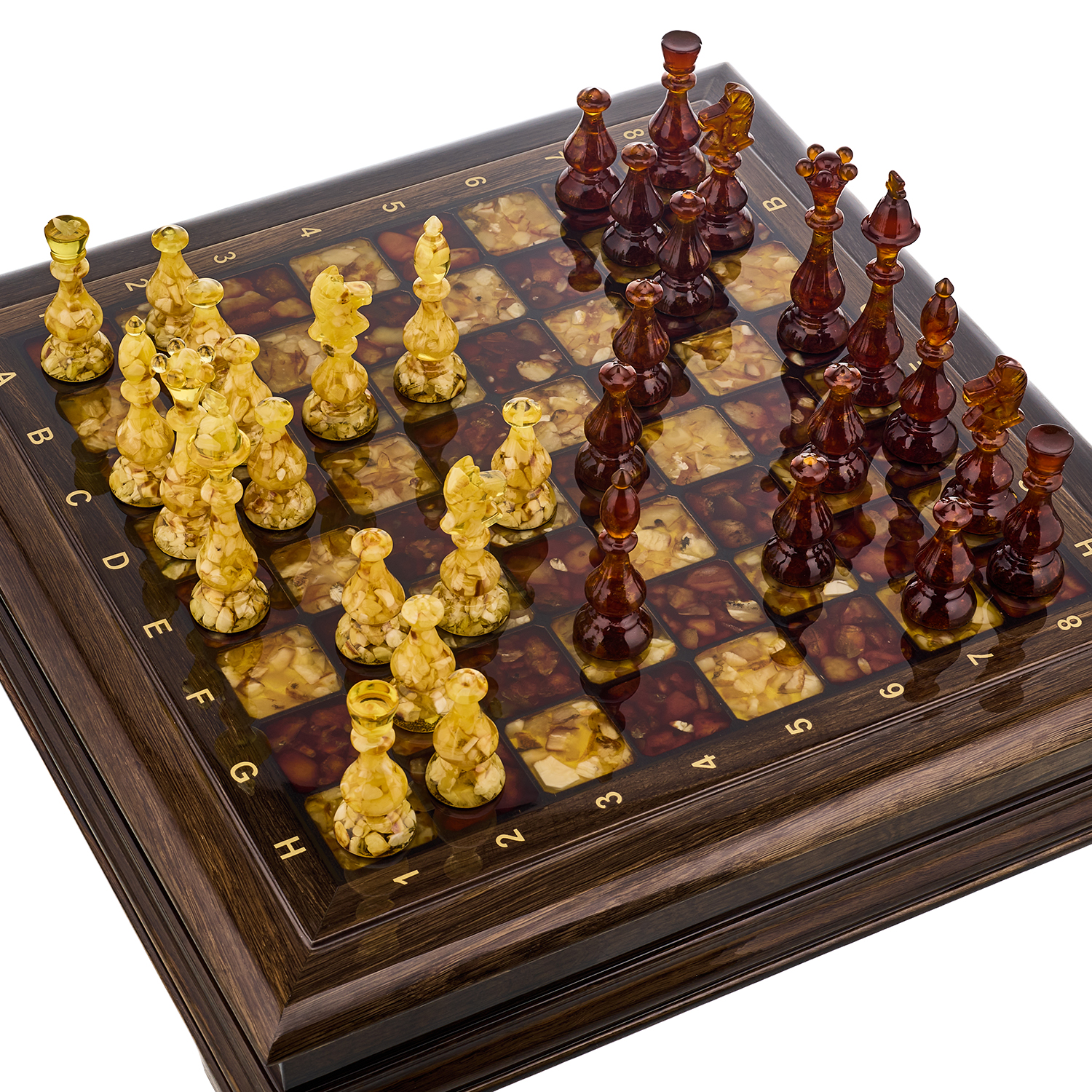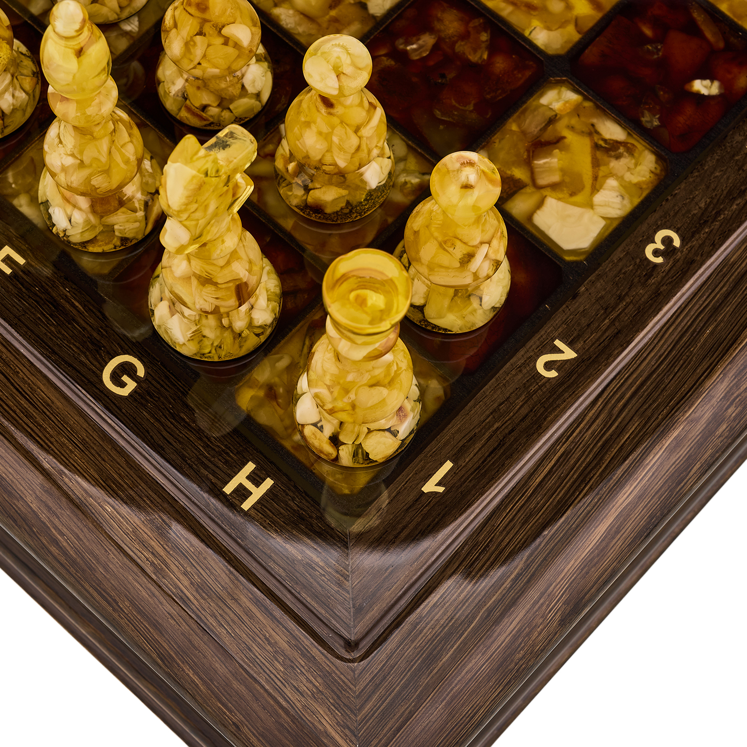 Шахматы из мореного дуба с янтарными фигурами 45х45 см