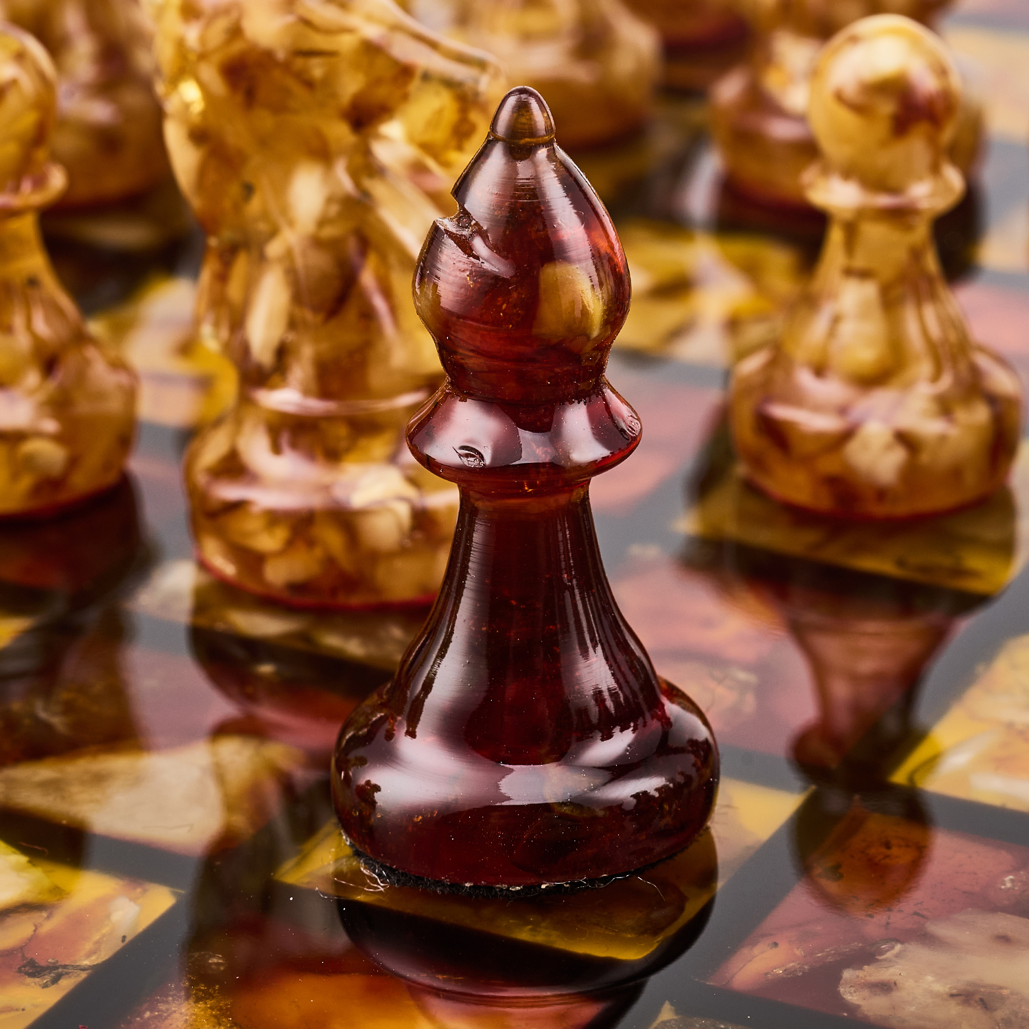 Шахматы с инкрустацией и фигурами из янтаря.Материалы: дерево, янтарь, полиэфирная смола.
