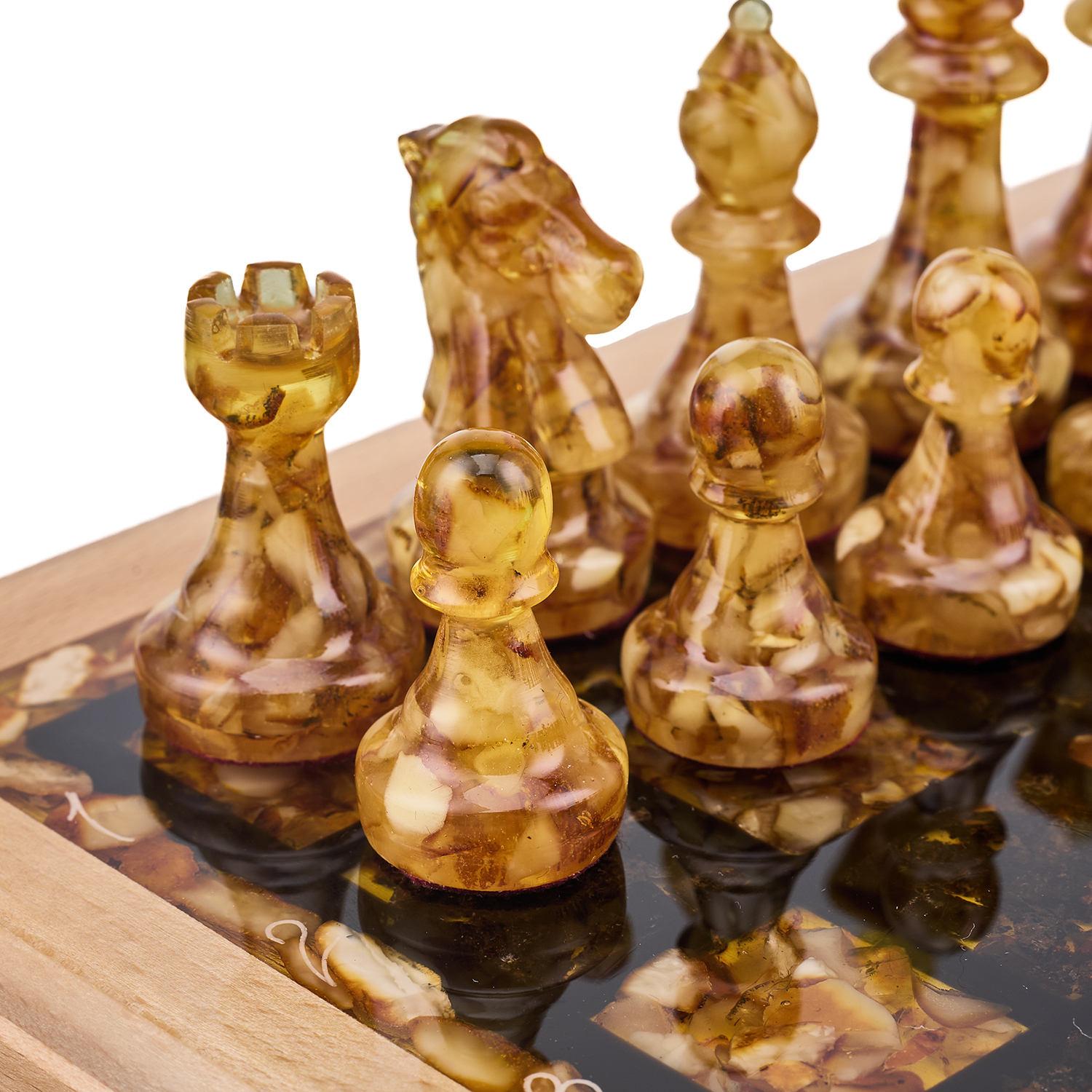 Шахматы с инкрустацией и фигурами из янтаря.Материалы: дуб, ясень, янтарь, полиэфирная смола.
