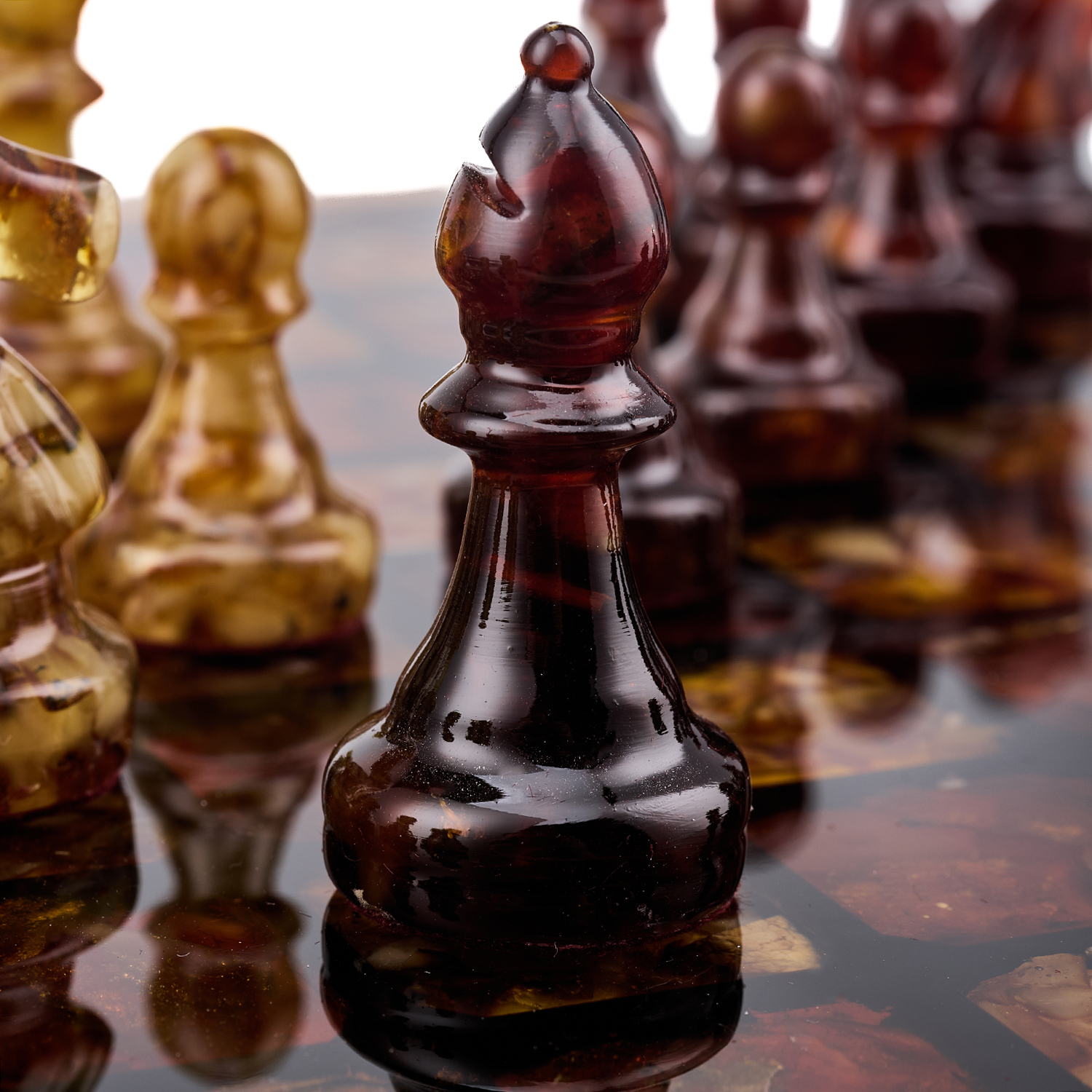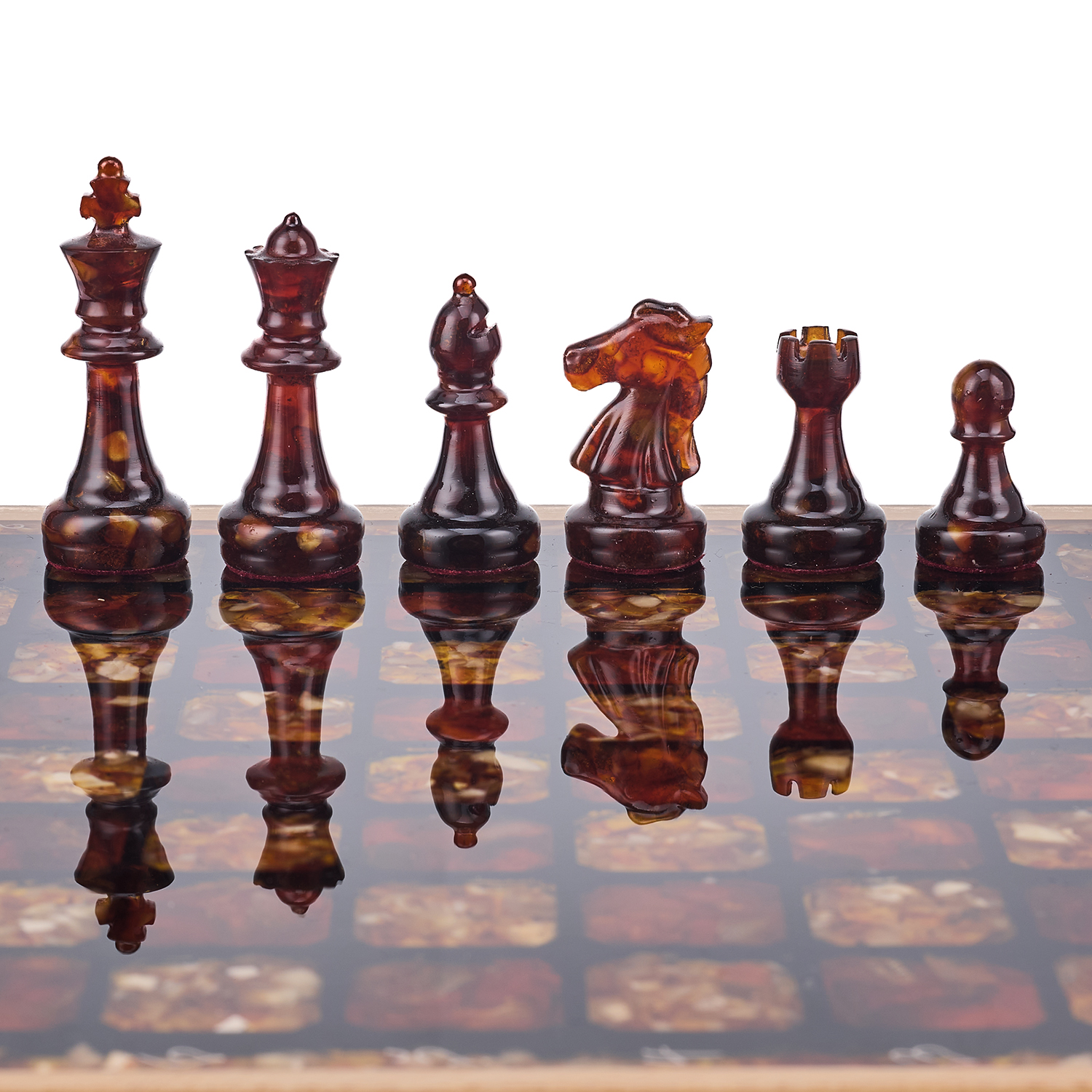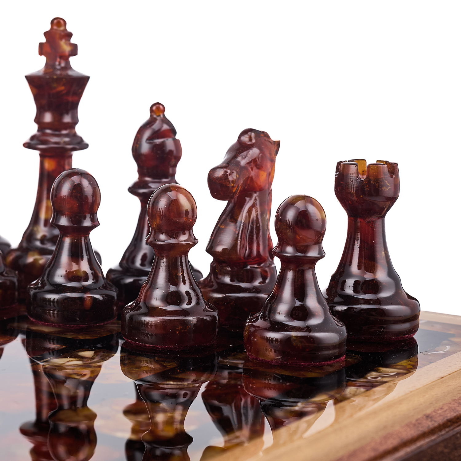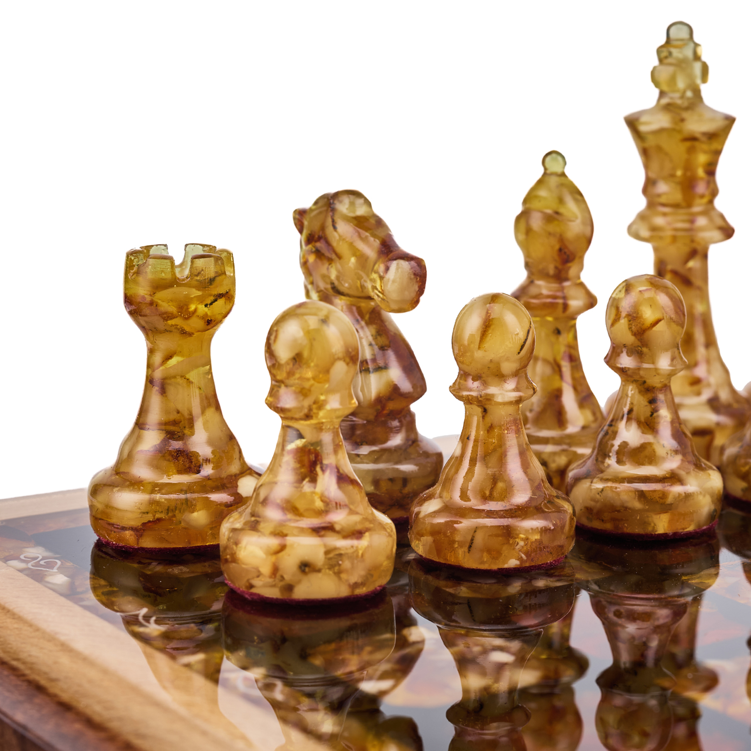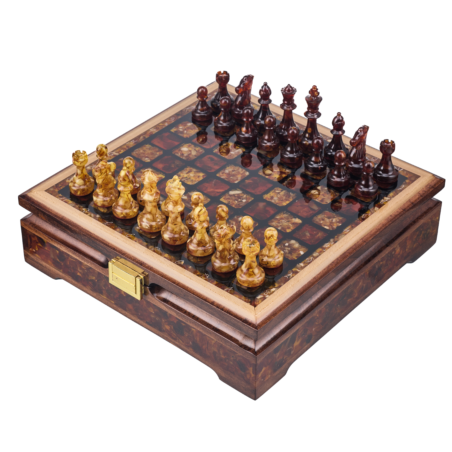 Шахматы с инкрустацией и фигурами из янтаря 28х28 см