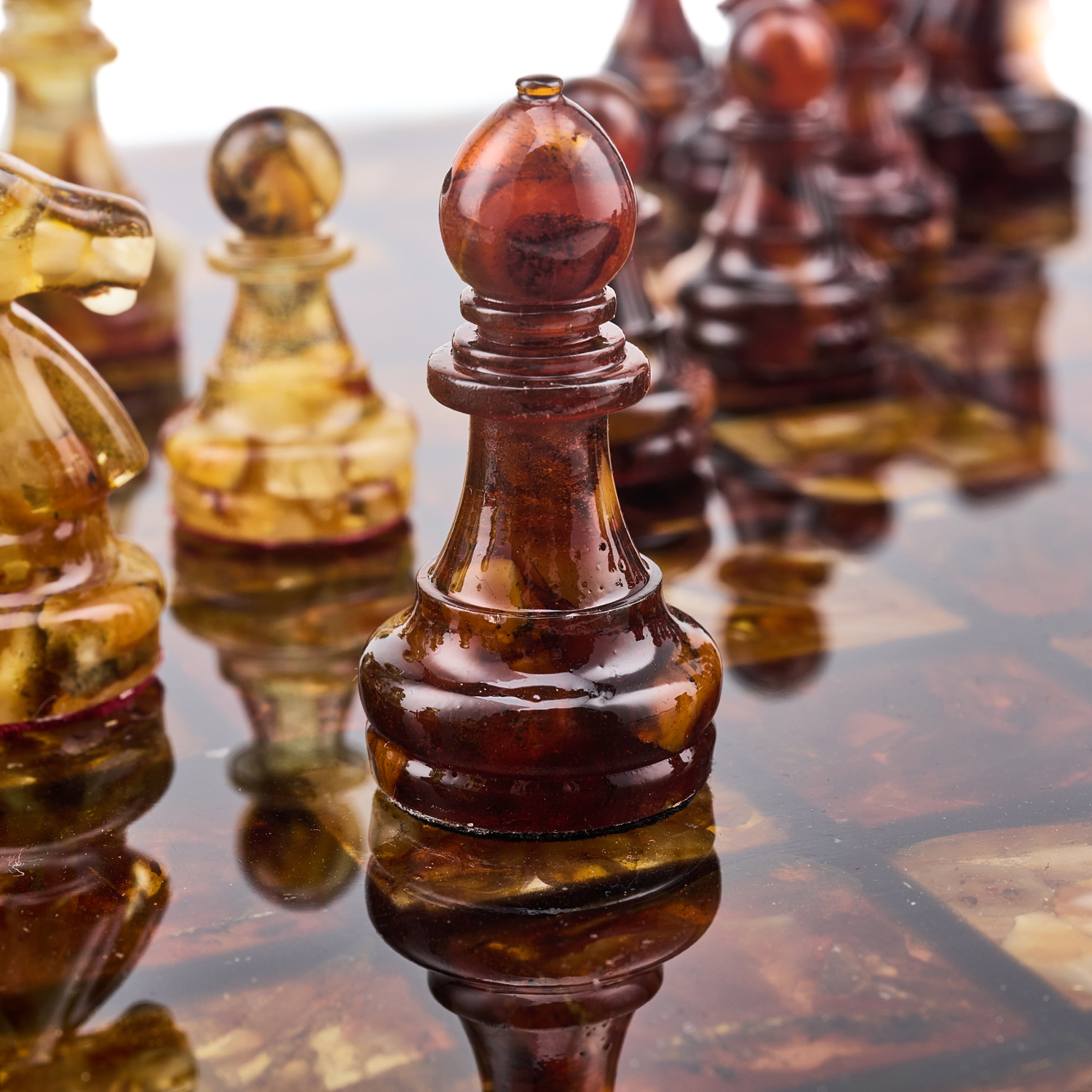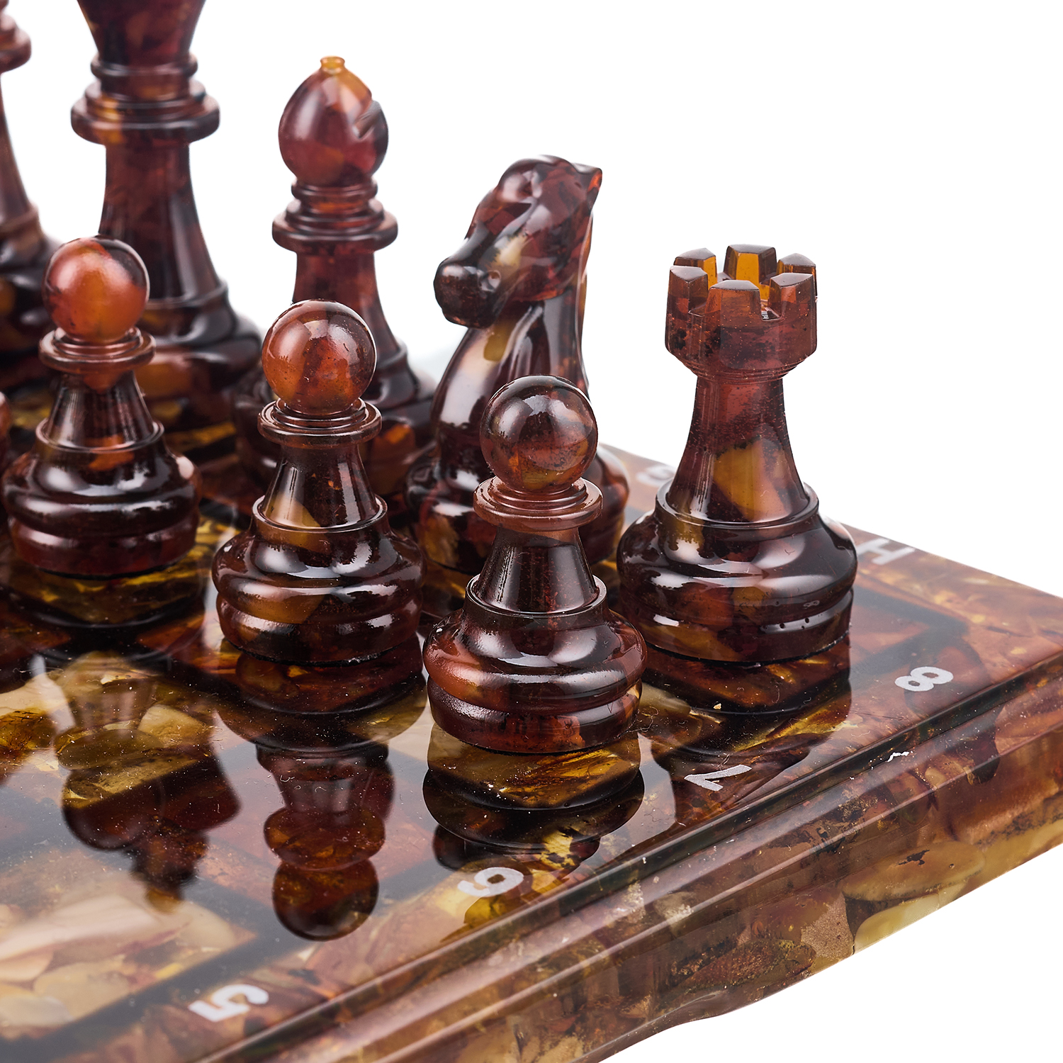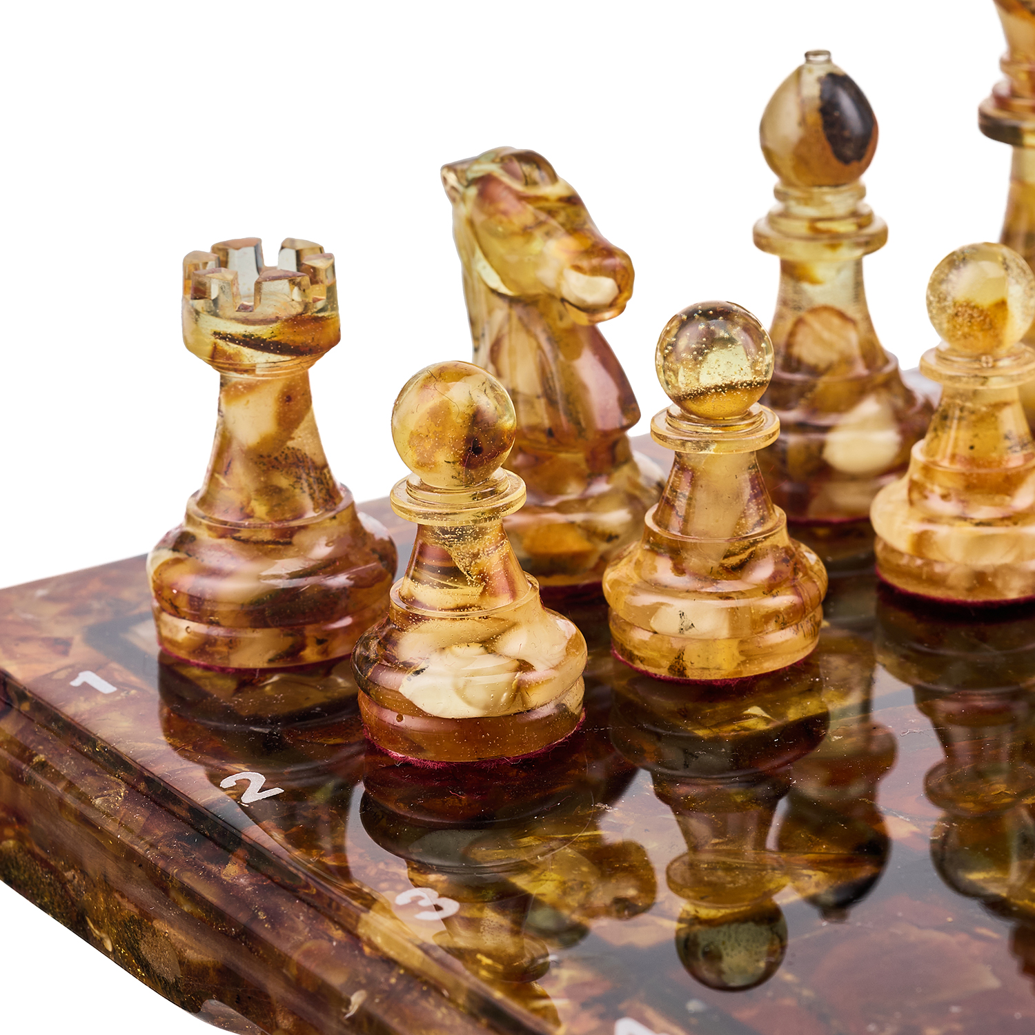 Шахматы с янтарными фигурами.Материалы: янтарь, полиэфирная смола.