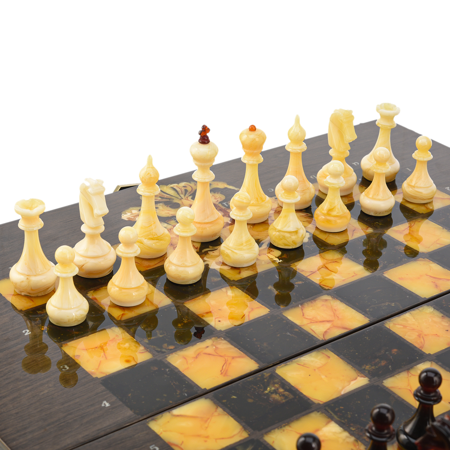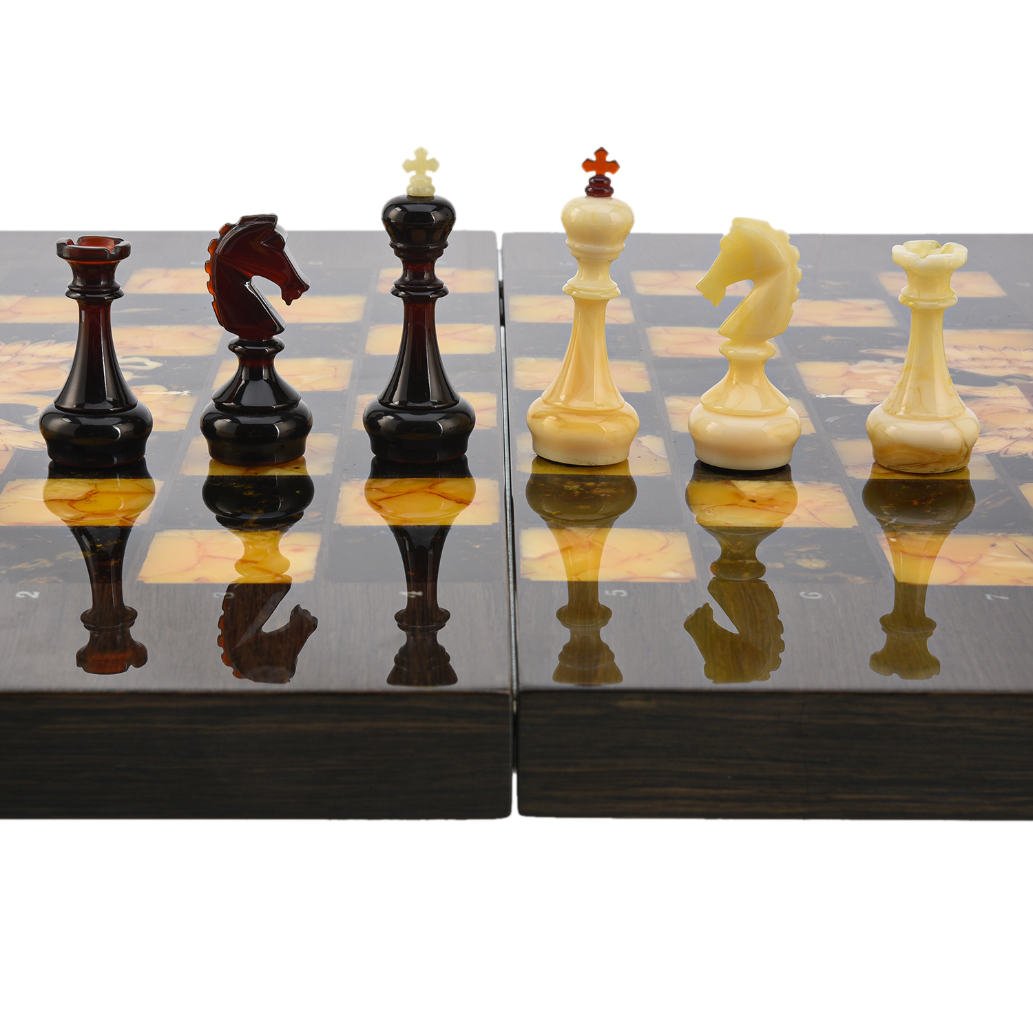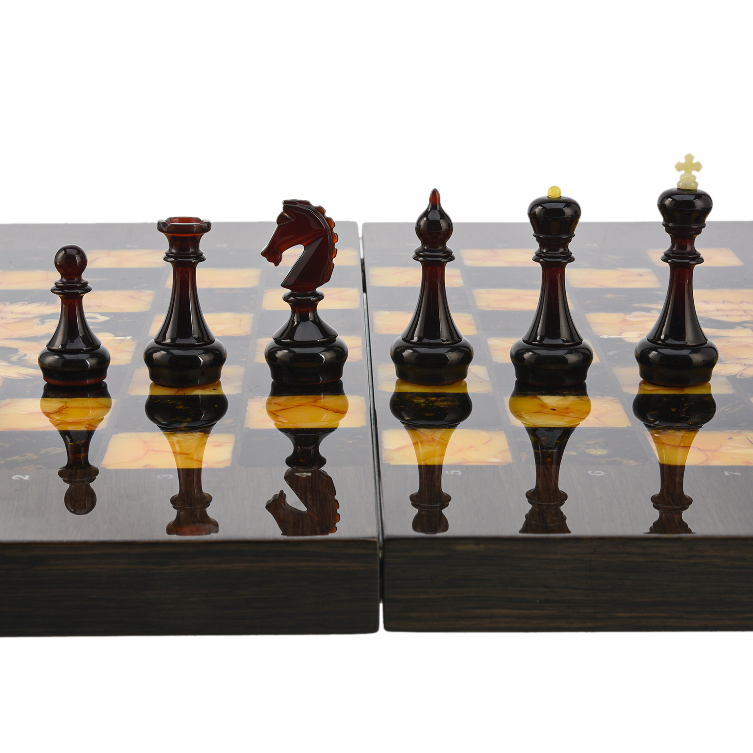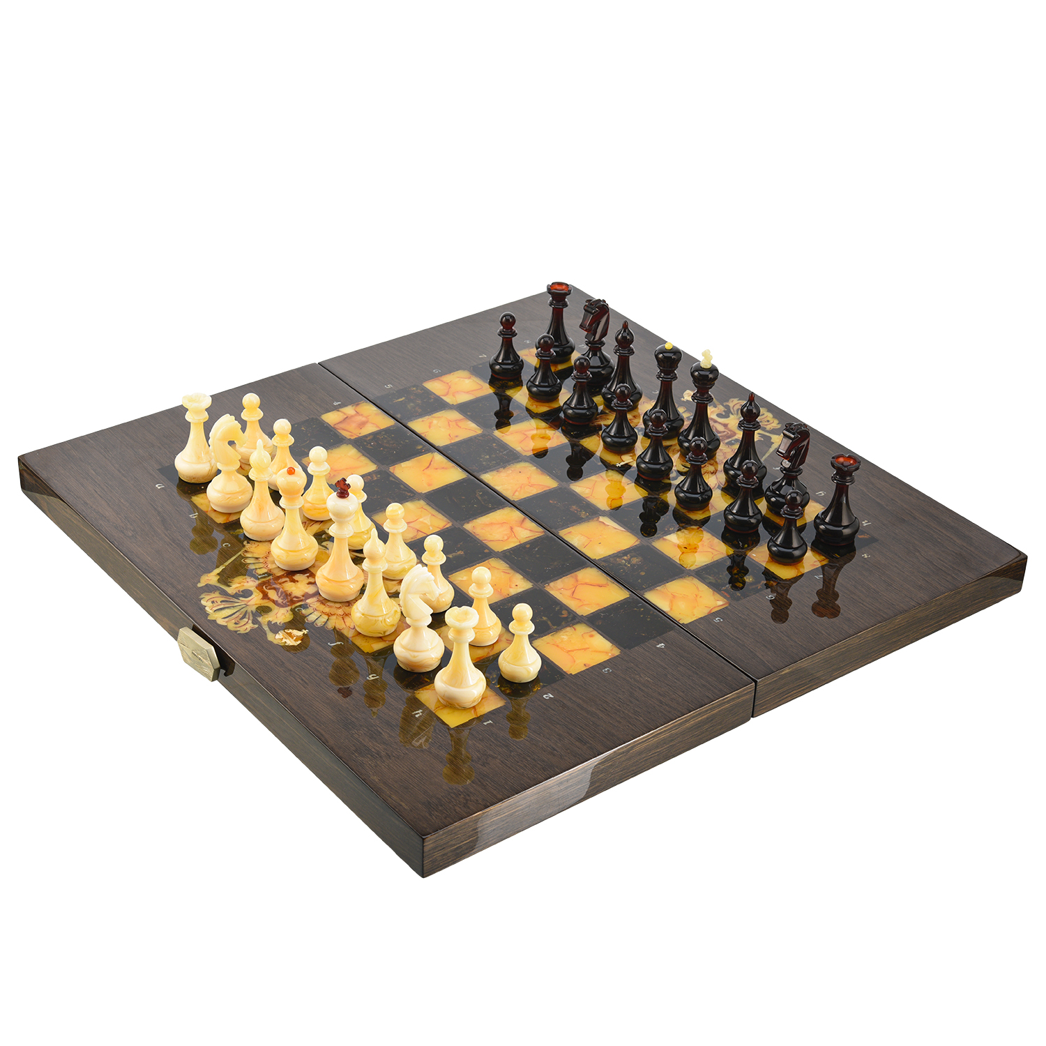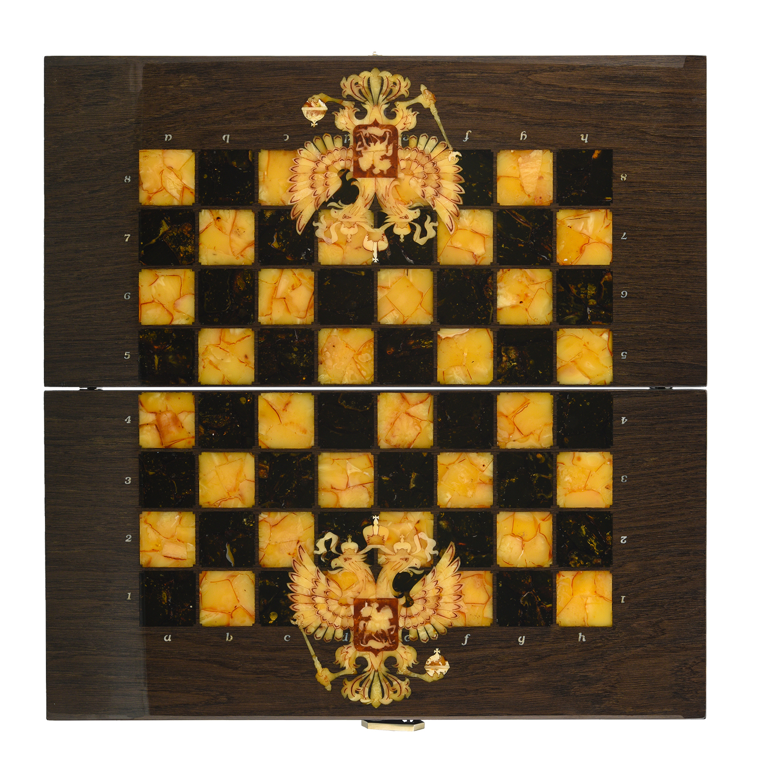 Шахматы с янтарными фигурами "Герб РФ".Материалы: мореный дуб, янтарь.