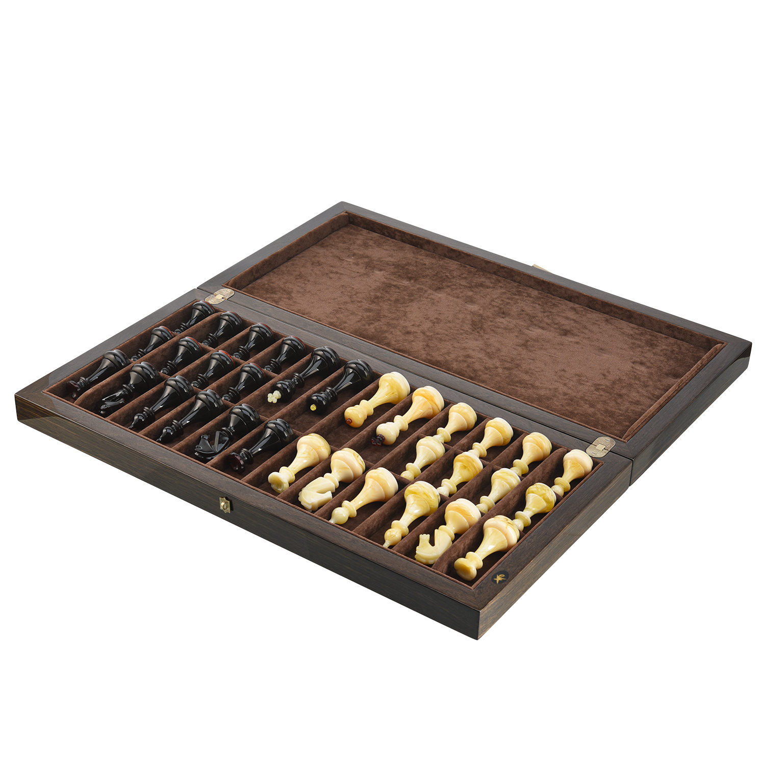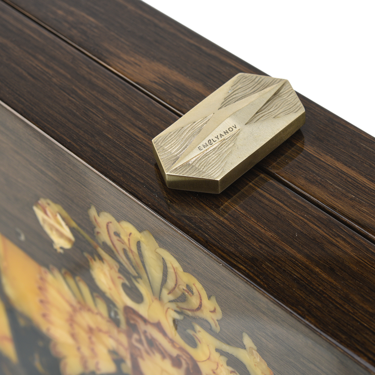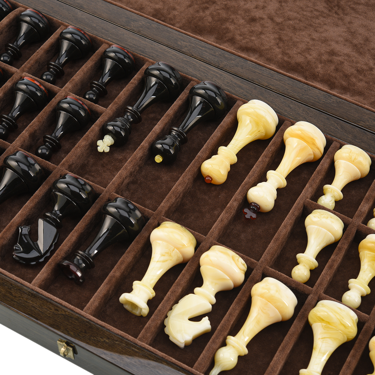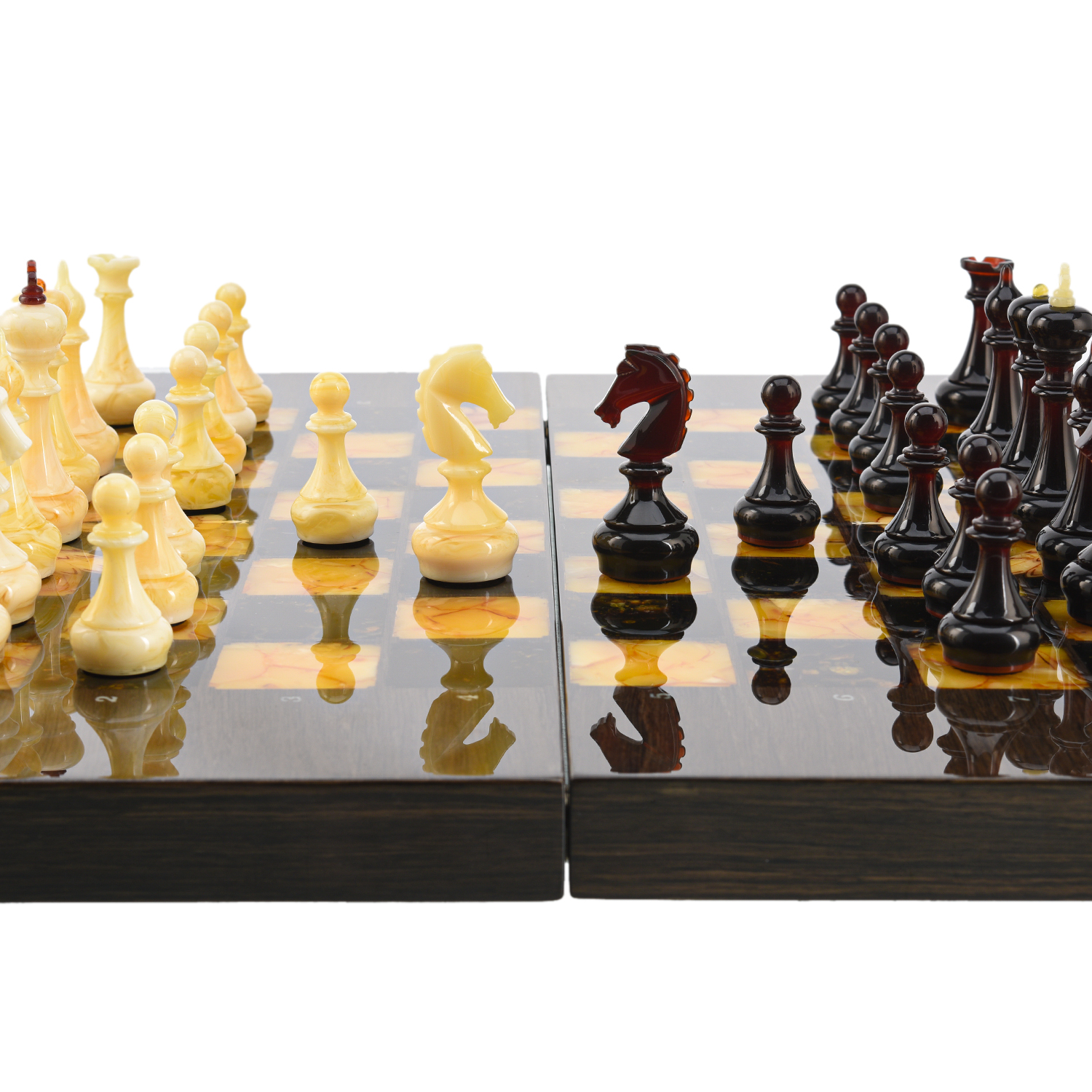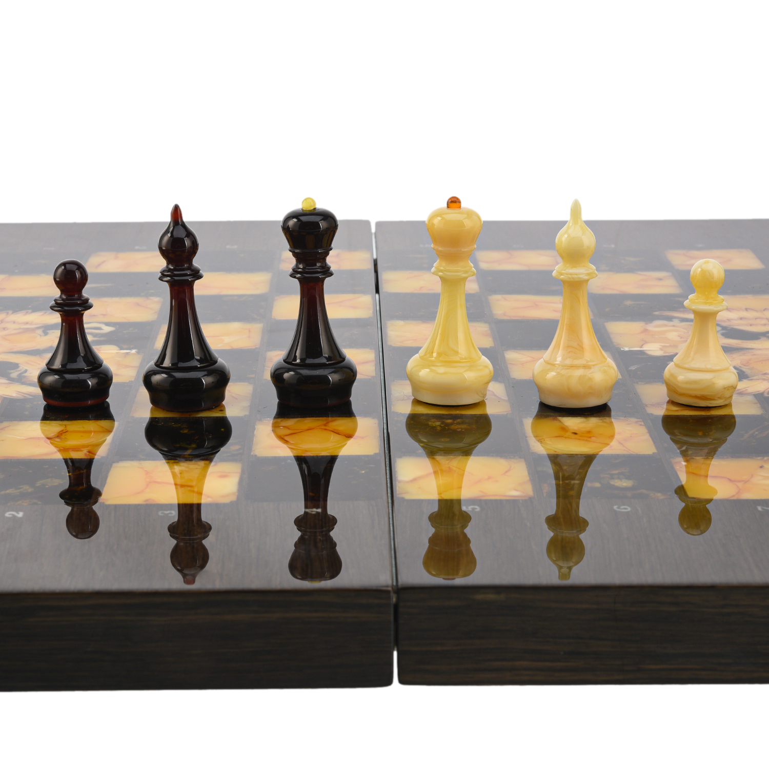 Шахматы с янтарными фигурами "Герб РФ".Материалы: мореный дуб, янтарь.