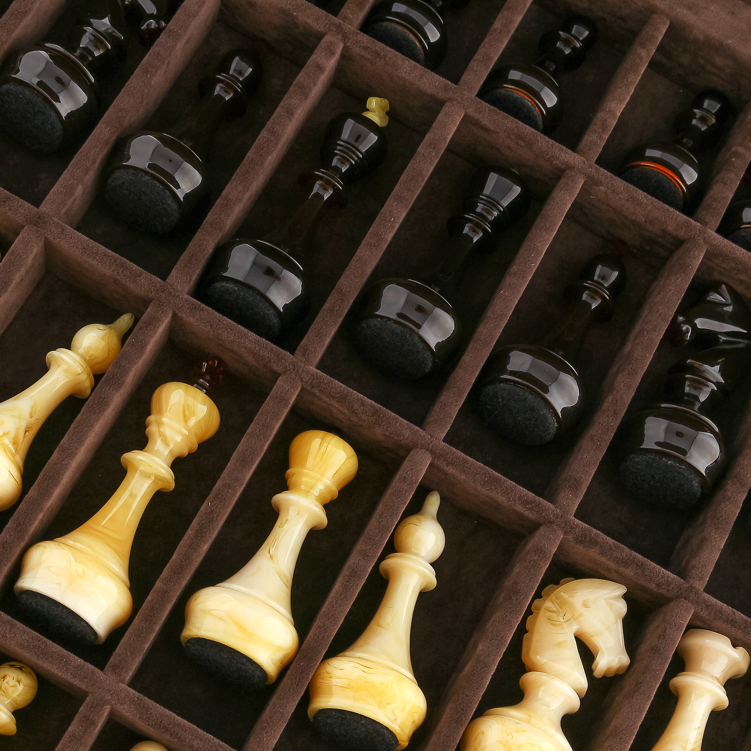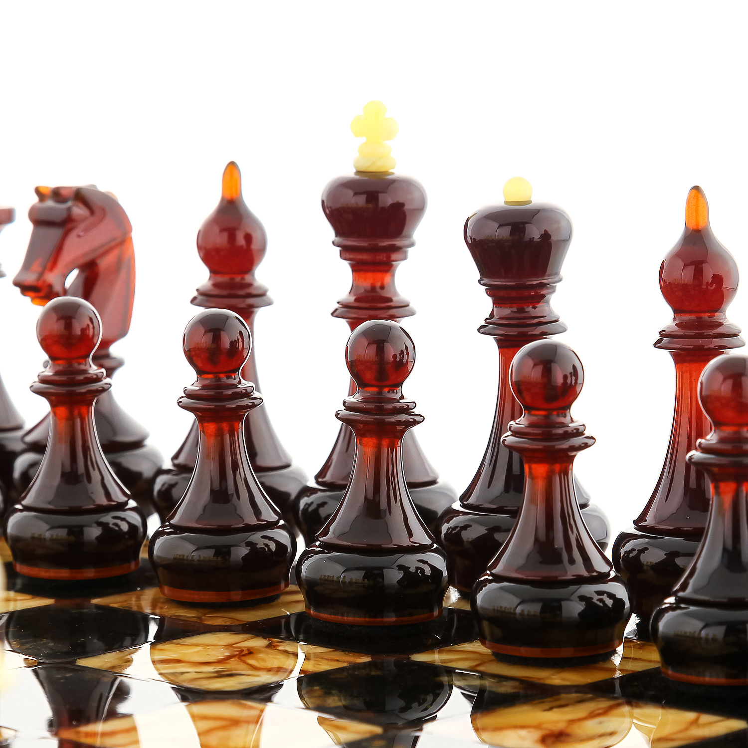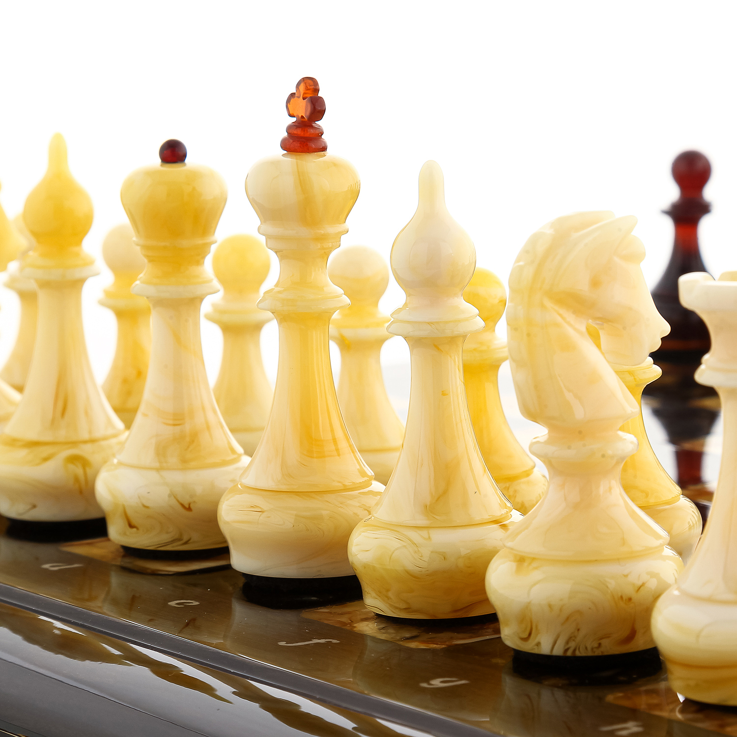 Искусство и роскошь в каждом ходе игры – это янтарные шахматы от МПФ Емельянов! Изысканные шахматы из натурального янтаря, созданные мастерами из Калининграда, не оставят равнодушным ни одного ценителя игры на доске. Каждая фигура – это настоящее произведение искусства, золото янтаря придаст вашей партии необыкновенный блеск и изысканность. Удивите своих соперников и станьте владельцем уникального комплекта янтарных шахмат от МПФ Емельянов! Деревянные шахматы из мореного дуба с янтарным полем и янтарными фигурами.