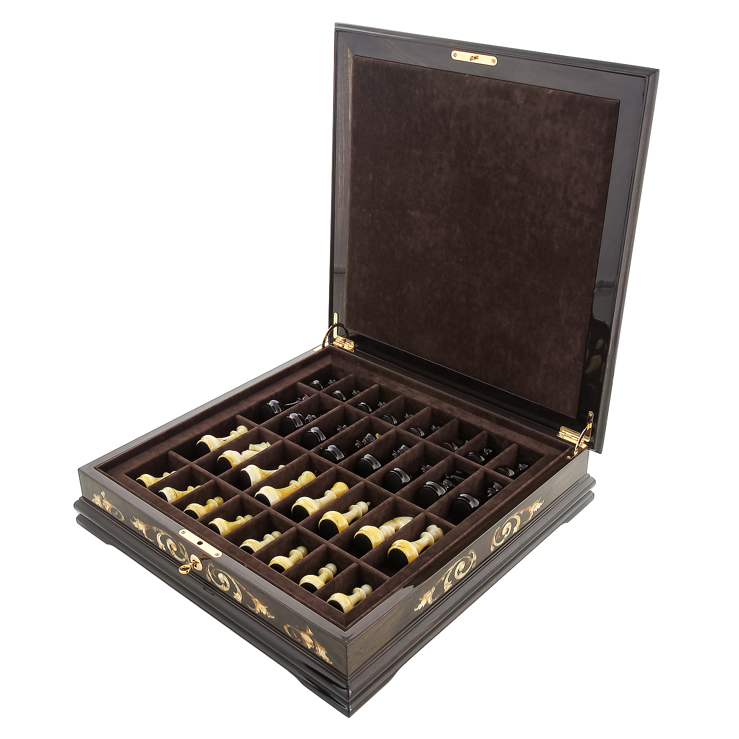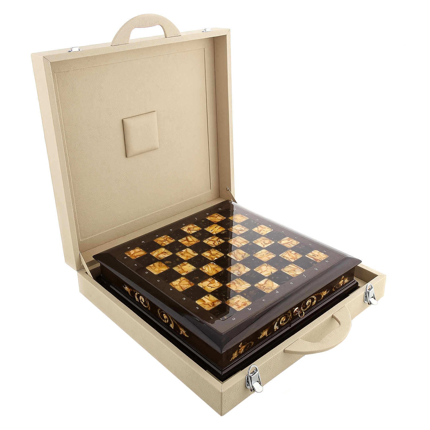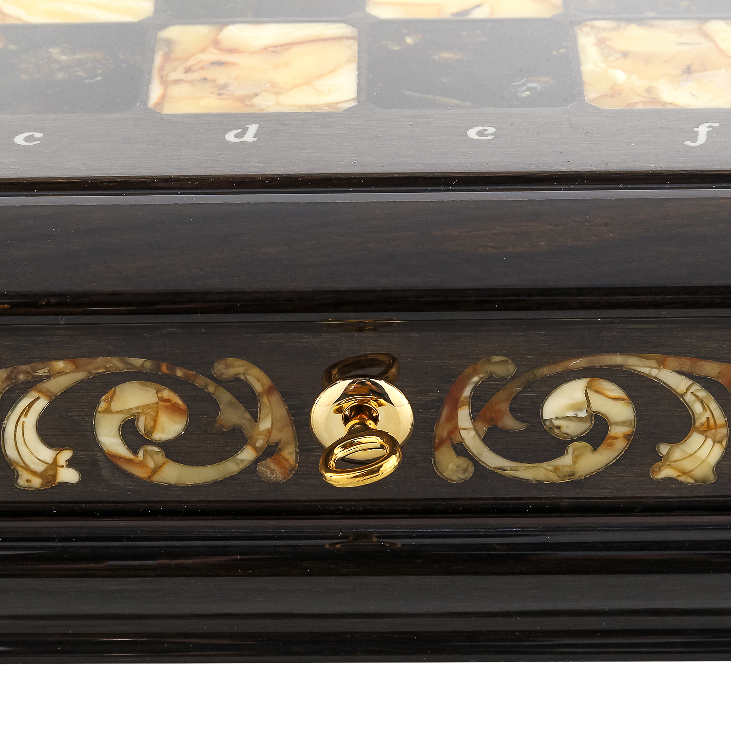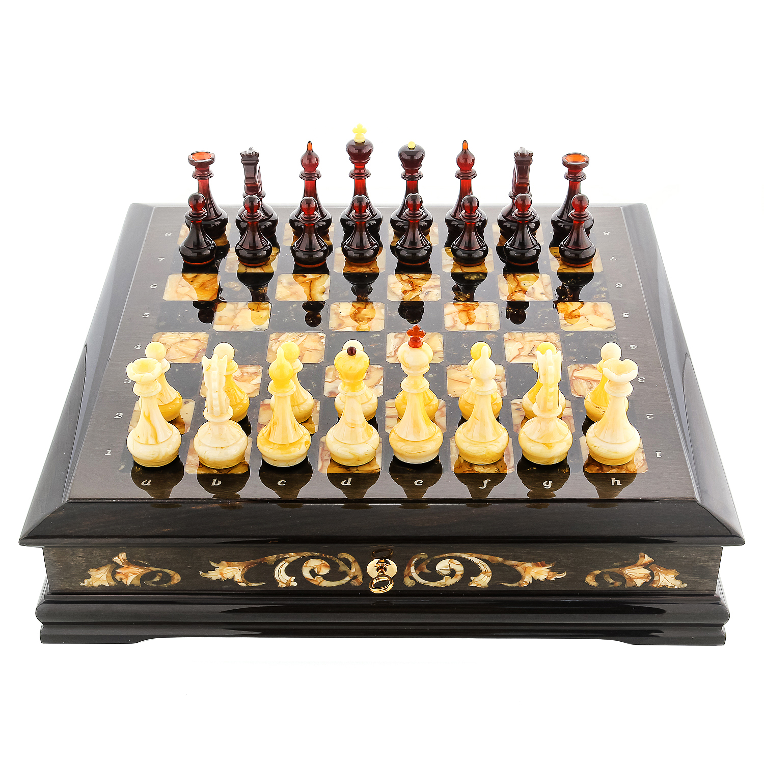 Шахматы из мореного дуба с инкрустацией и фигурами из янтаря 45,5х45,5 см