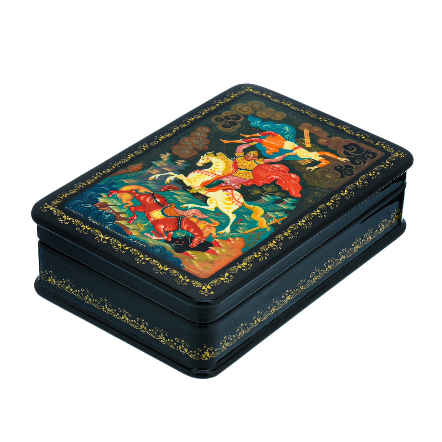 Шкатулка с художественной росписью "Поединок Рогдая с Фарлафом".Материалы: папье-маше, краски, лак.