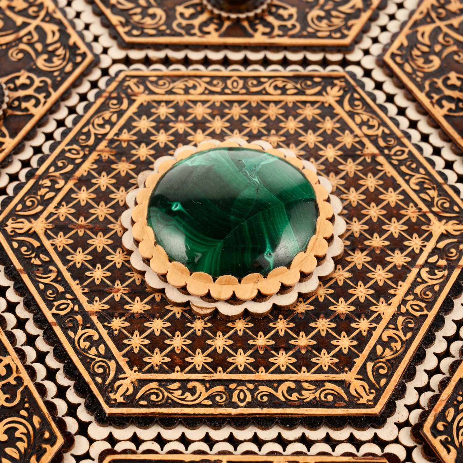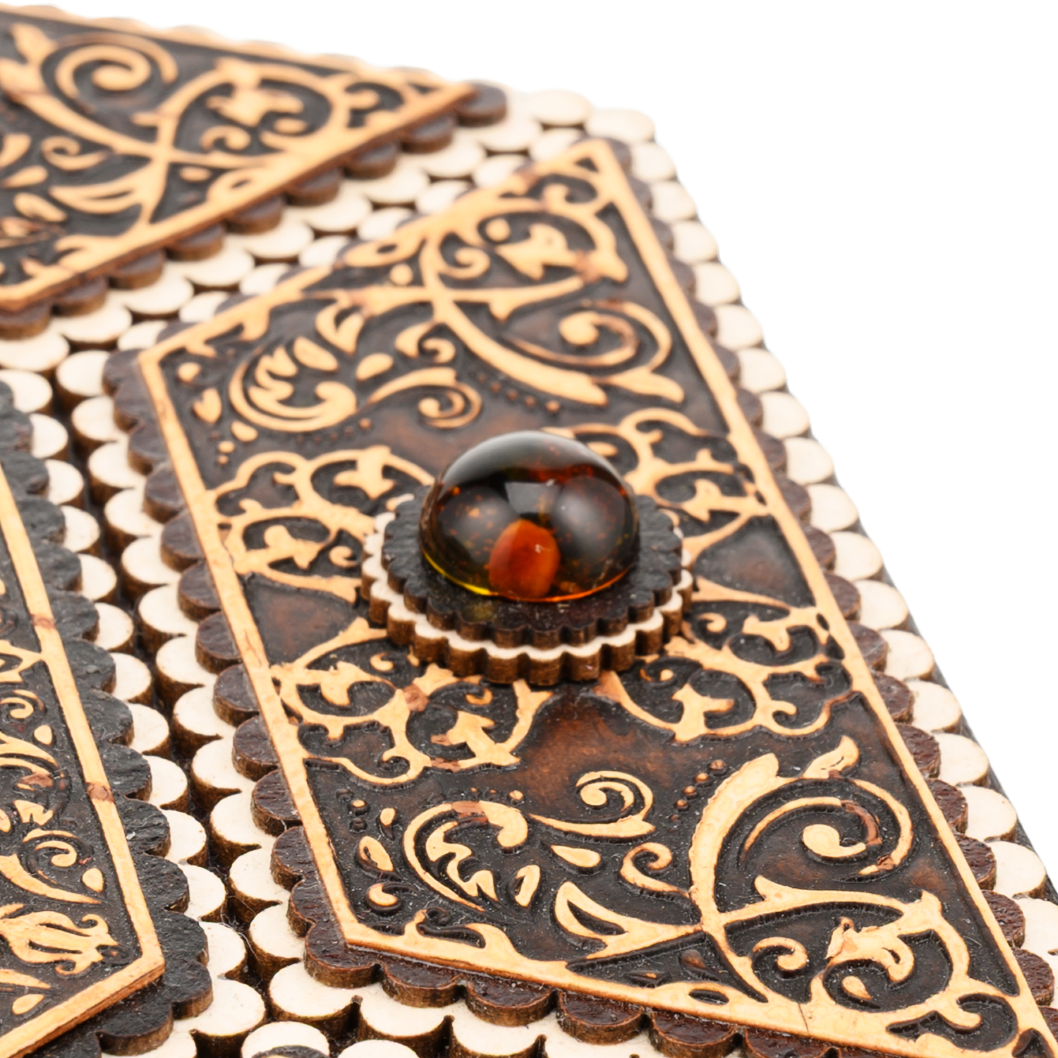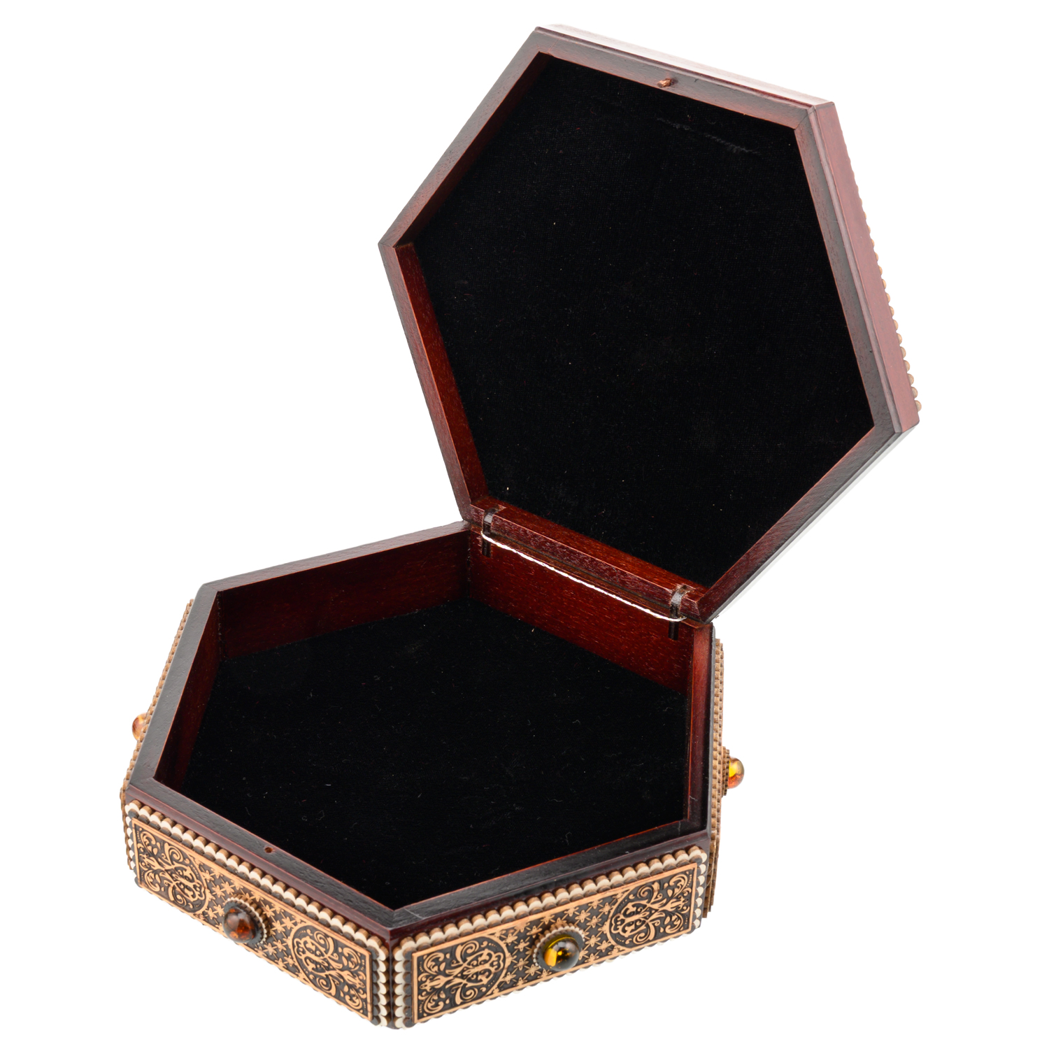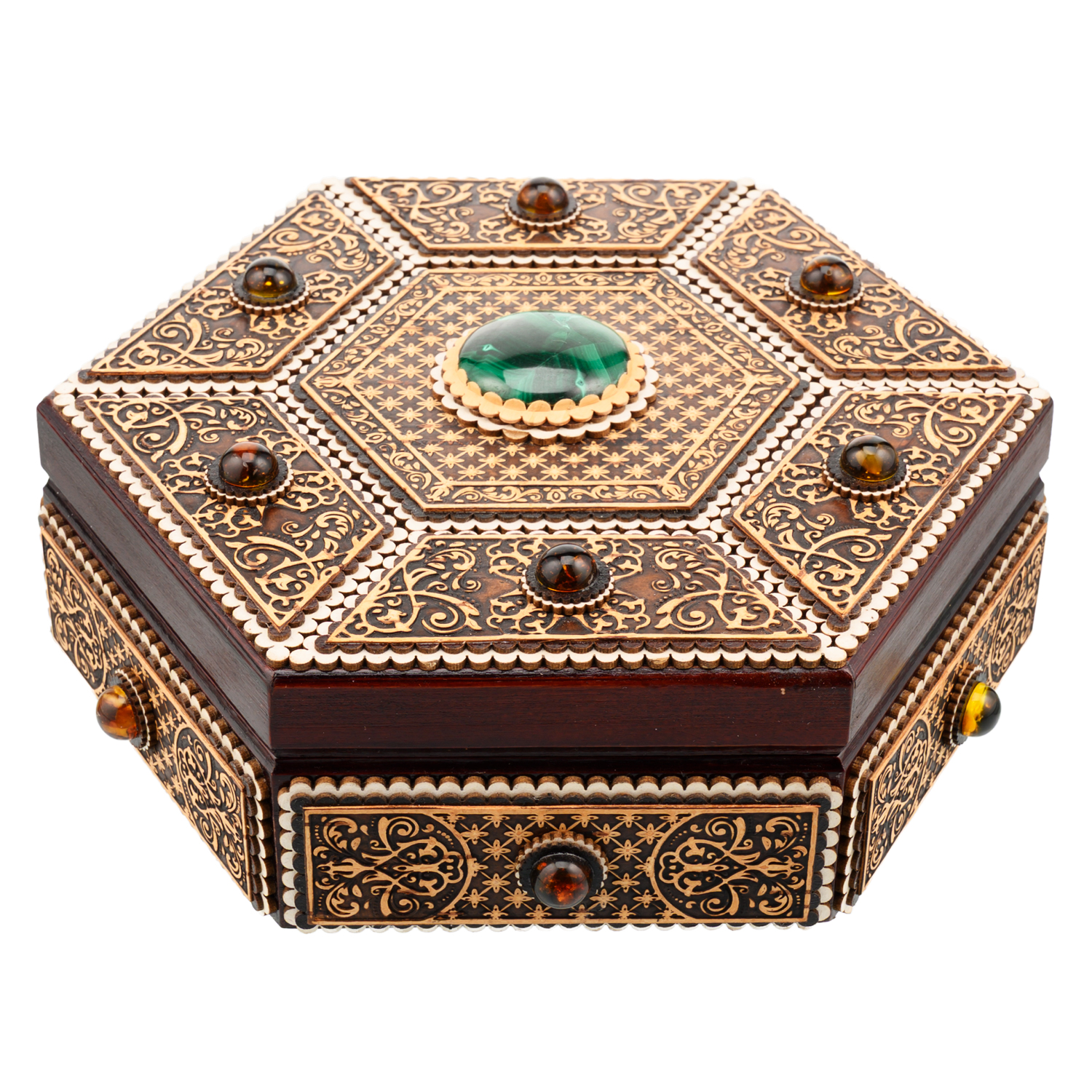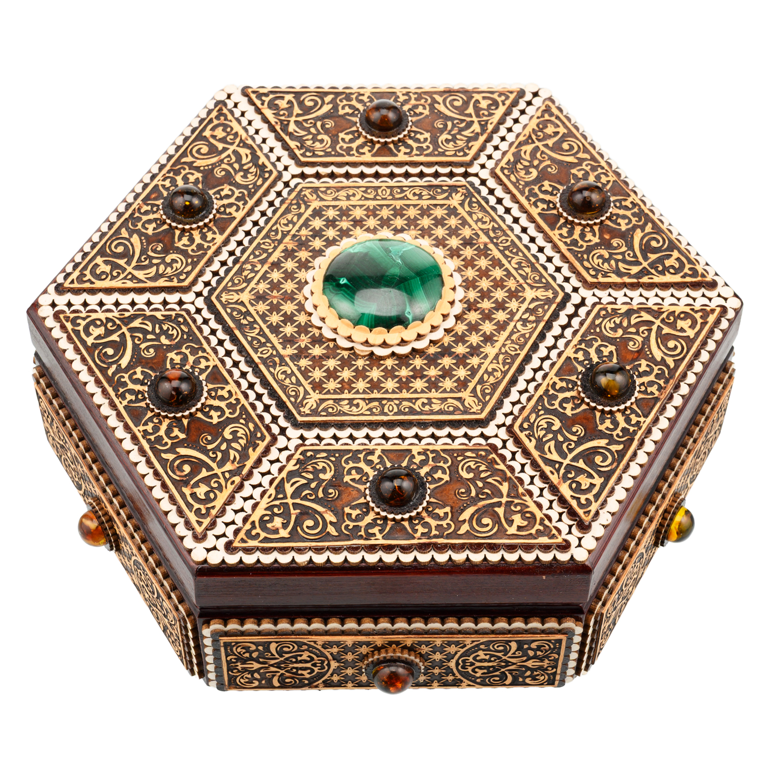 Шкатулка шестиугольная из бересты с янтарем и малахитом