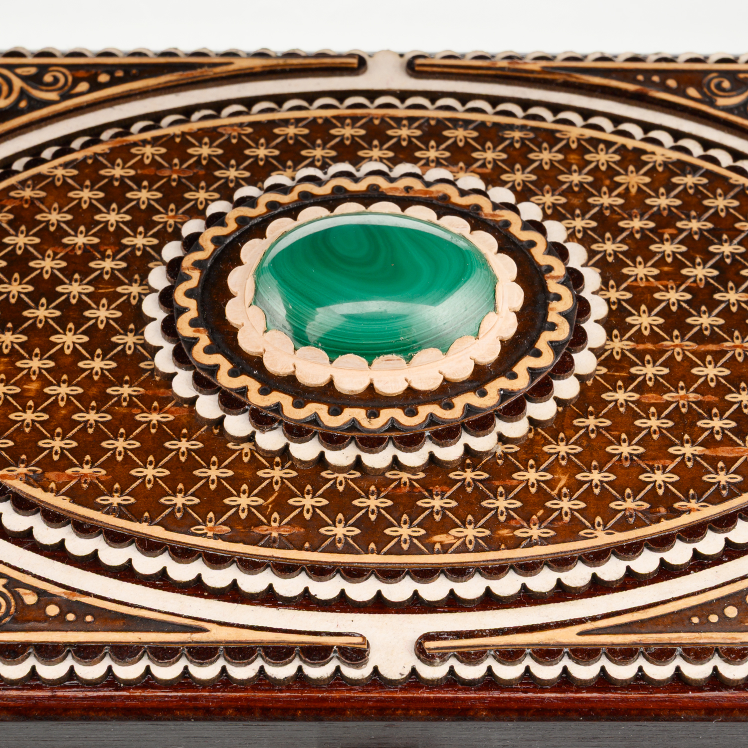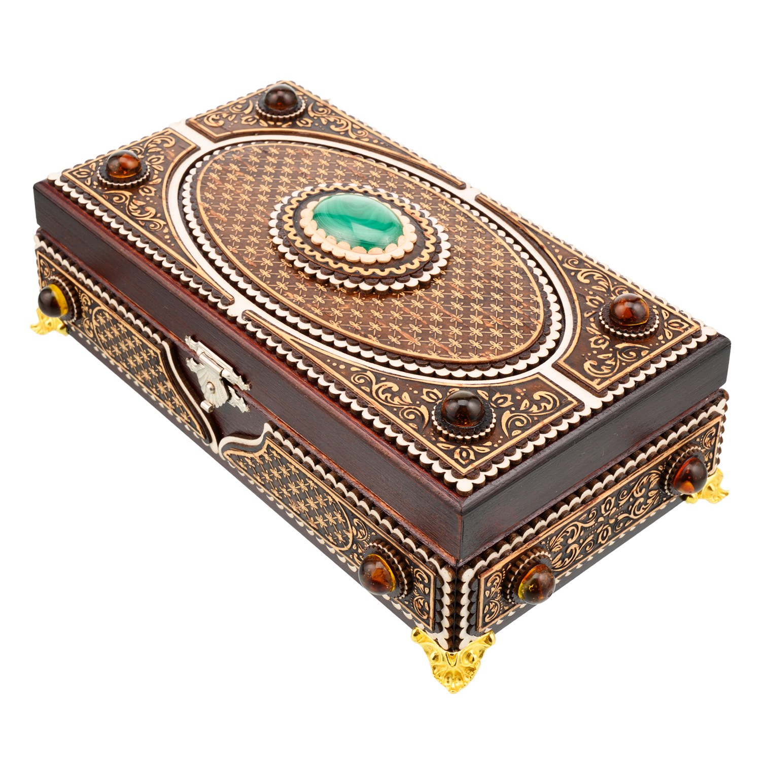 Шкатулка прямоугольная из бересты с янтарем и малахитом