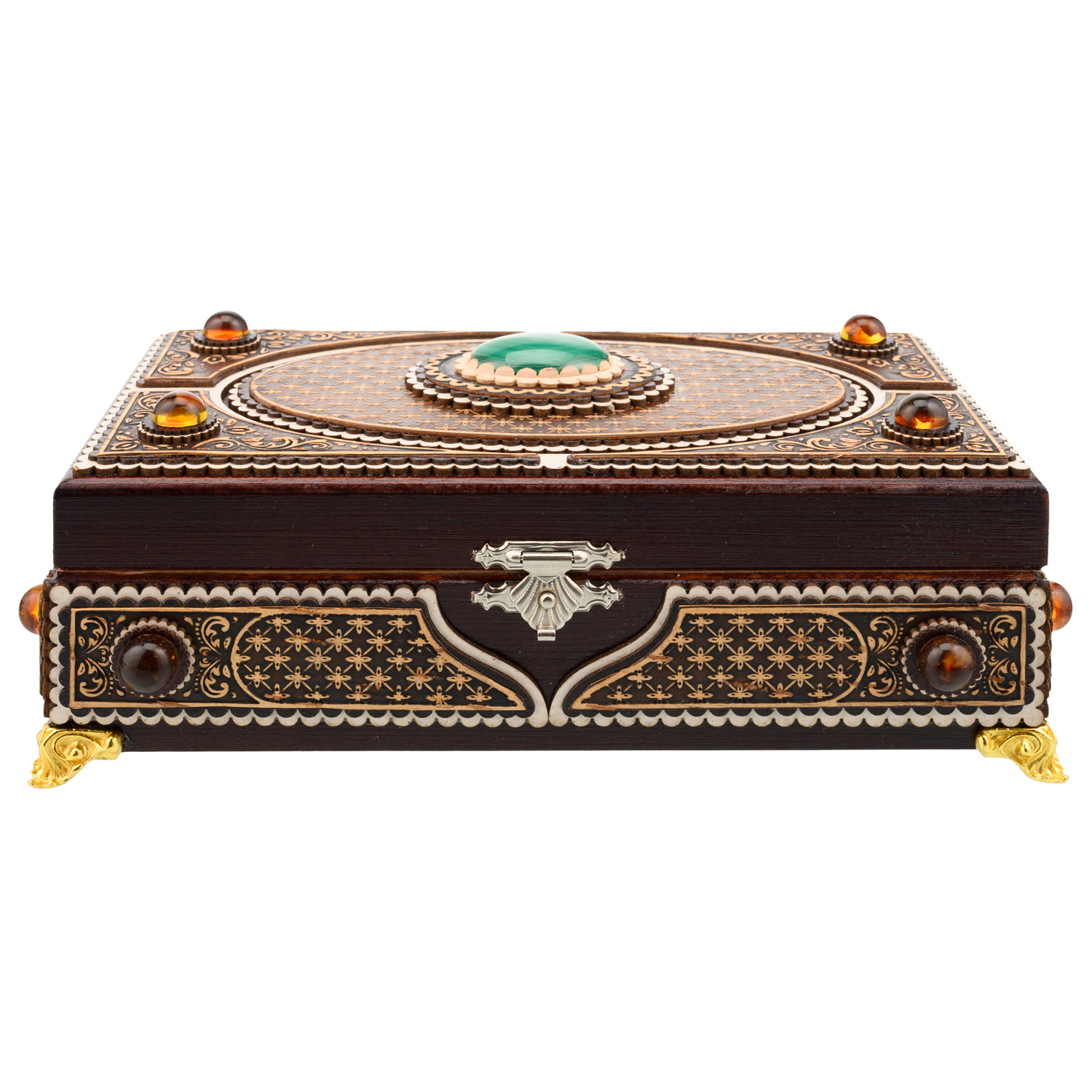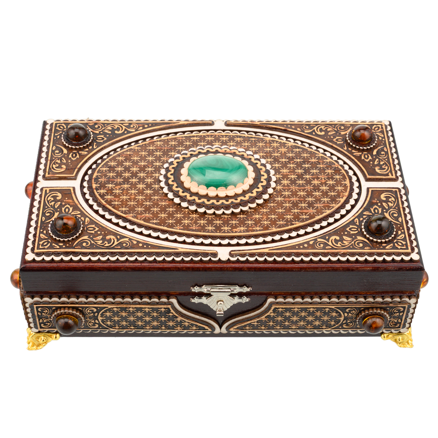 Русские подарки и сувениры → Шкатулки → Шкатулки из бересты → Шкатулка прямоугольная из бересты с янтарем и малахитом