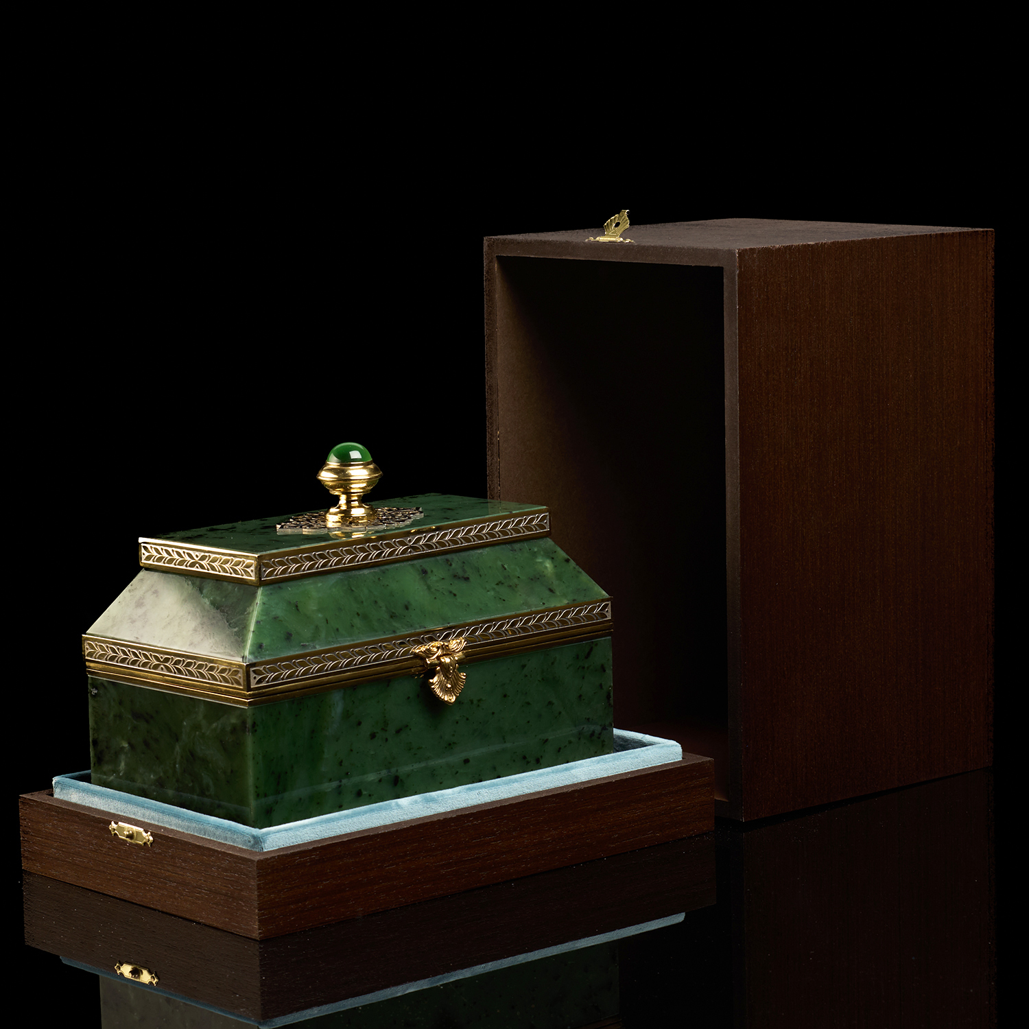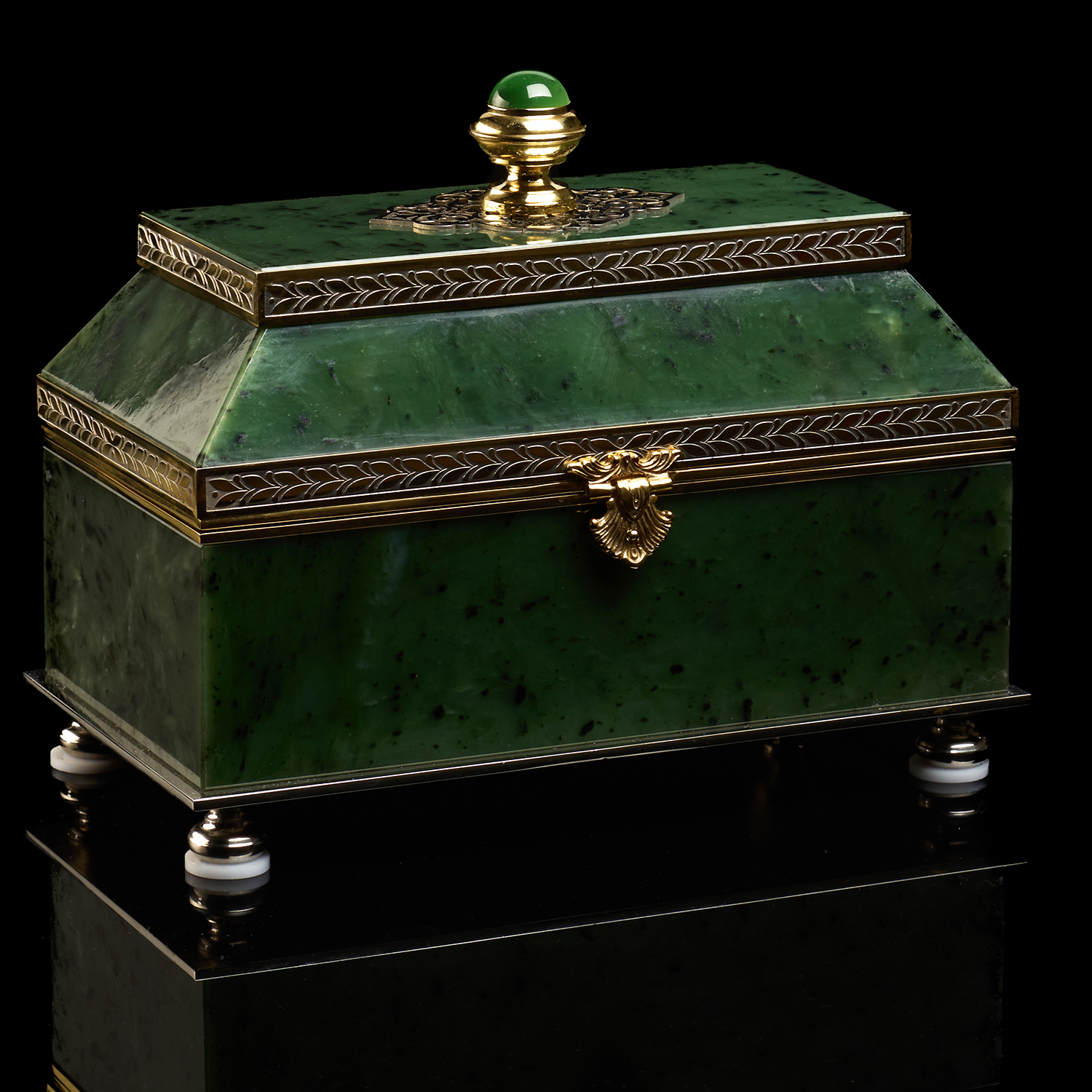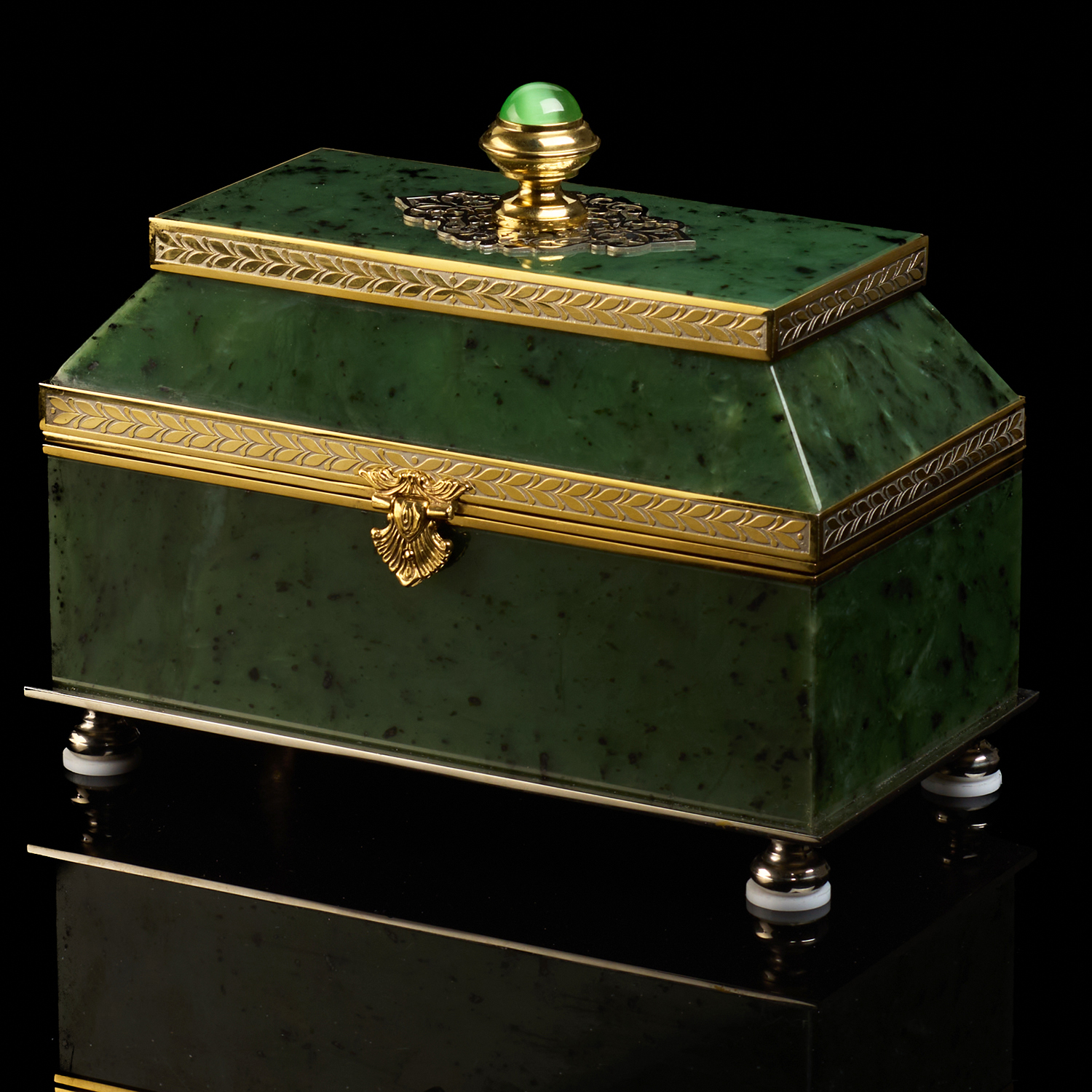 Шкатулка-ларец из нефрита "Сказка". Златоуст.Материалы: латунь, никель, золото 999,9*, нефрит.